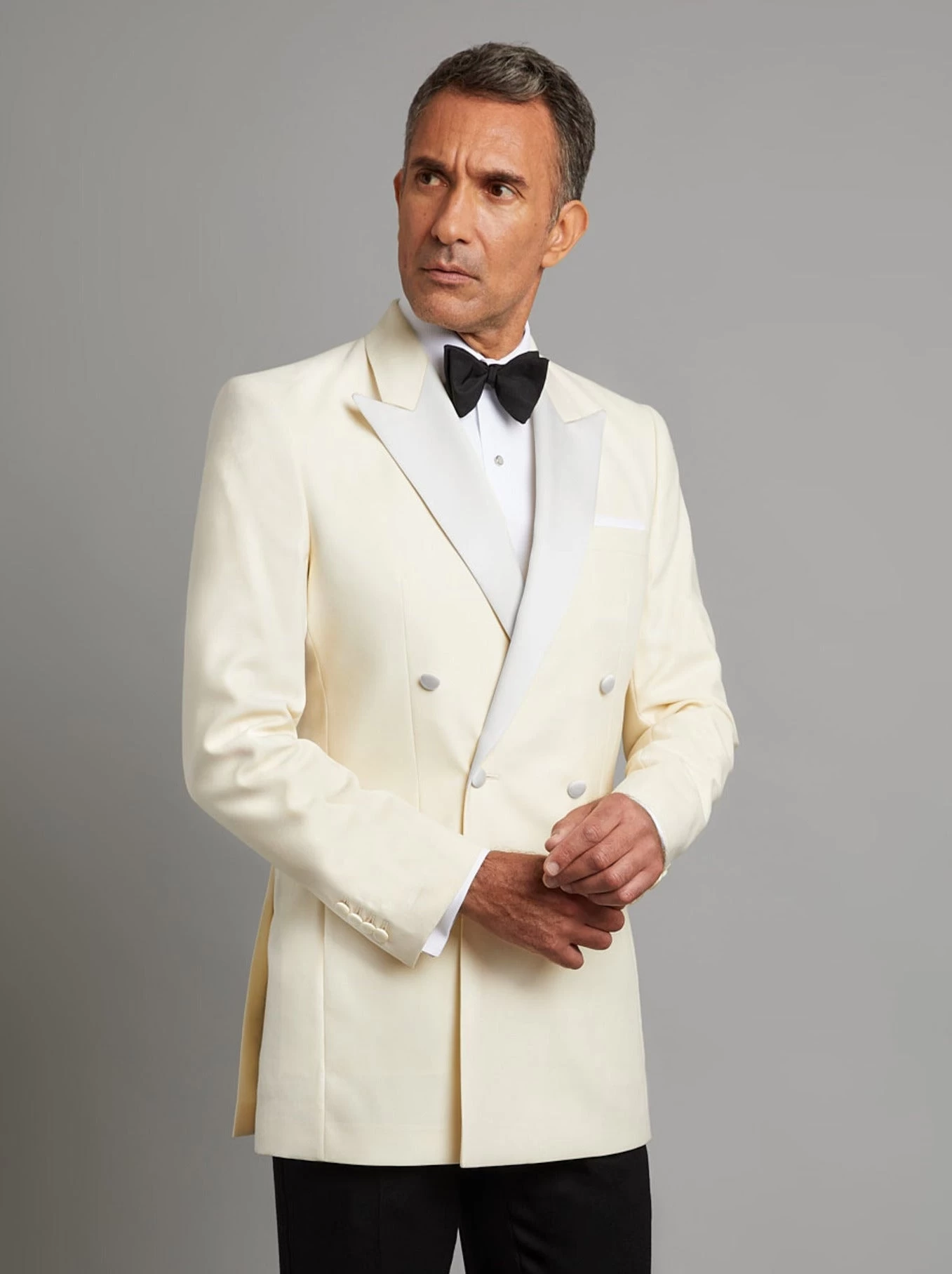 This Beaufort Dinner Jacket is made from luxurious wool and features a double breasted front, contrasting white satin peak lapel, double jetted pockets and 4 button working cuff. With structured shoulders and a classic fit, this piece has a has a timeless appeal.