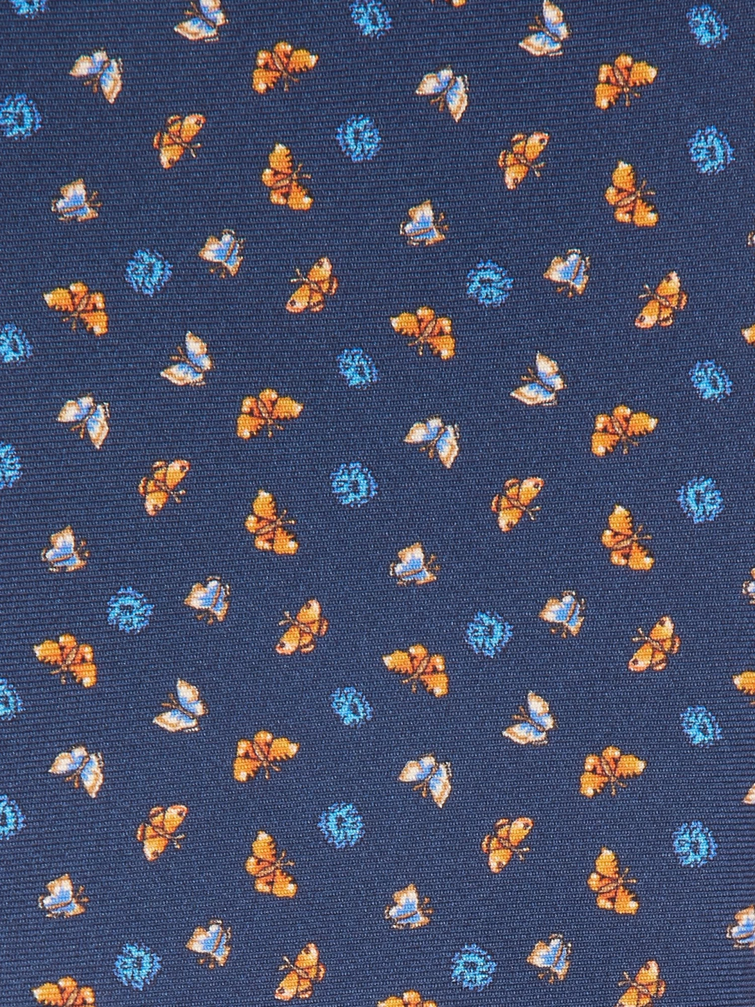 Complete the look with this woven silk tie featuring a butterfly pattern in navy. Made with the highest craftsmanship and attention to detail, it’s the perfect accessory for any formal or special occasion, guaranteed to add a touch of elegance and personality to your outfit.