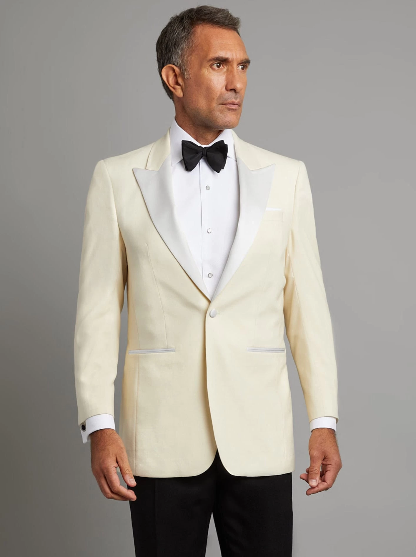 This Carlyle Dinner Jacket in Ivory is made from luxurious wool and features a single button front, contrasting white satin peak lapel, double jetted pockets and four button working cuff. With structured shoulders and a classic fit, this piece has a has a timeless appeal.