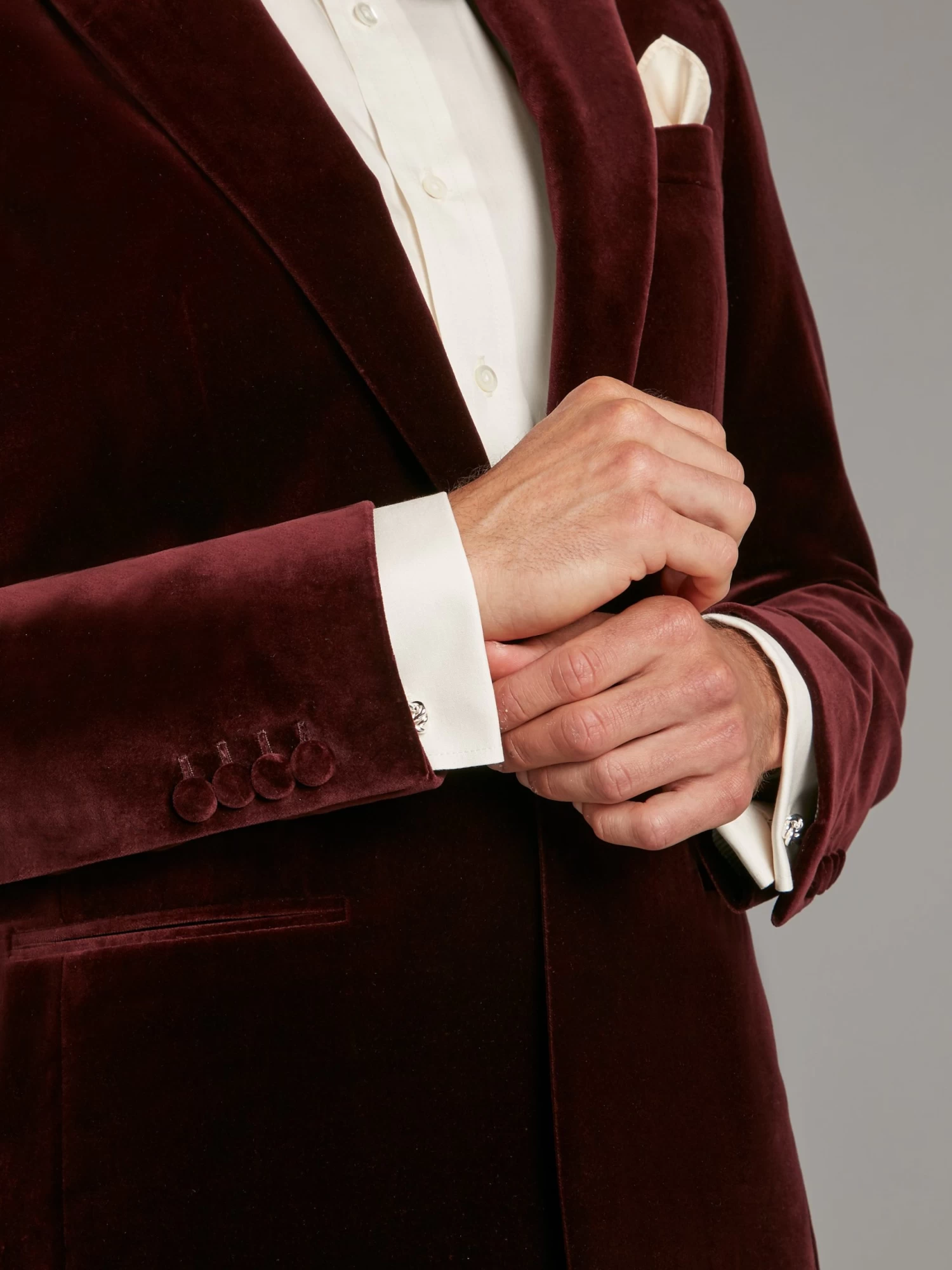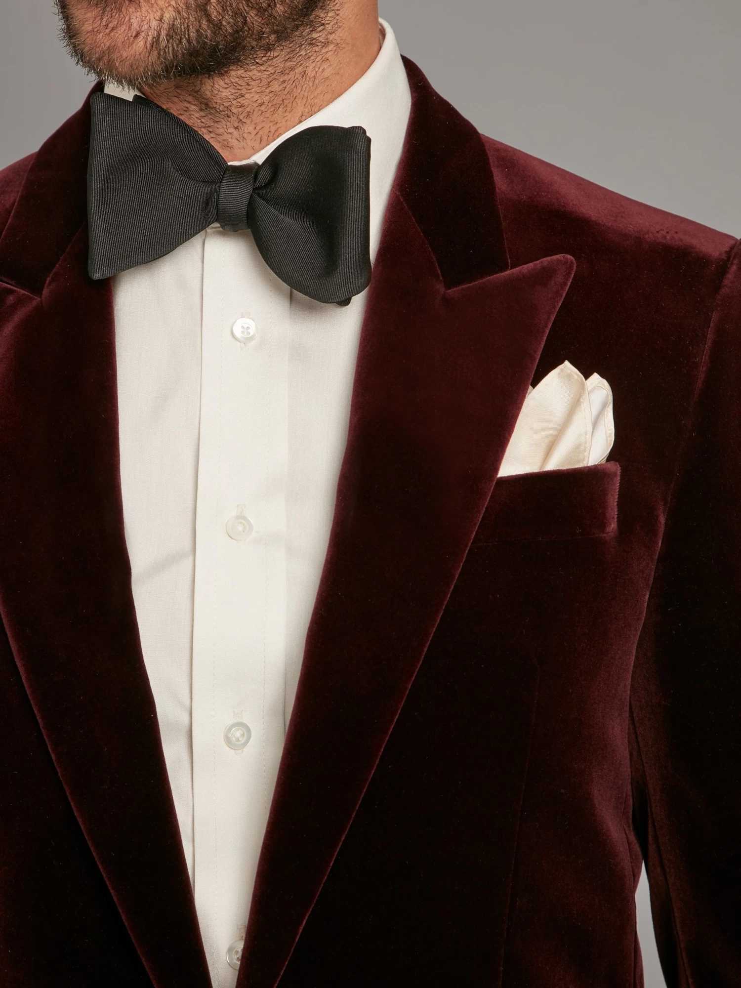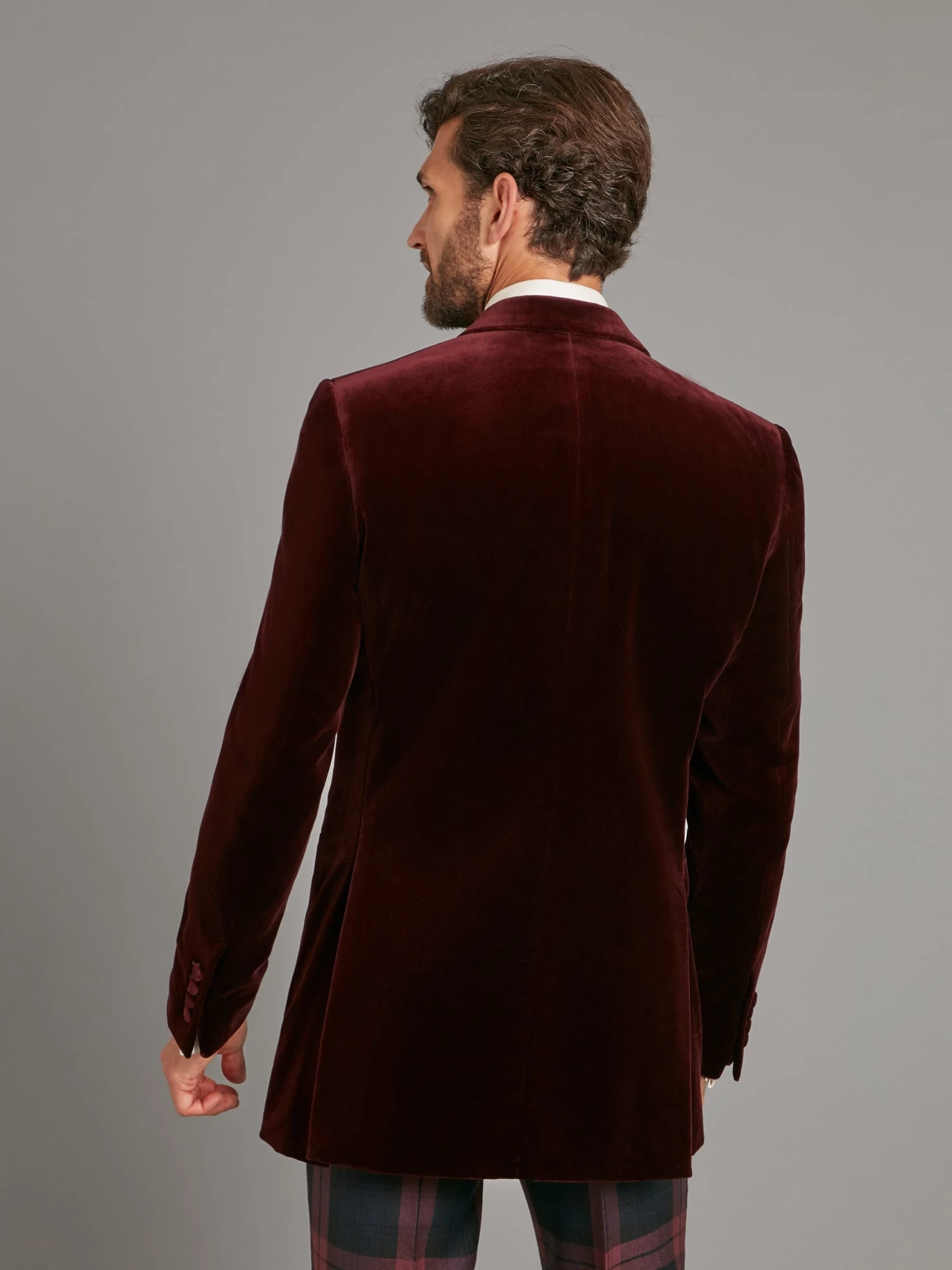 Celebrating Oliver Brown’s 25th anniversary Chelsea style, this Carlyle smoking jacket in a stunning wine hue is accentuated by its luxurious velvet fabric and sharp tailoring, featuring a peak lapel and single button closure.