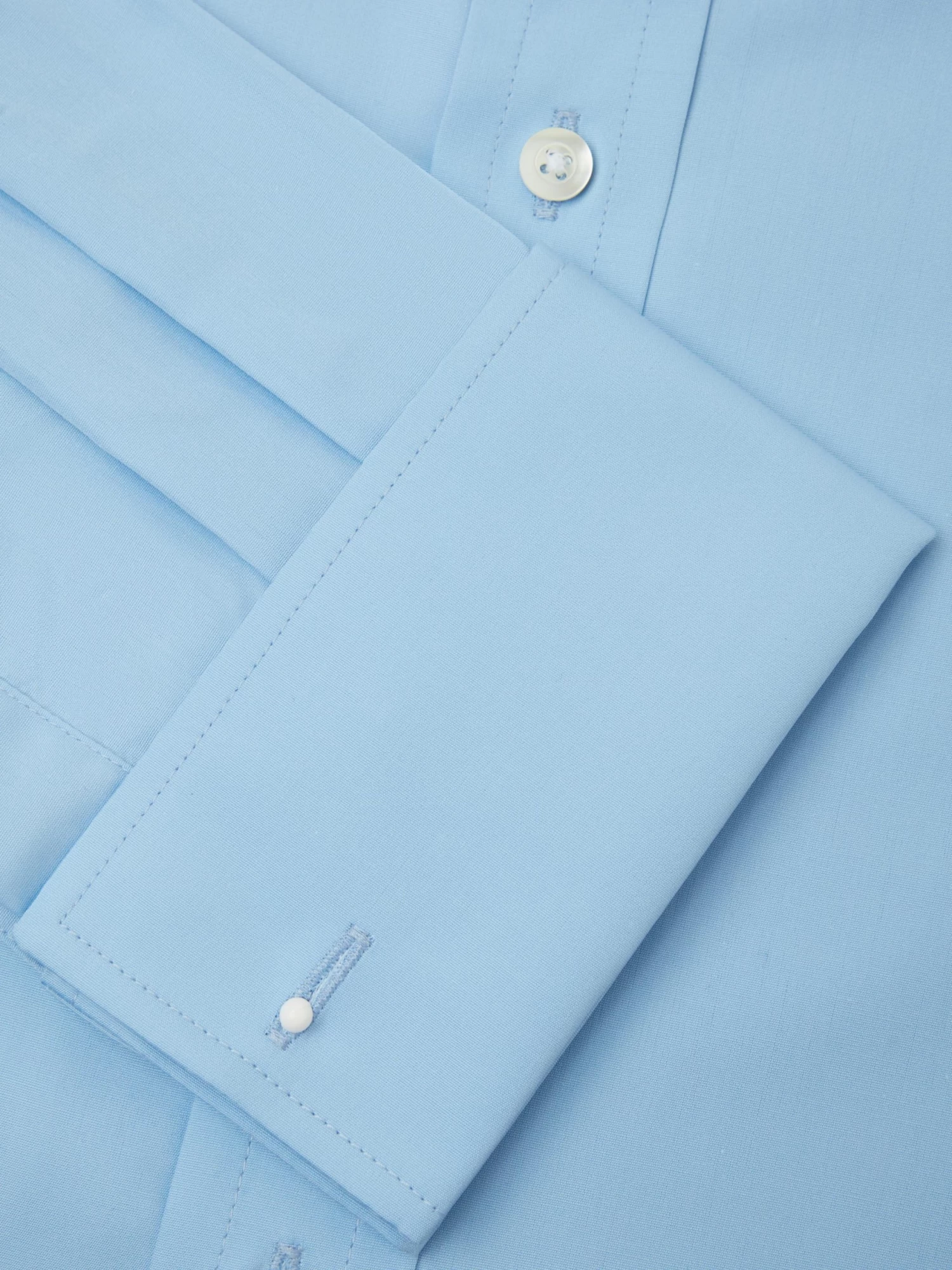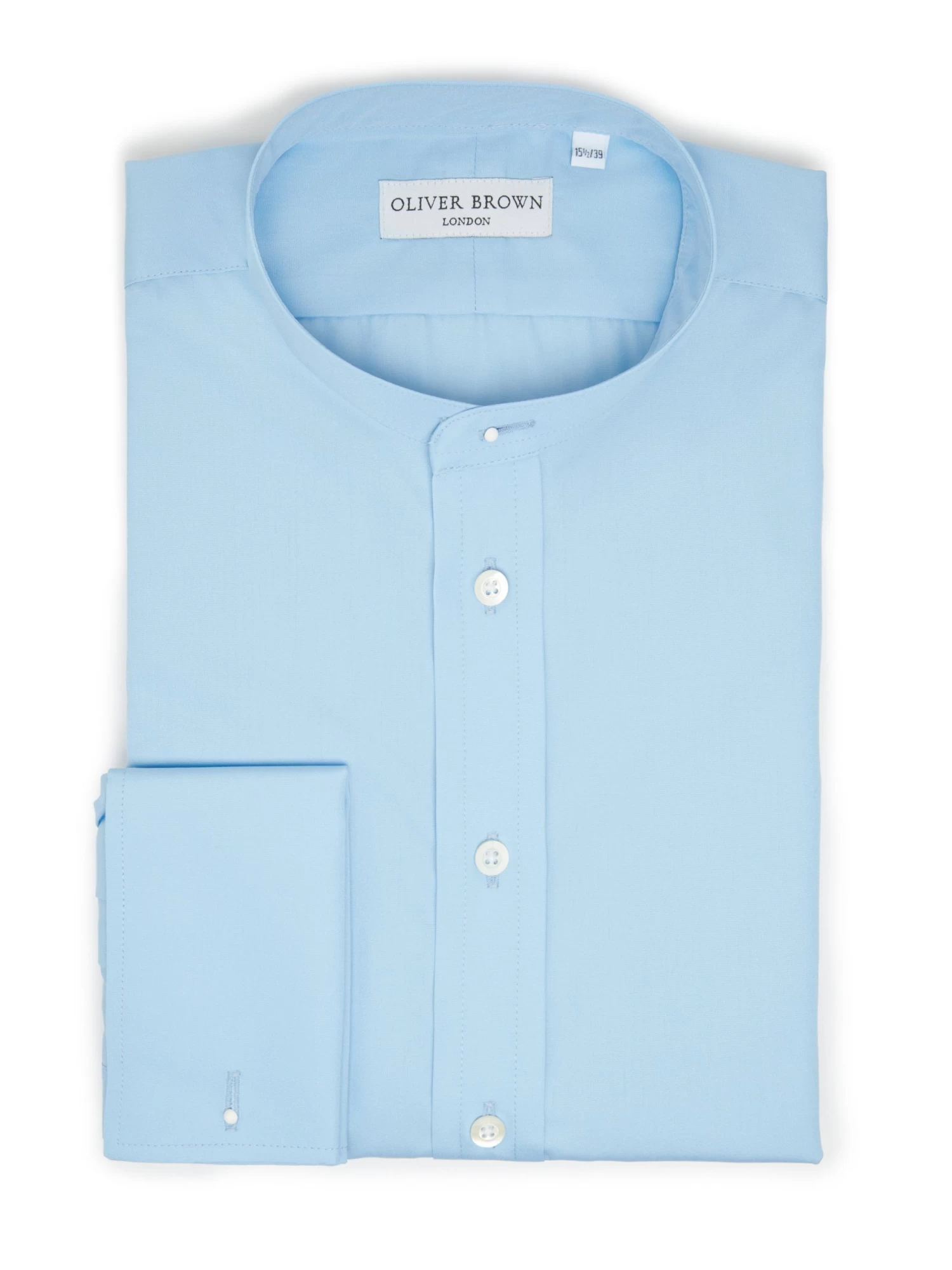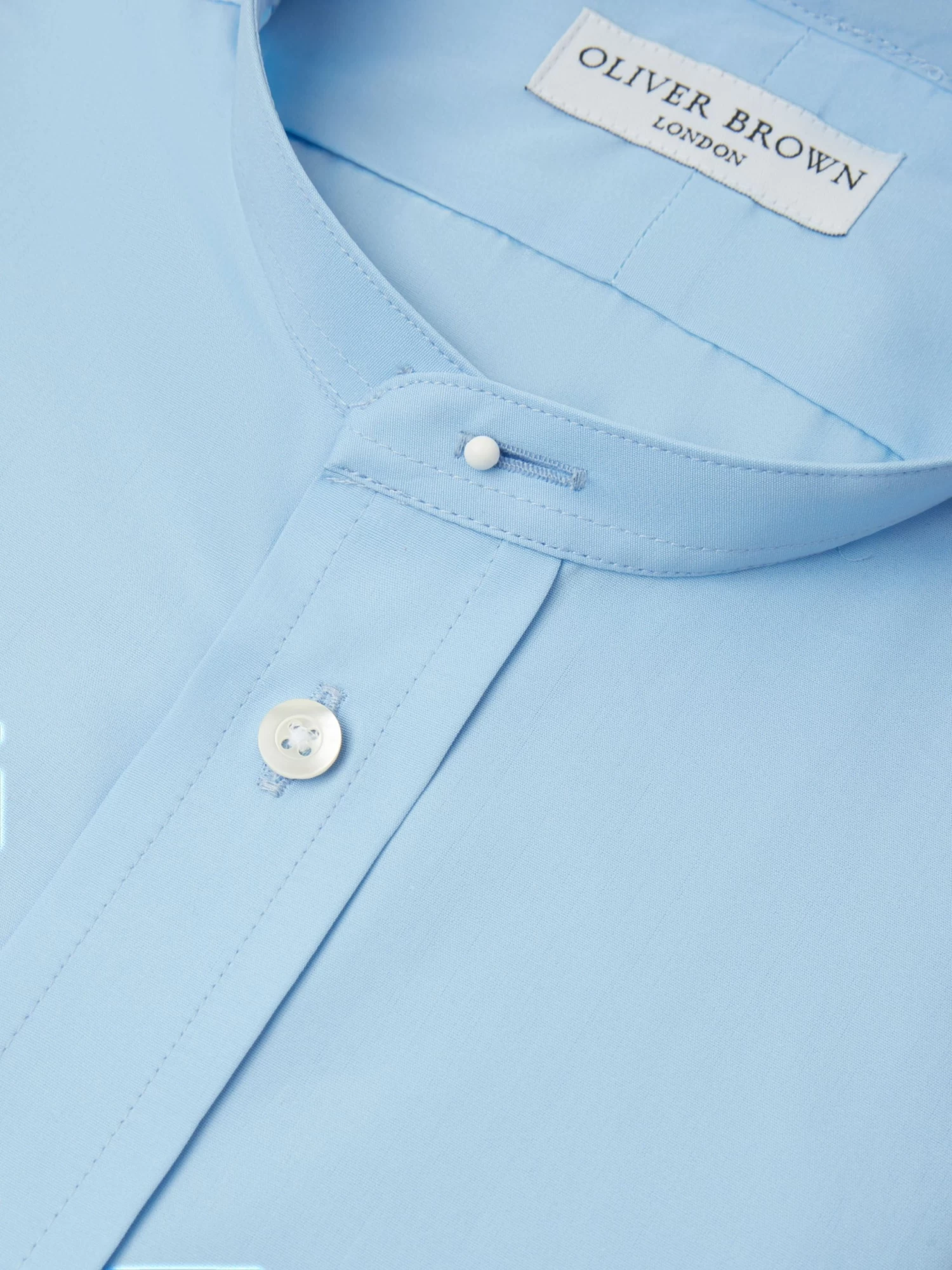 These collarless shirts in blue are fully hand made in England from two-fold pure cotton with Marcella cotton cuffs, and bib fronts. They feature a Jermyn Street cut which gives a comfortable and generous fit across the shoulders and body. Wear with a stiff collar, perfect for morning dress or with business attire