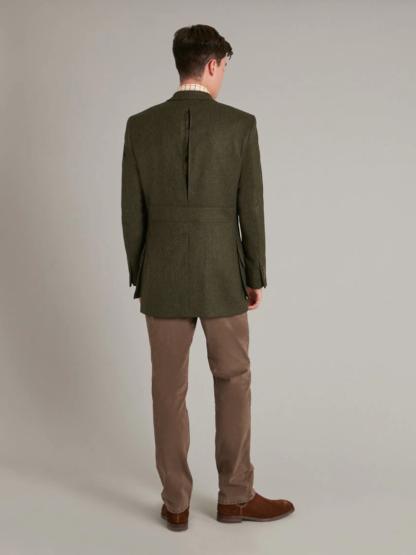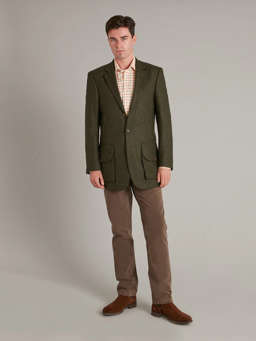 This country jacket in brown, crafted from one of our classic tweeds, features a smart storm collar, patch pockets, and a three-button closure. It can be paired with matching tweed trousers for days in the field or any of our jeans for a more casual weekend look. An exceptionally functional but stylish jacket for country pursuits.Â