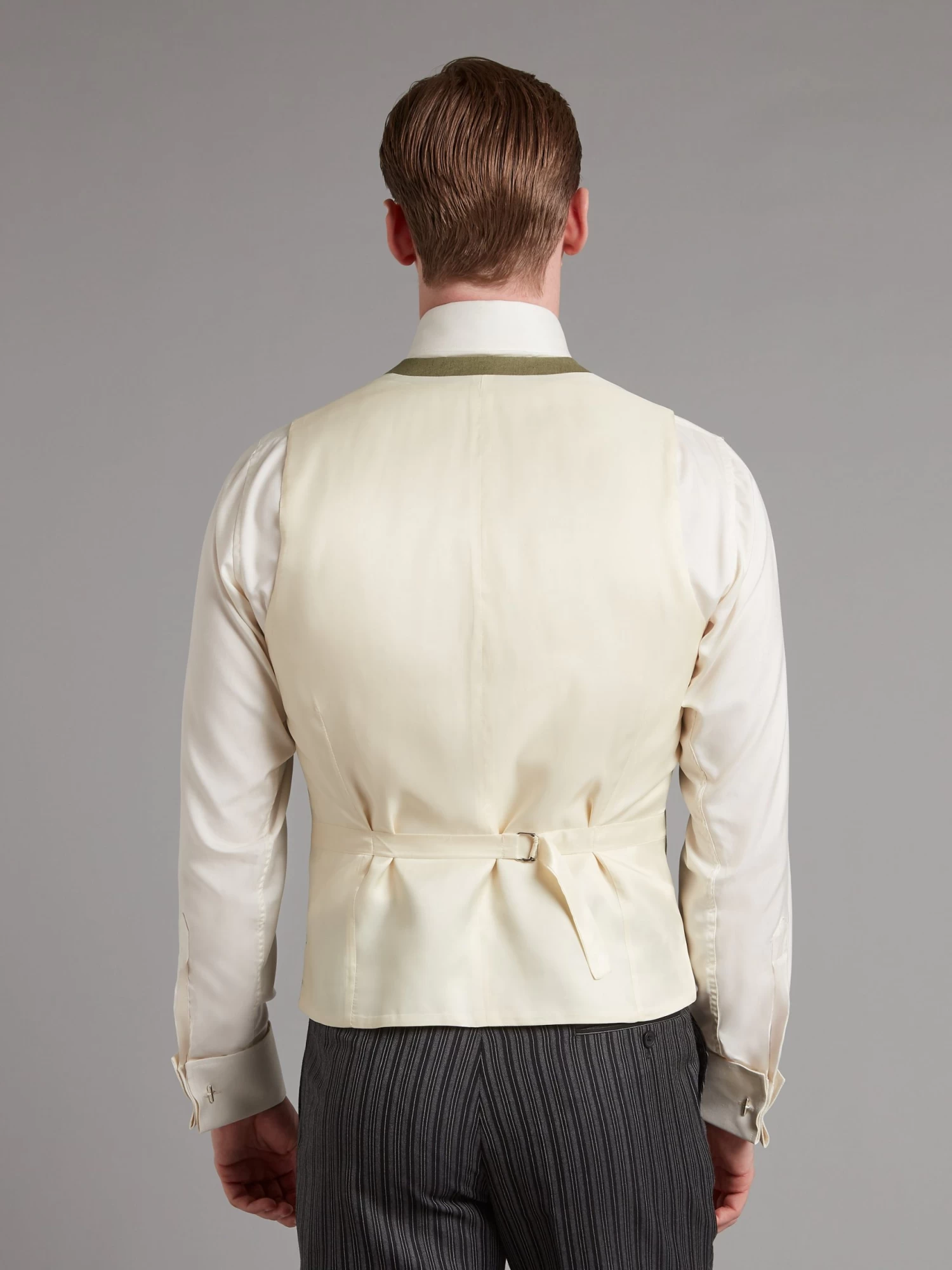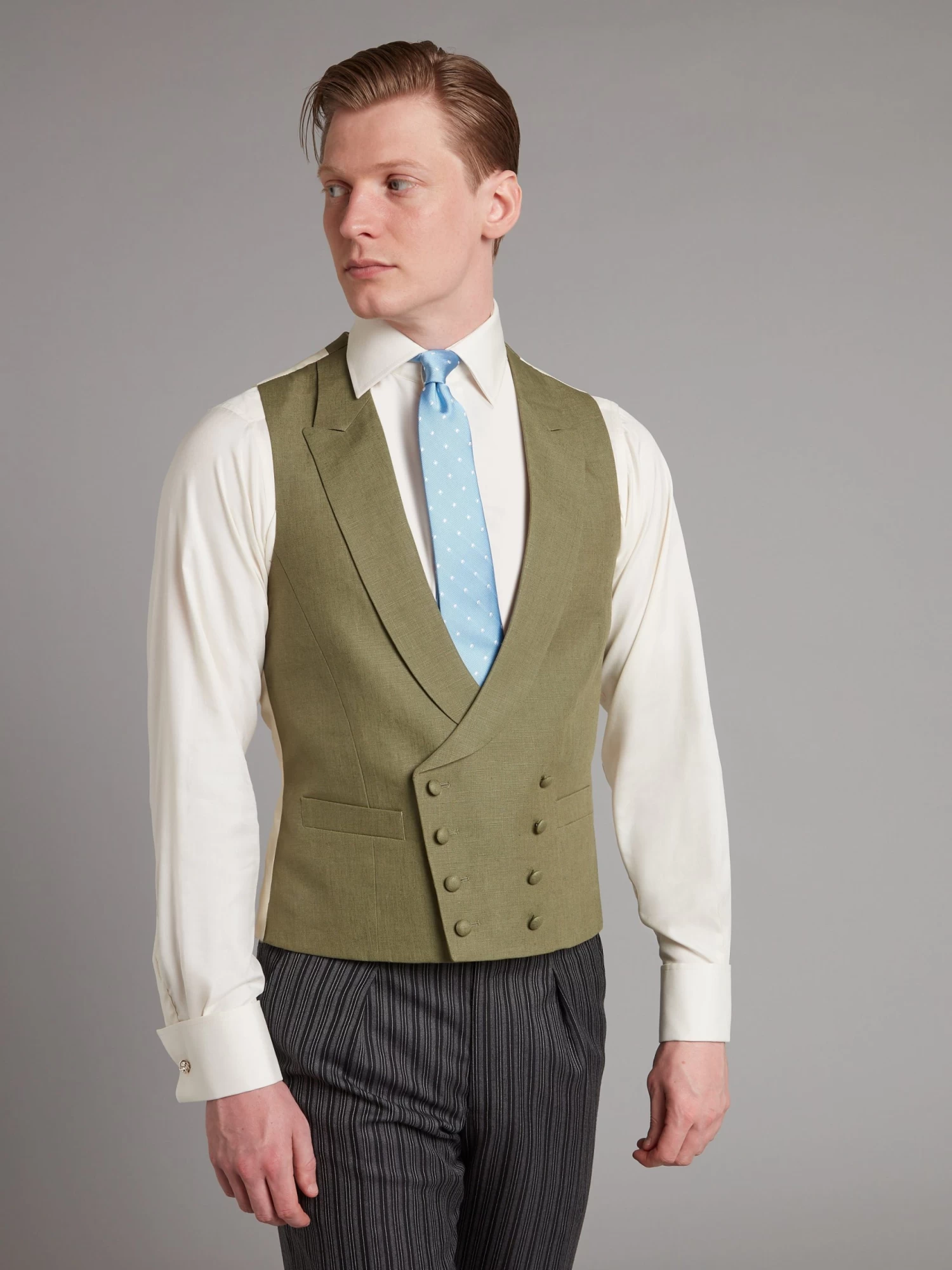 This linen waistcoat in sage green is classically cut; it features a shawl lapel, double breasted front, off-white satin back-panel and traditional waist adjuster. Available in a palette of stylish, muted shades, perfect for a summer wedding or Royal Ascot.