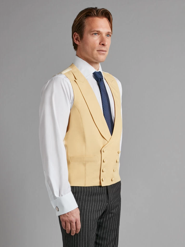 Tailored from the Oliver Brown double-breasted block for a “classic-fitted” cut, this yellow linen waistcoat is a stalwart of traditional morning wear and is available in a palette of stylish, muted shades.