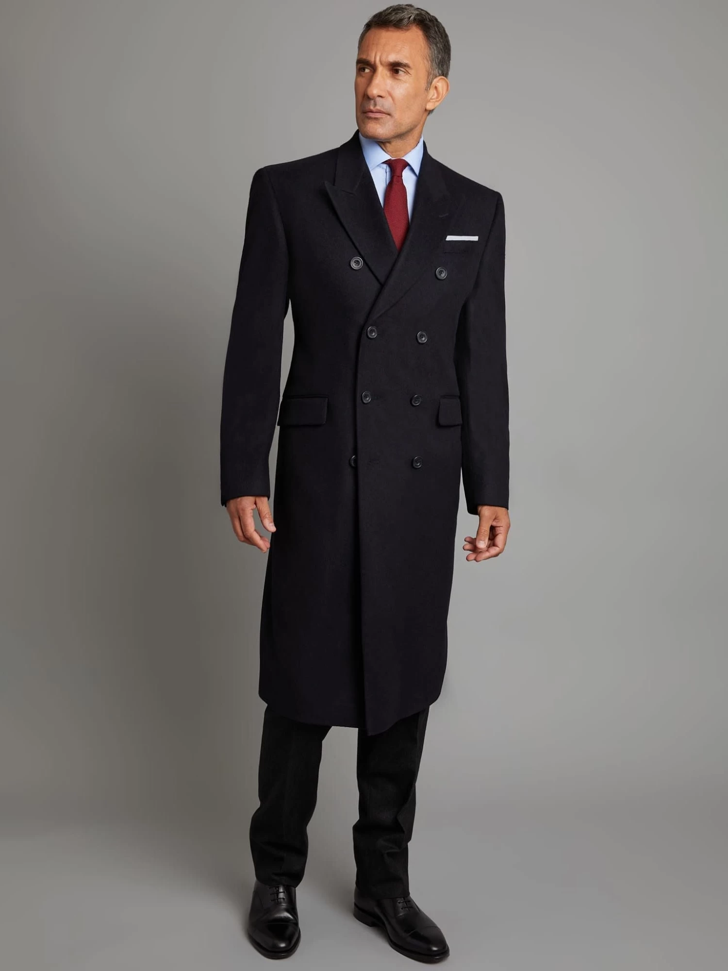 Oliver Brown overcoats are crafted from a cashmere/wool blend, sourced in Yorkshire. Impeccably smart, fully lined and designed with working cuffs and pockets. This traditional cut double-breasted style, in a navy cashmere blend, is designed for a comfortable fit over a suit.
