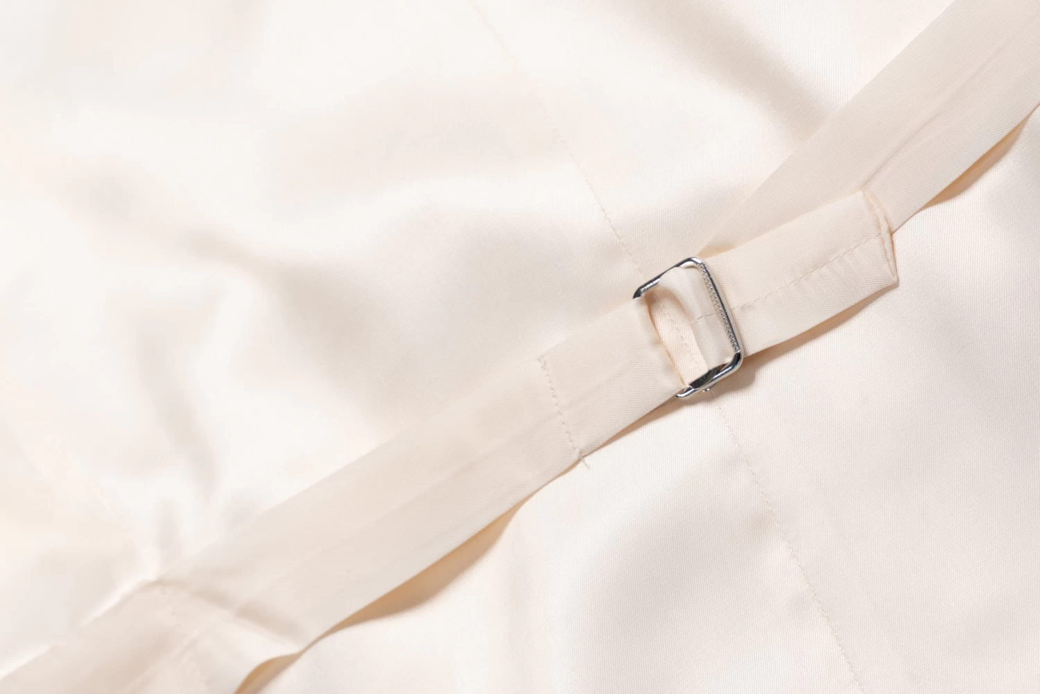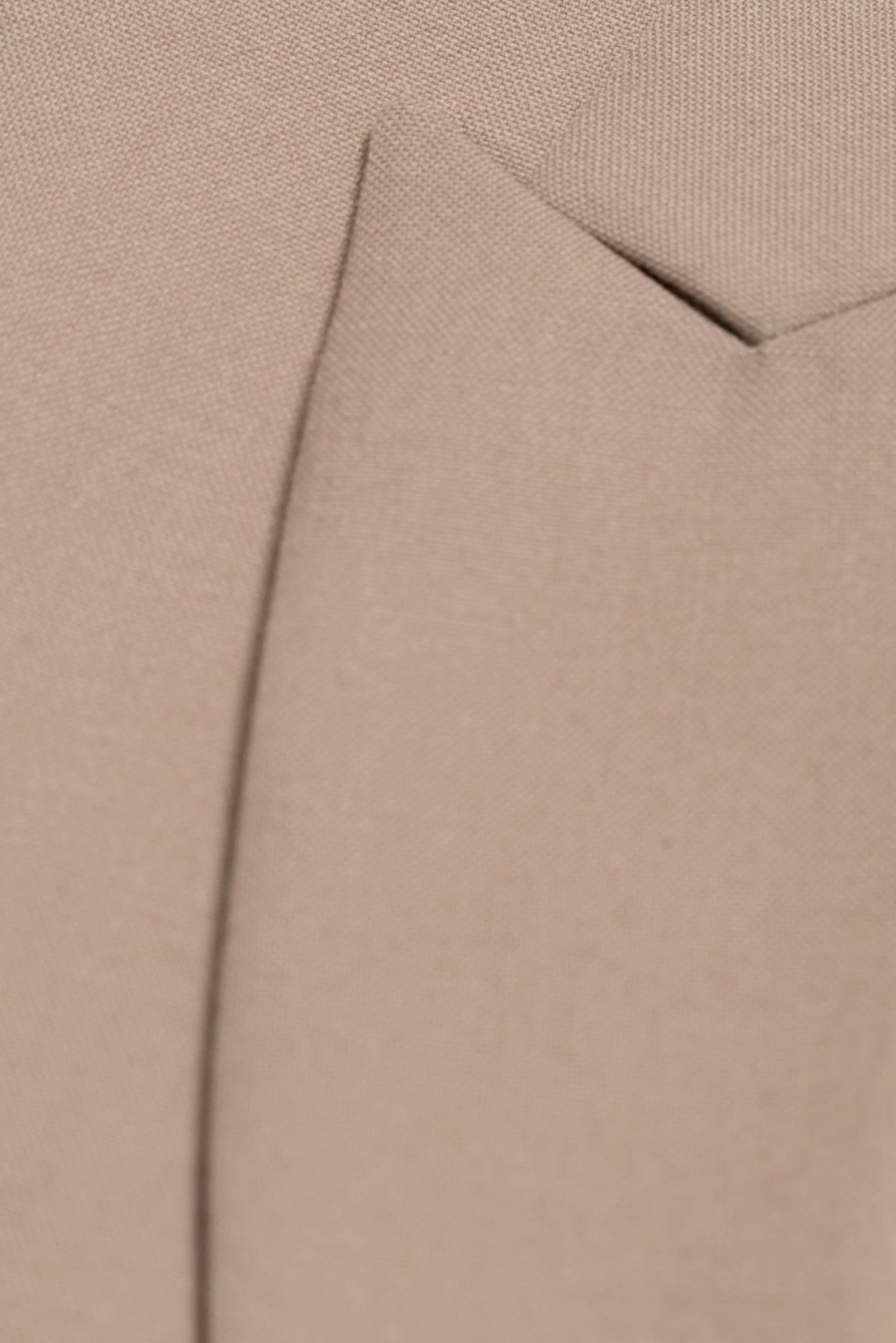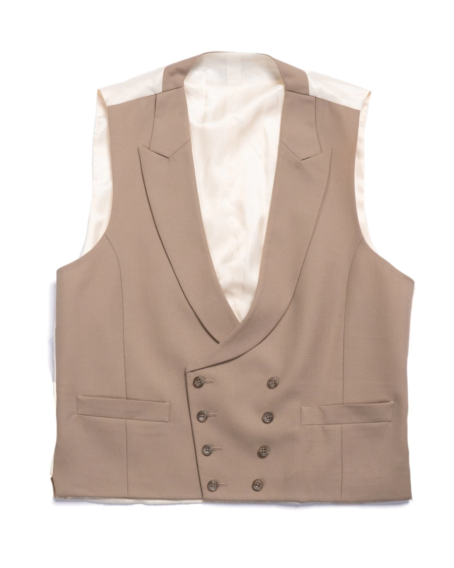 This pure wool double breasted waistcoat in beige is classically cut and features a peak lapel, adding elegance to a morning outfit.