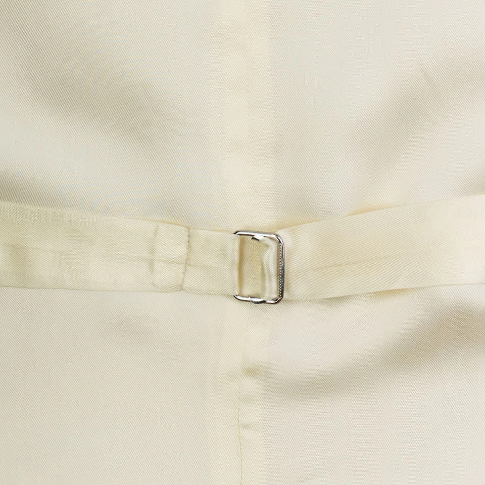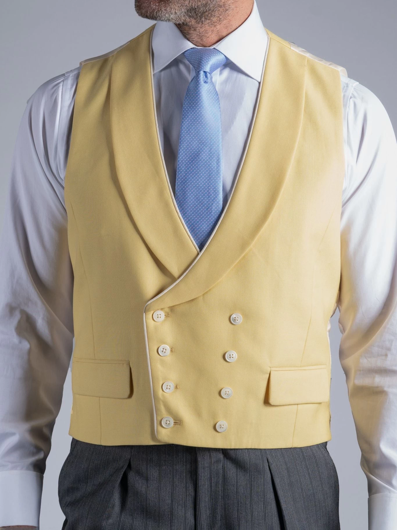 Featuring a shawl collar and contrast cream piping, this double breasted yellow waistcoat brings added elegance to a morning outfit. Crafted from pure wool, the waistcoat is classically cut with a cream satin back-panel and traditional waist adjuster. They’re finished with mother-of-pearl buttons, a cream lining, and are available in regular and long fittings.