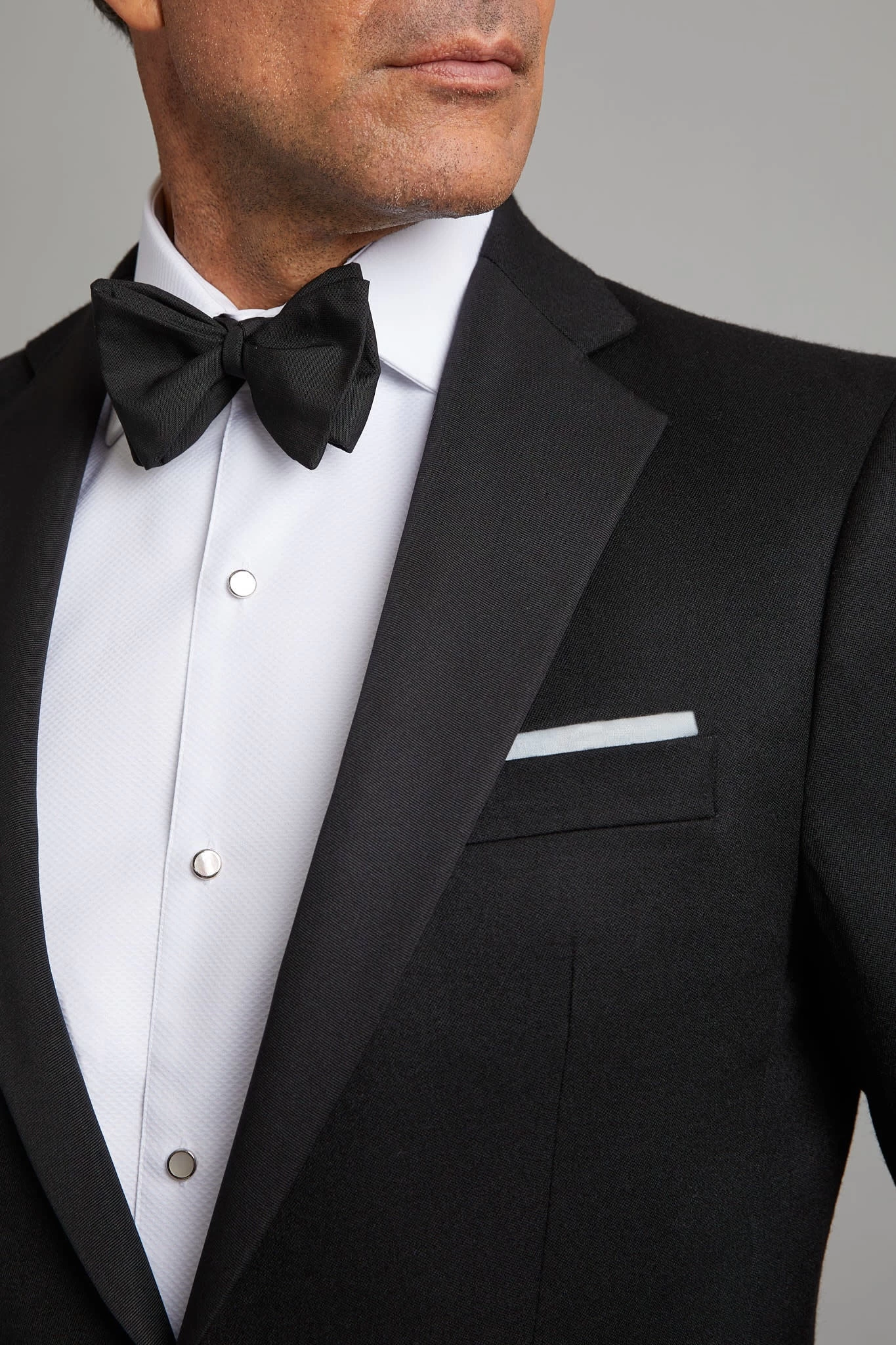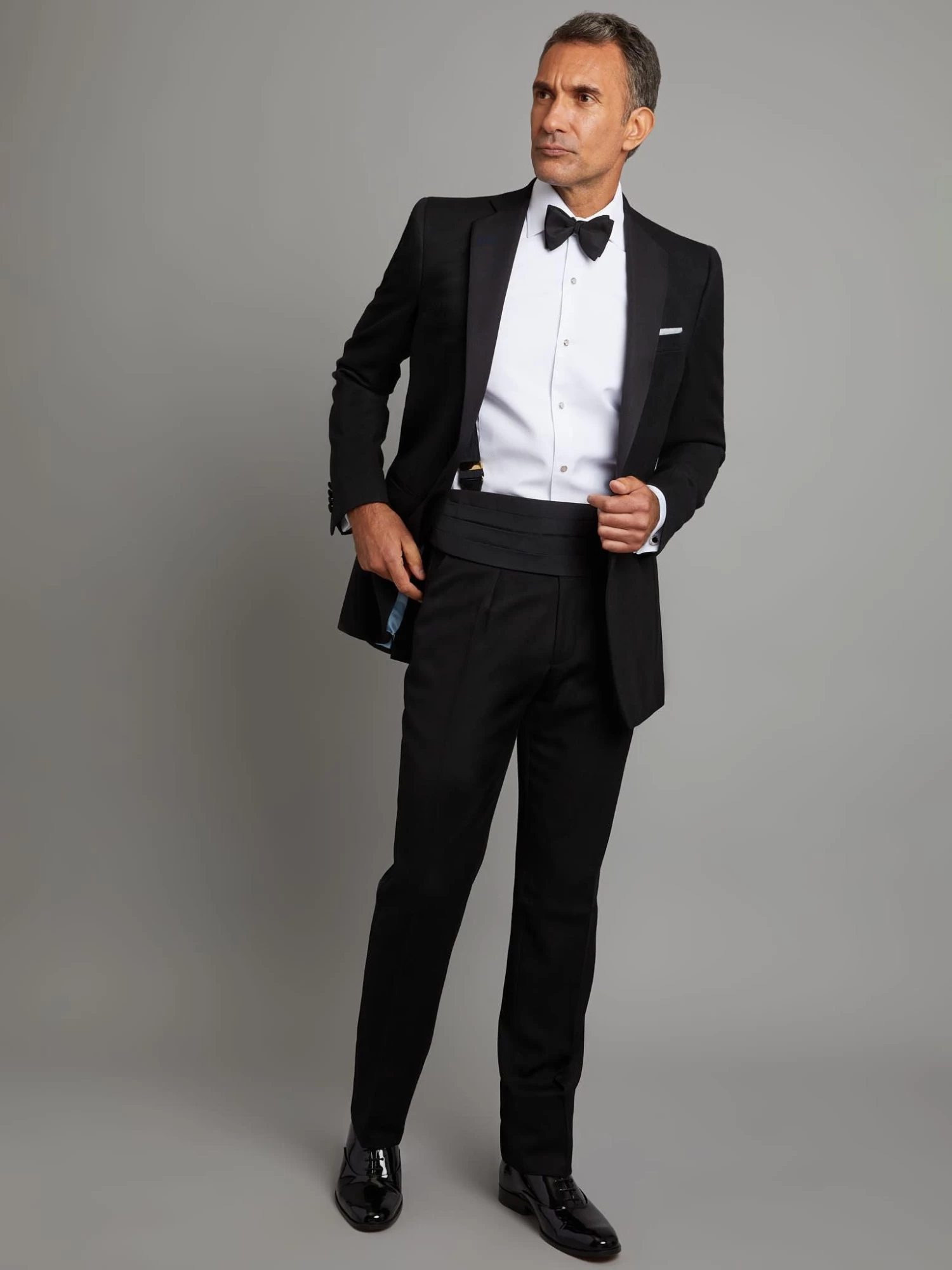 Exquisite tailoring, fine fabric, and understated British refinement define our evening wear. The Eaton Dinner Jacket in Black Barathea features a notch lapel, double jetted pockets, and four button working cuffs. Elevate your evening wardrobe and make a lasting impression with our Eaton Dinner Jacket.