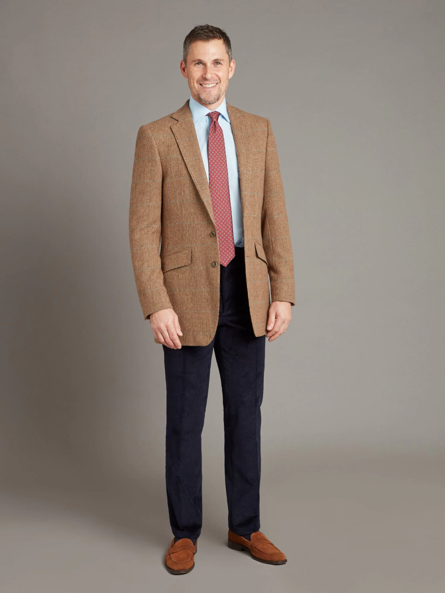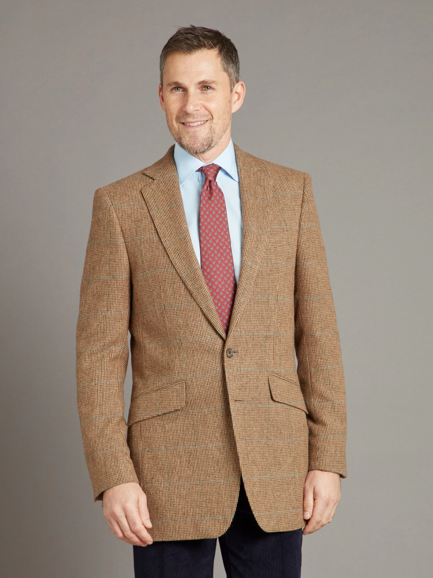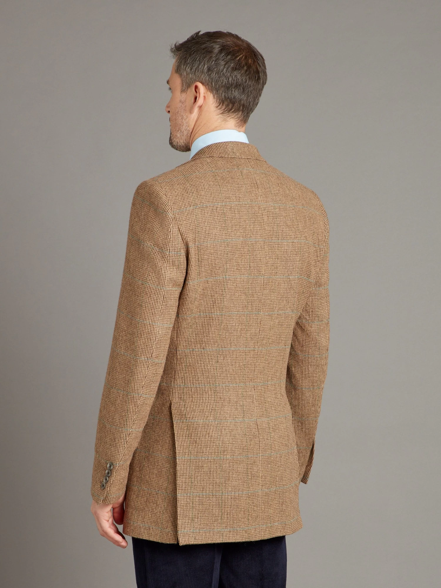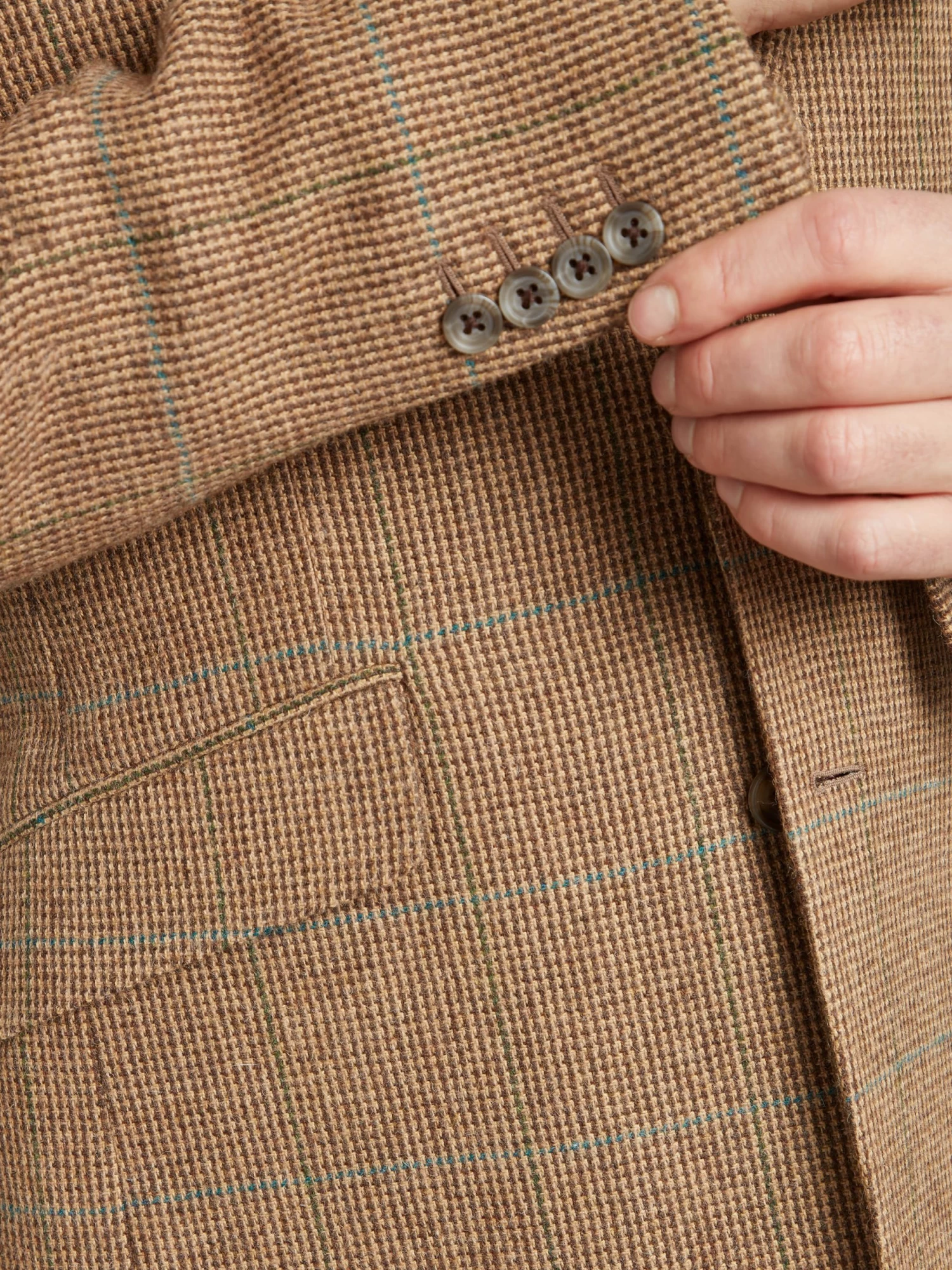 This tweed jacket features a beautiful combination of teal overcheck on warm shades of brown. Characteristic of our Eaton block is the notch lapel, double welt pockets with flaps, and four button working cuffs.
