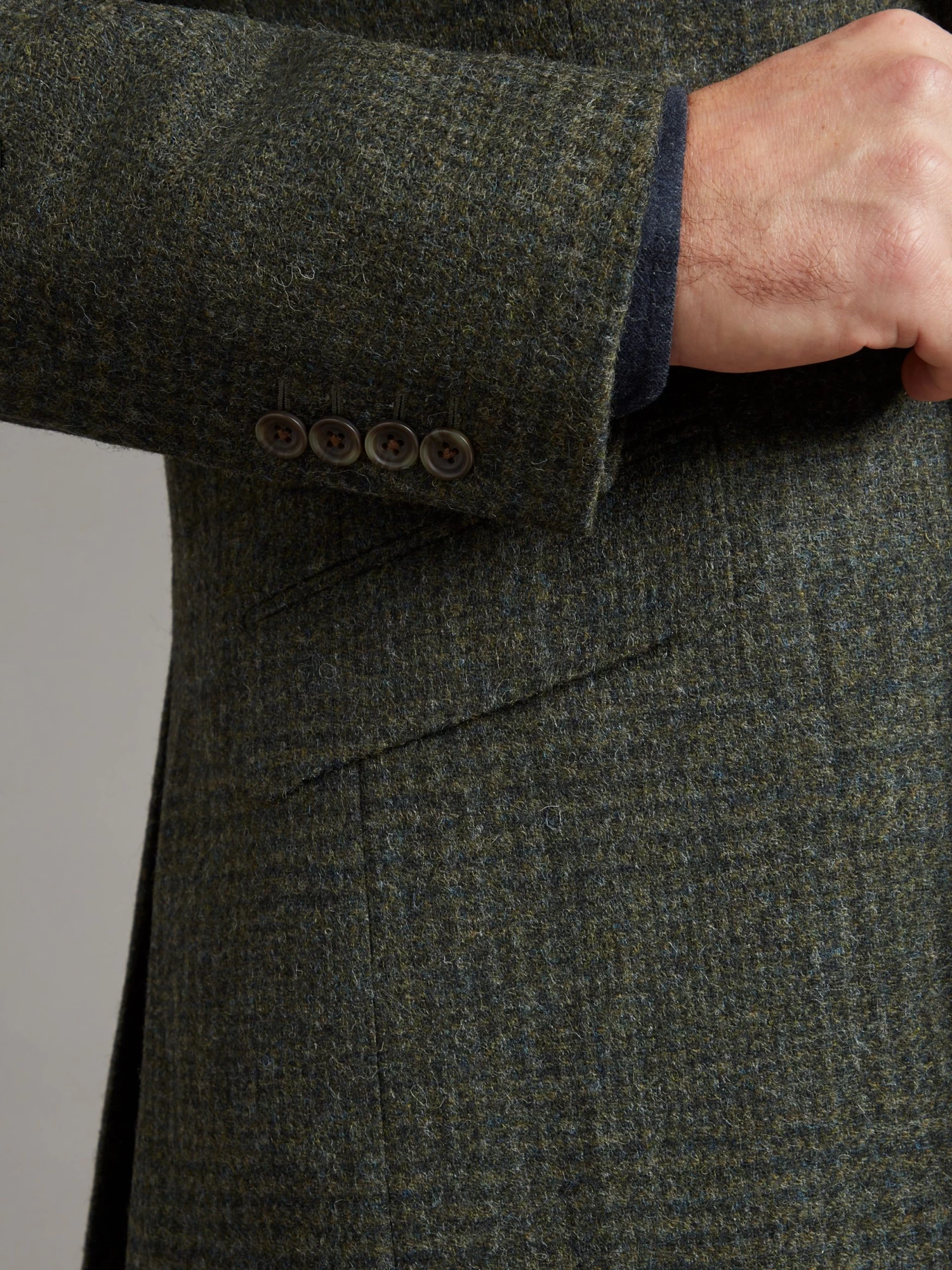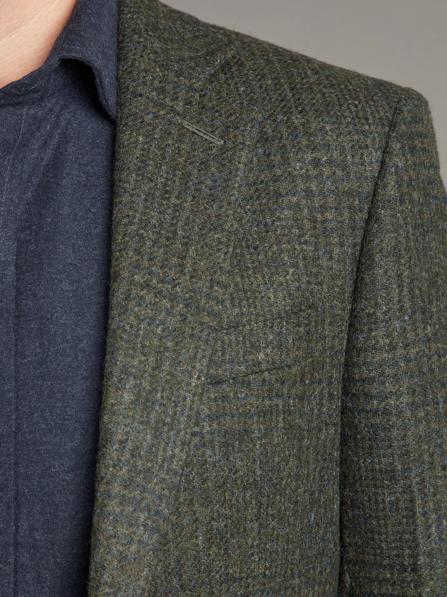 Our Eaton Jacket in Moss green in 100% wool, features a beautiful green check pattern. Characteristic of our Eaton block is the notch lapel, welt pockets with flaps, and four button working cuffs.