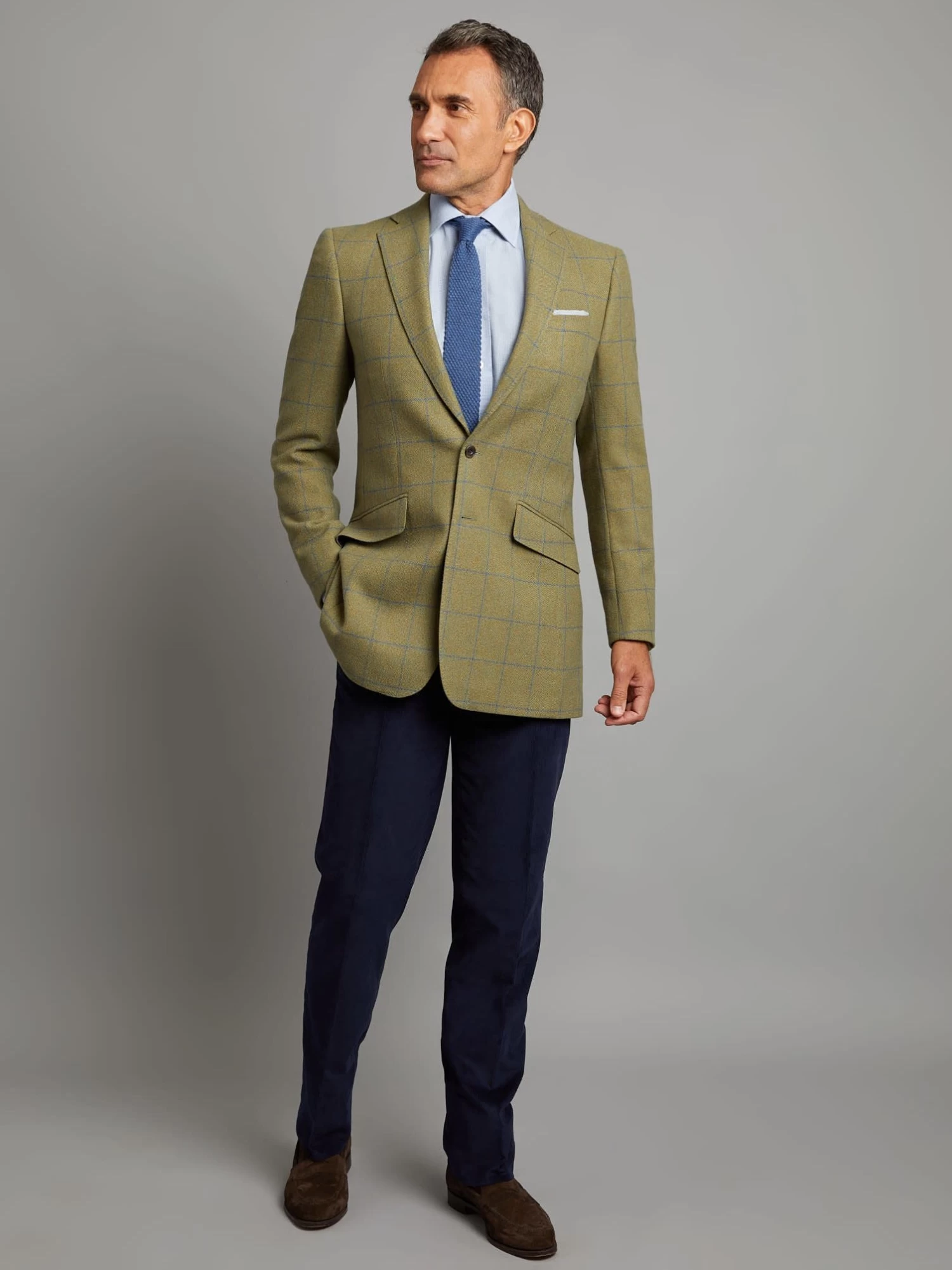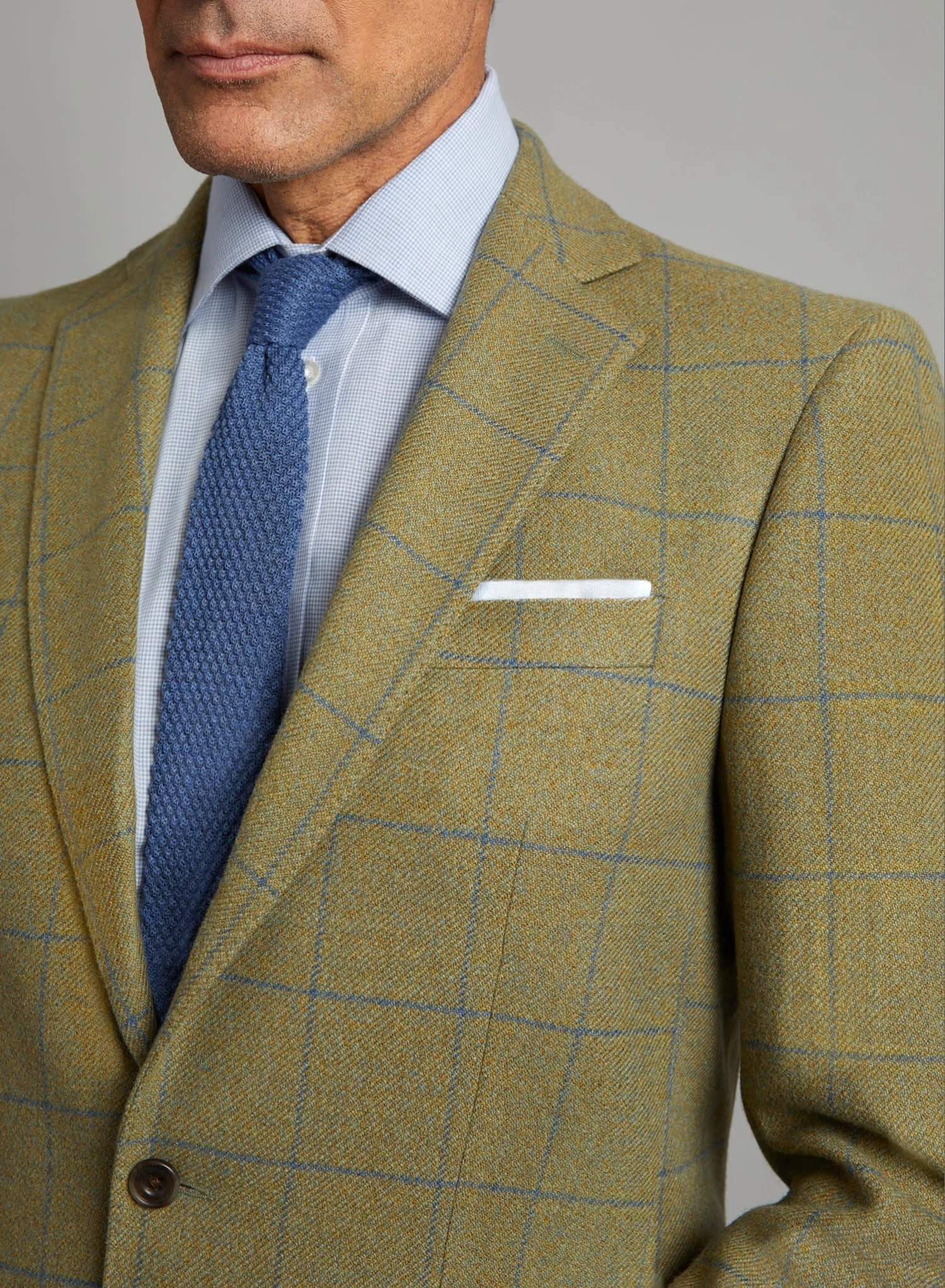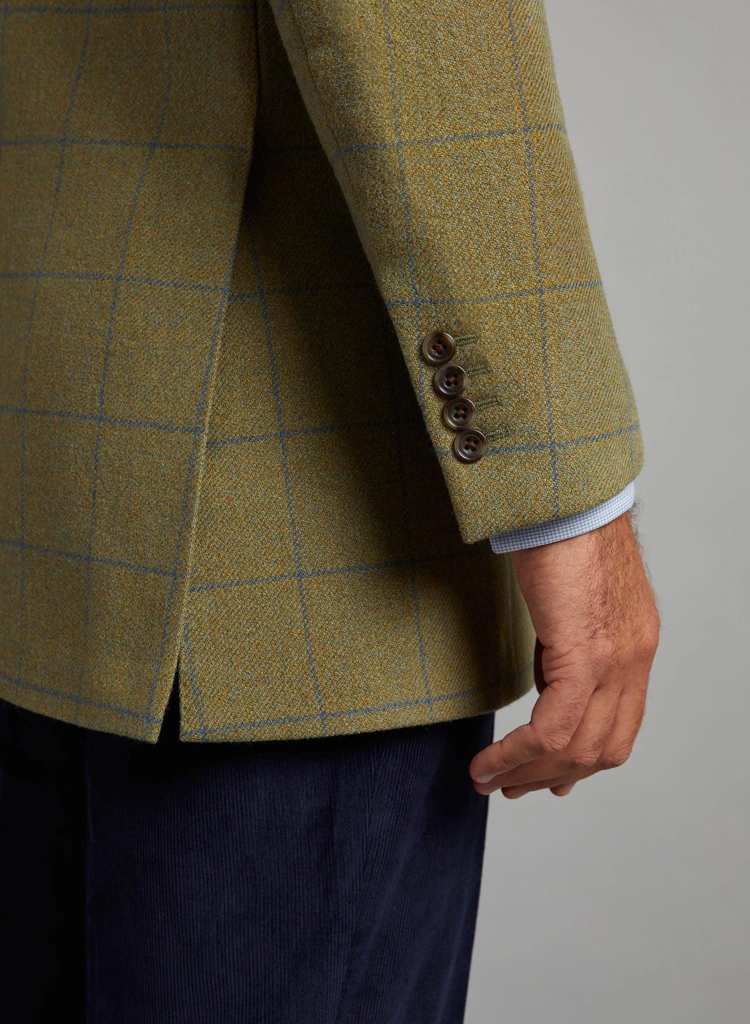 Our collection of tweeds are inspired by the rich colours of the Scottish countryside and named for the rivers that nourish the Caledonian wildlife. Our Ettrick tweed features a fine blue check over a beautiful green tweed; it has a four-button working cuff, double welt pocket with flaps and a notch lapel.