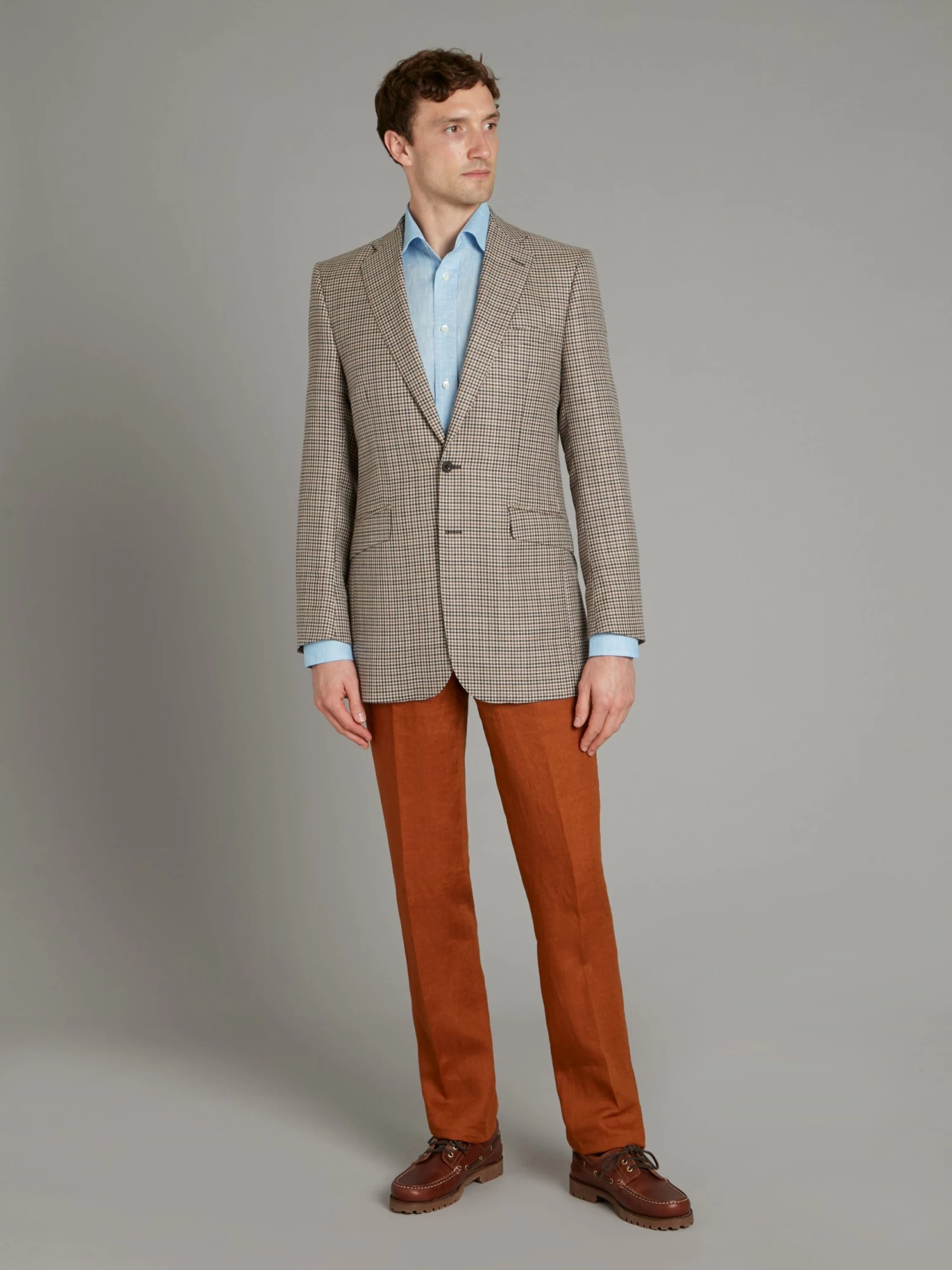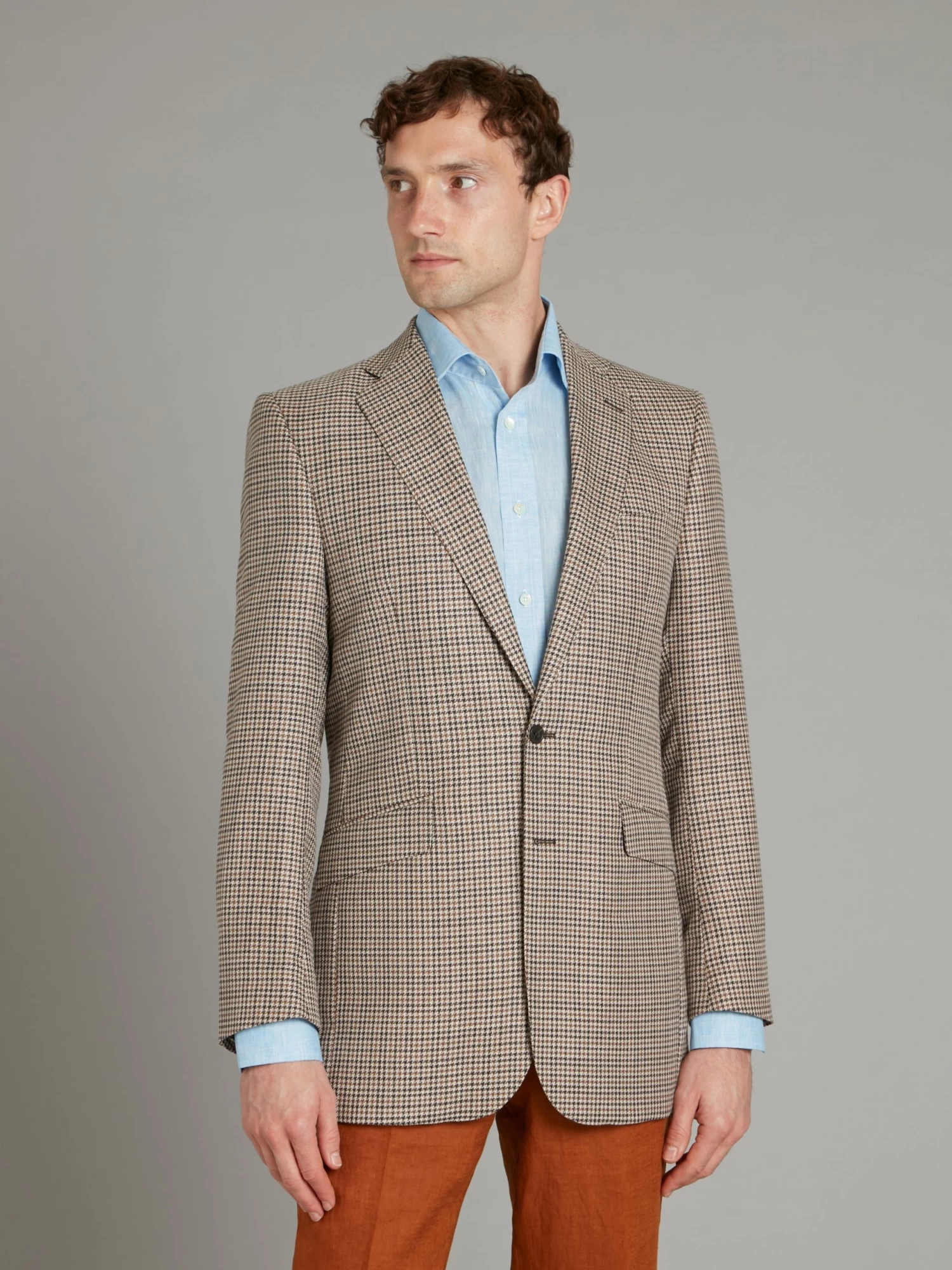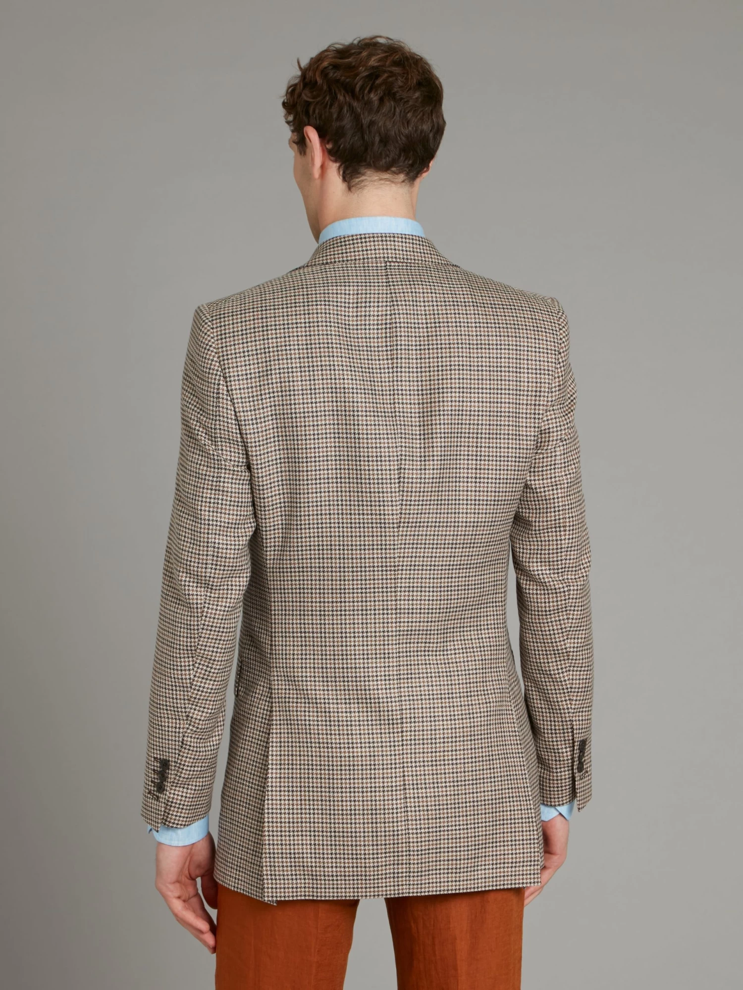 Crafted from a lightweight blend of wool, silk, and linen, this jacket flatters the wearer while still offering breathability in warm weather. The buggy lining and houndstooth pattern adds a touch of refinement.