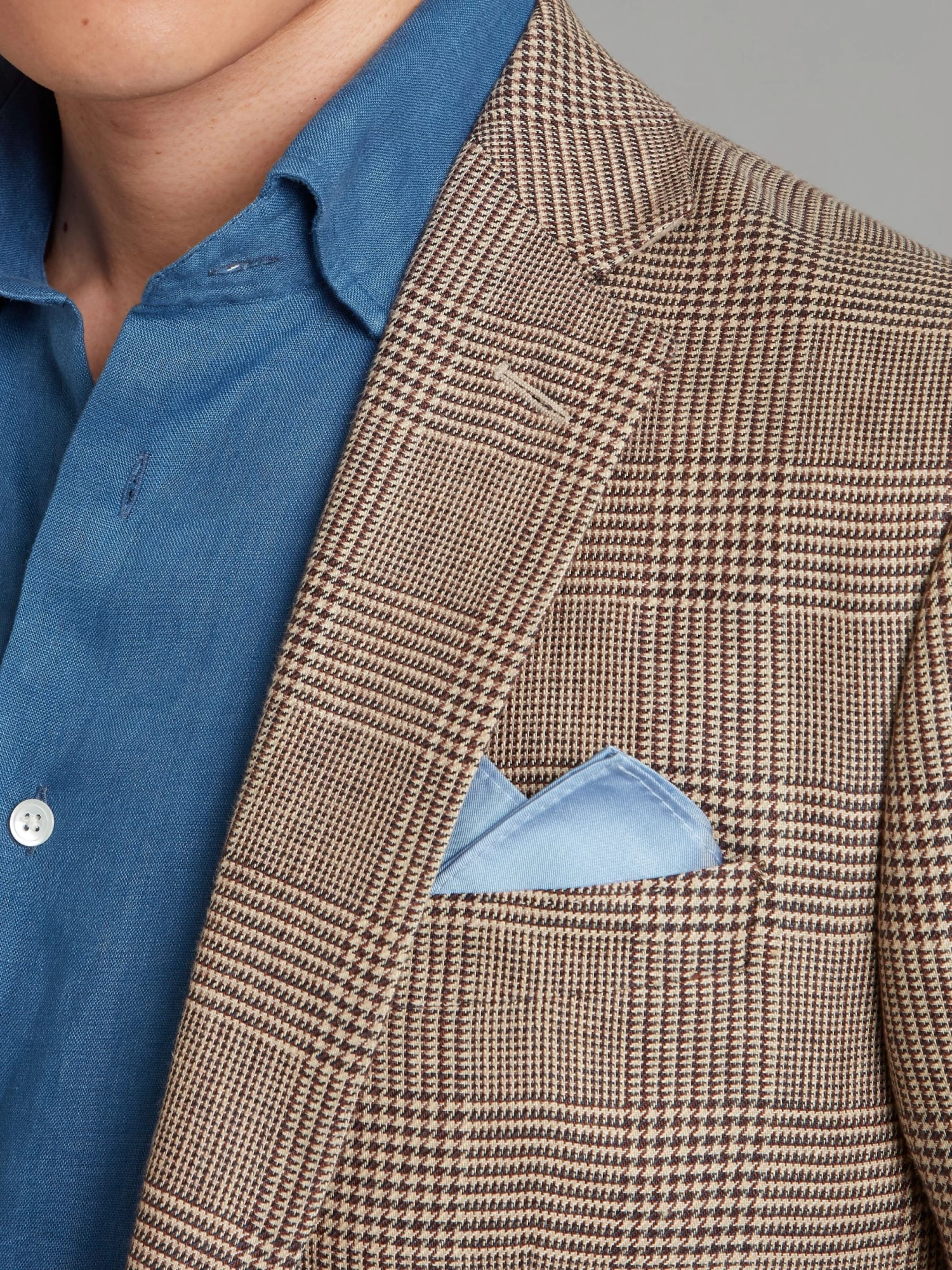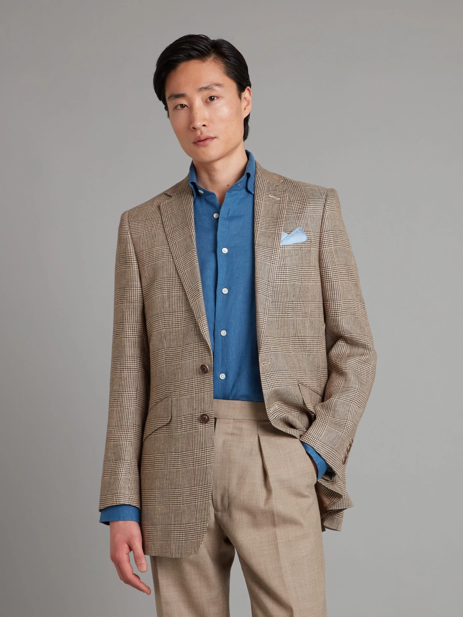 This brown jacket features a classic Prince of Wales check. Perfect for the warmer months, it is cut from 100% linen (208gms) .