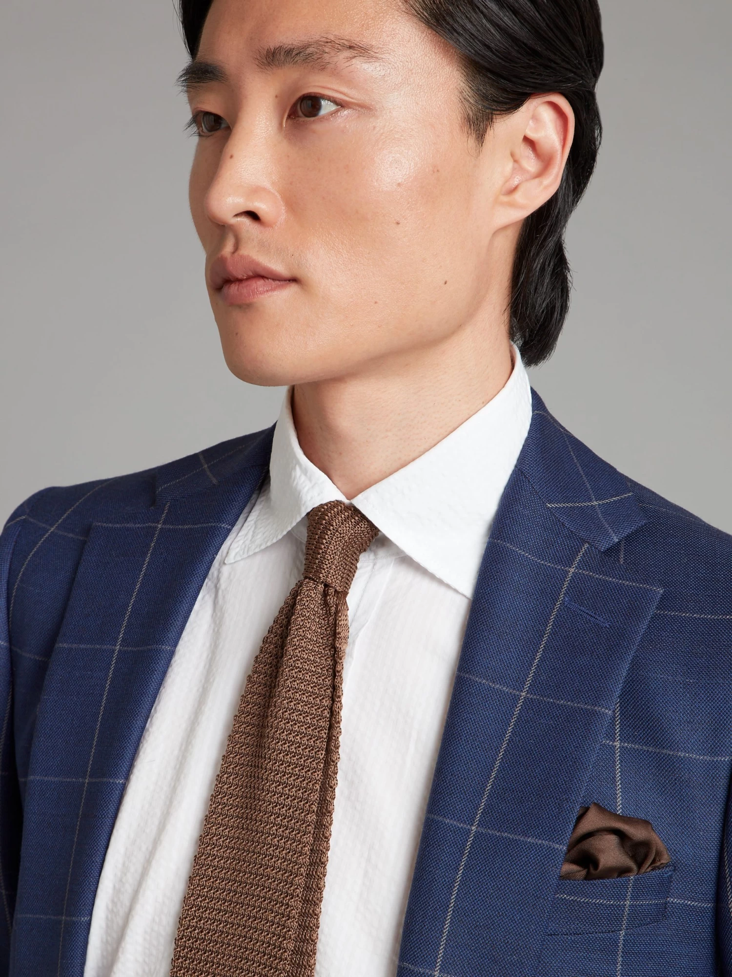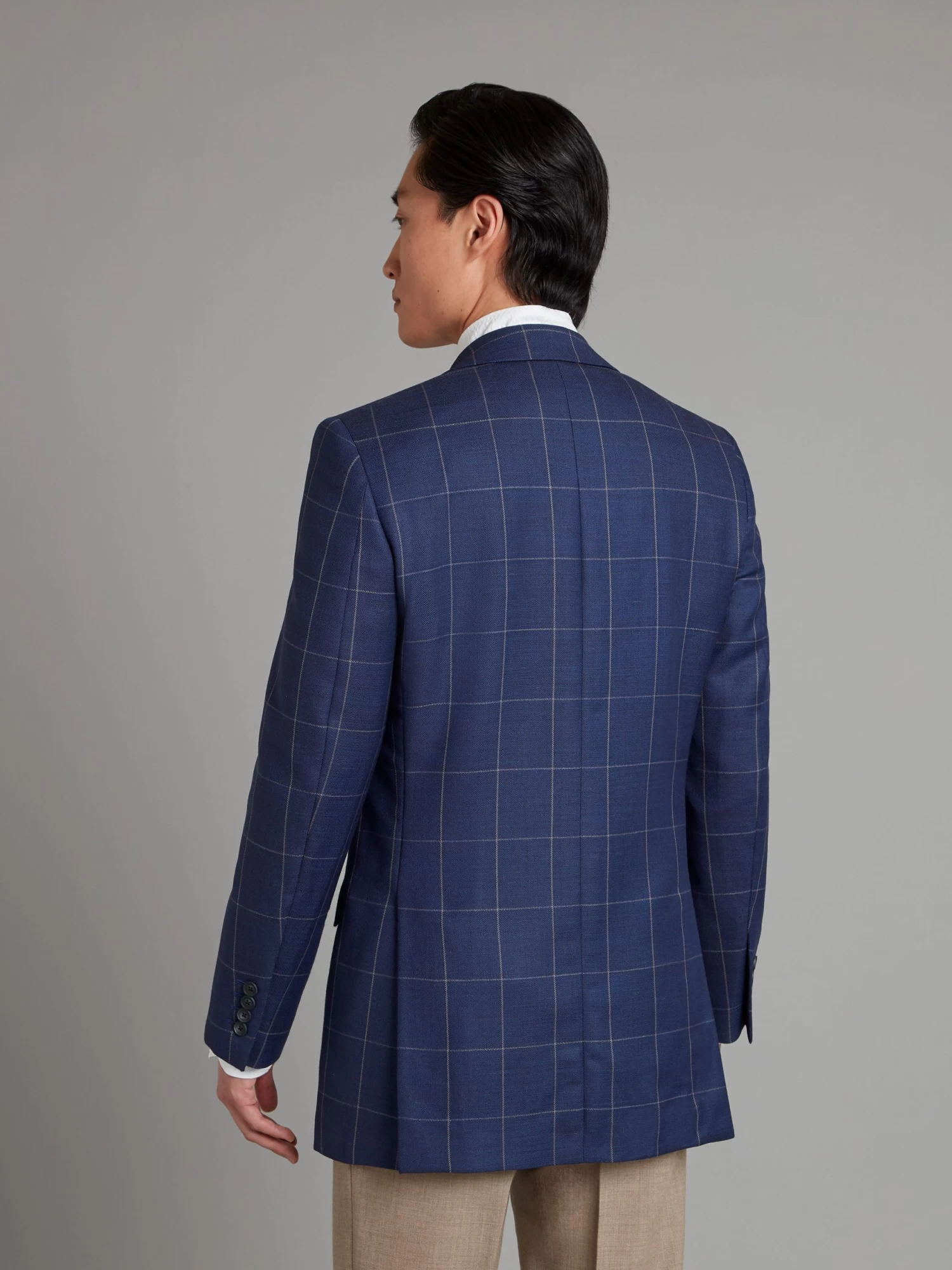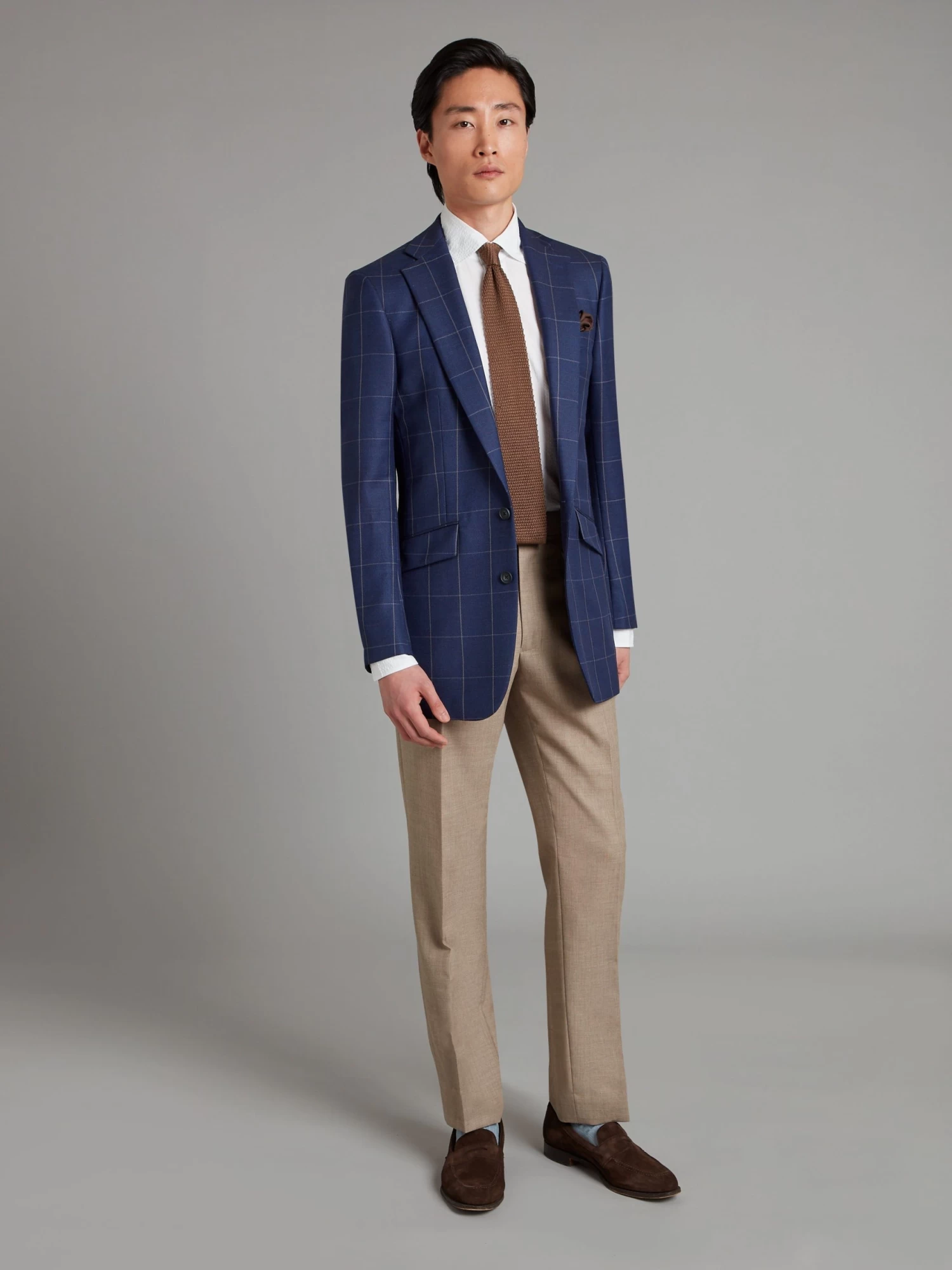 This navy jacket features a striking windowpane check. Produced by renowned British manufacturer Harrisons, the cloth is made of 60% merino wool and 40% natural Shetland Wool, selected for its durability in as well as its soft, luxurious feel.