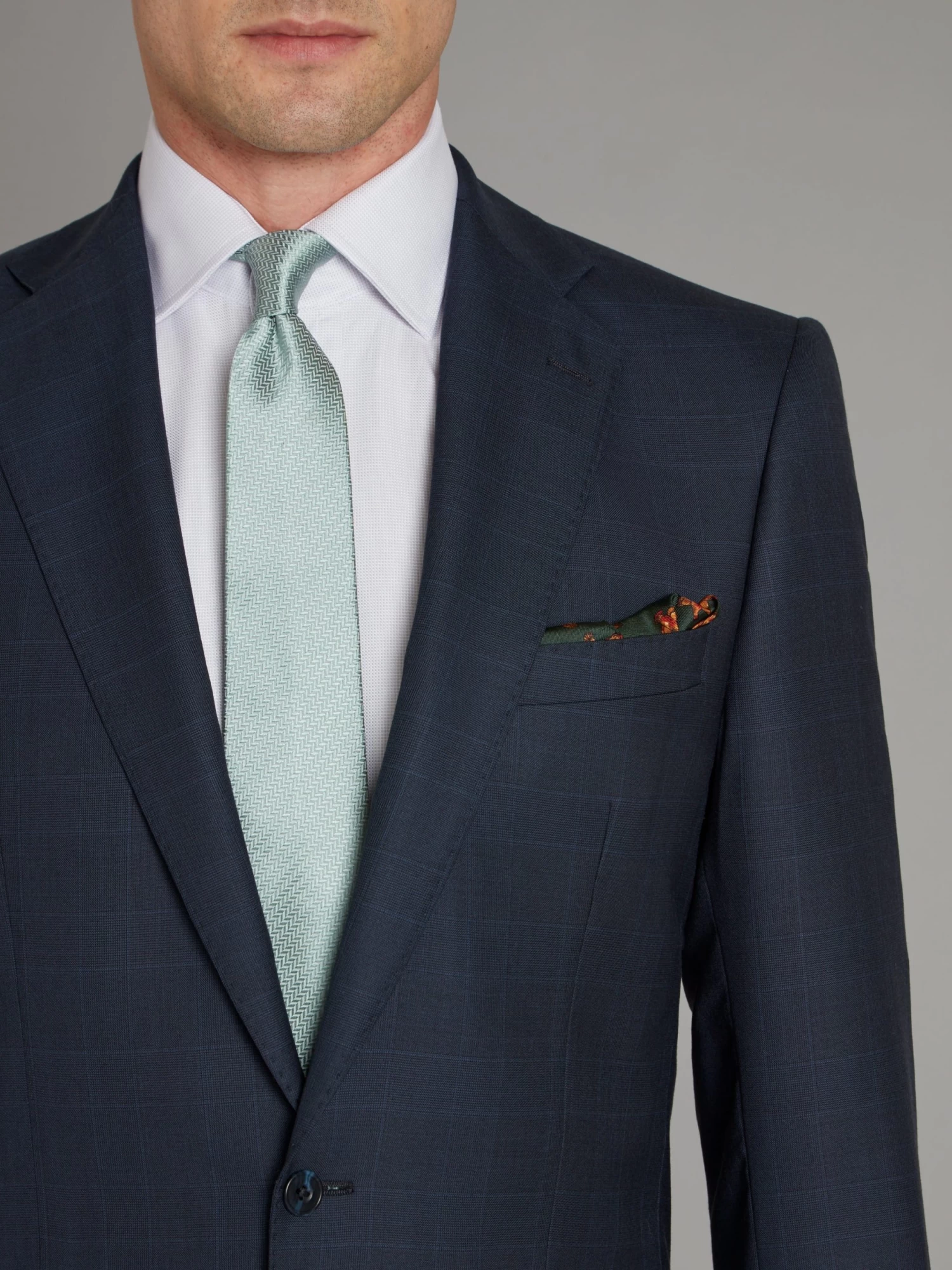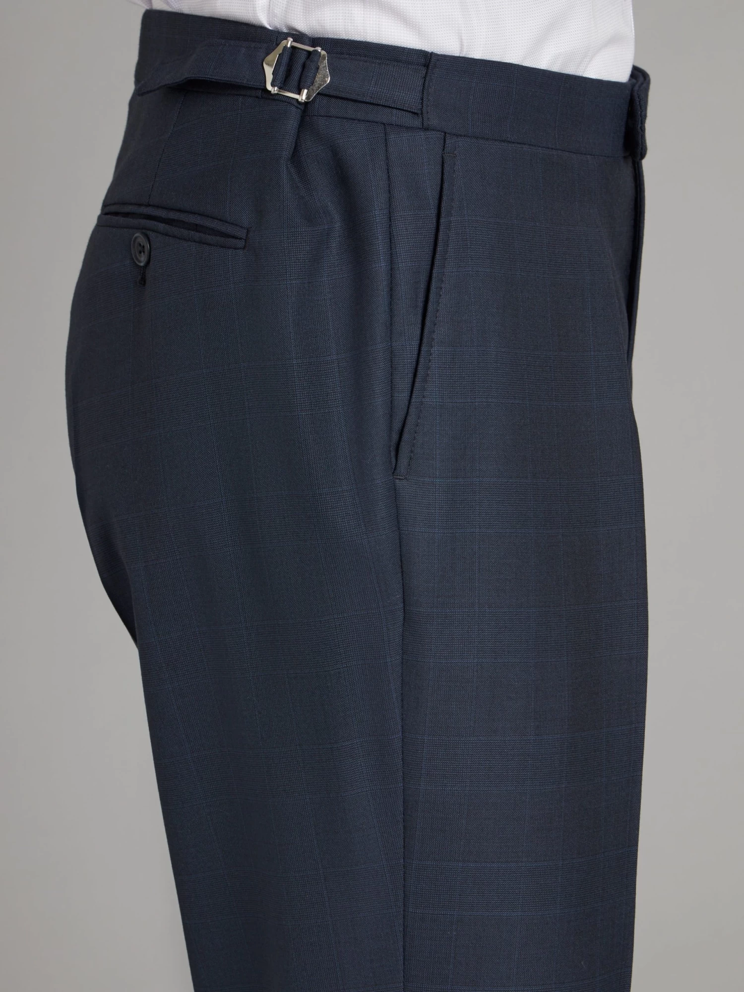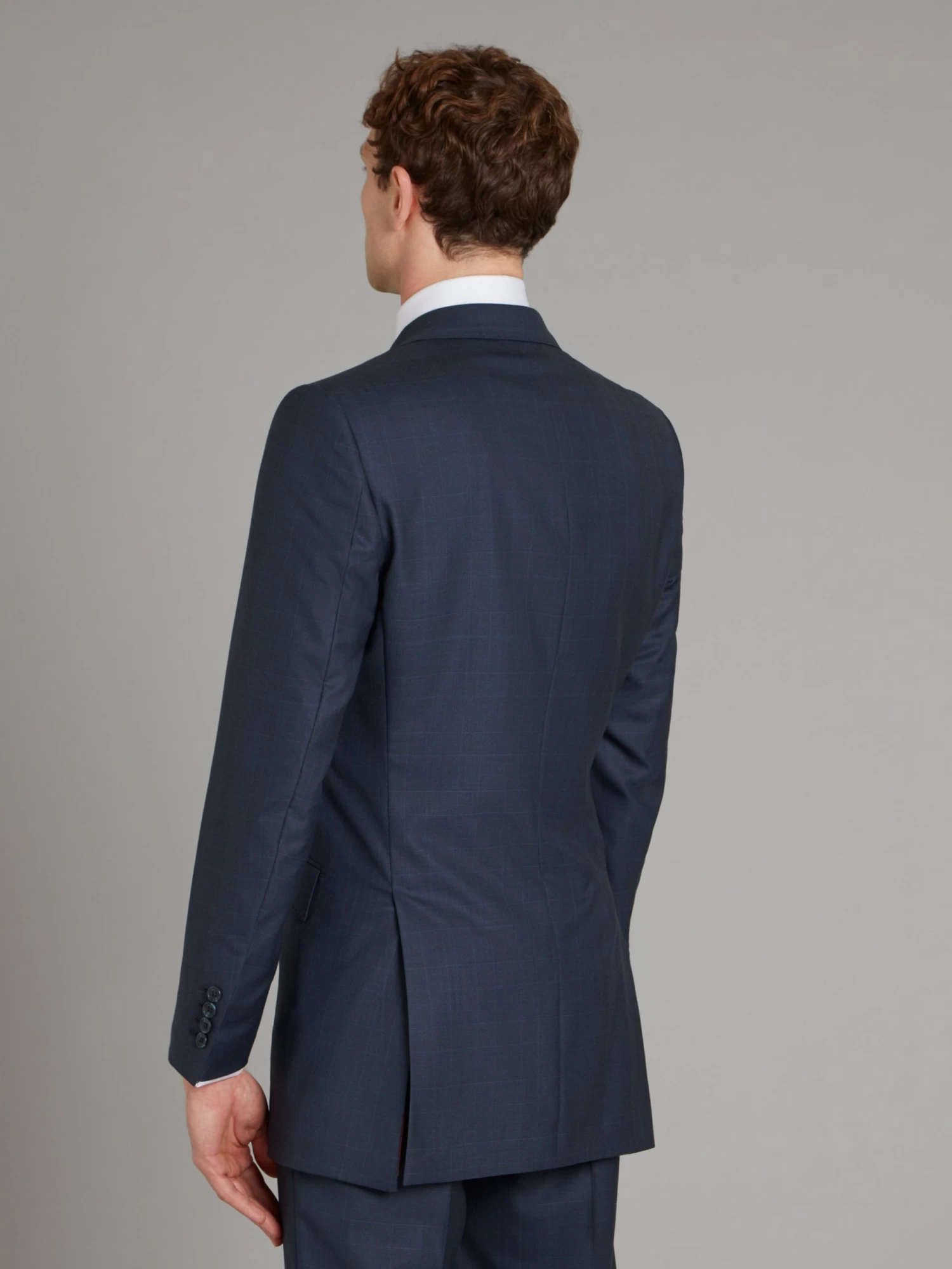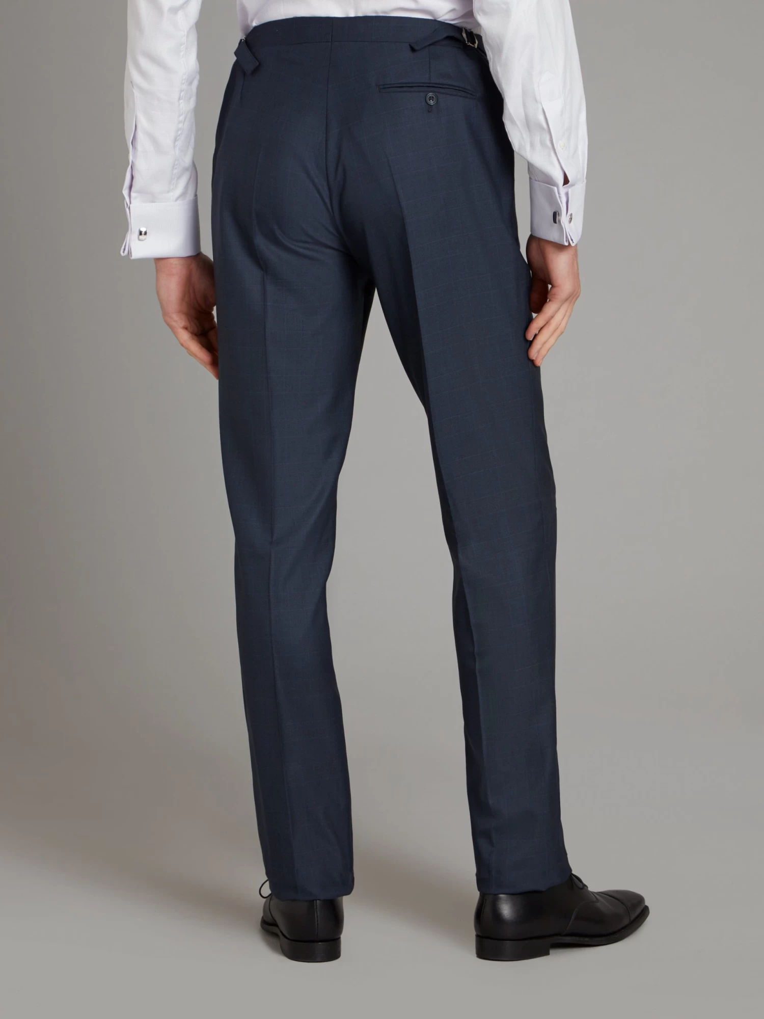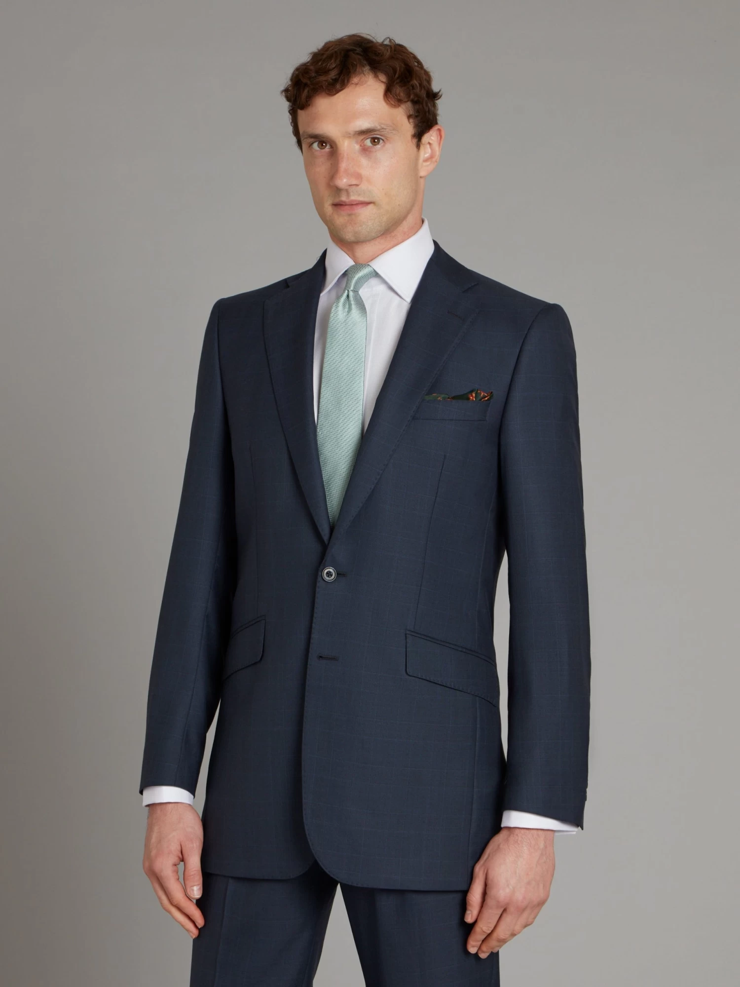Tailored from our single-breasted Eaton block, this suit has a classic-fitted cut. Made with a superfine check Loro Piana fabric in stunning midnight blue, the suit features a canvassed chest piece and four button working cuffs.