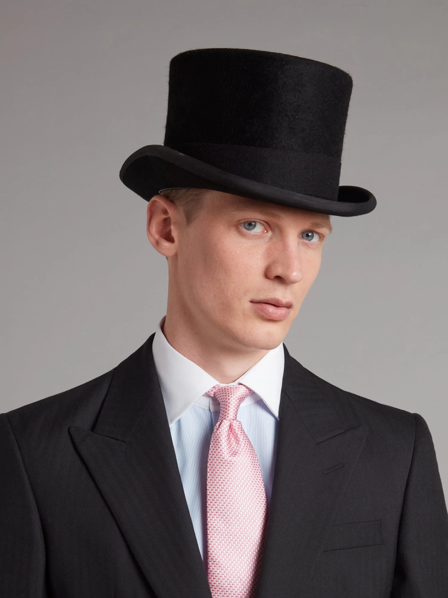 Hand-crafted of 100% wool felt, this hat is finished with a mourning band made of Melton wool and fully lined with white satin.
