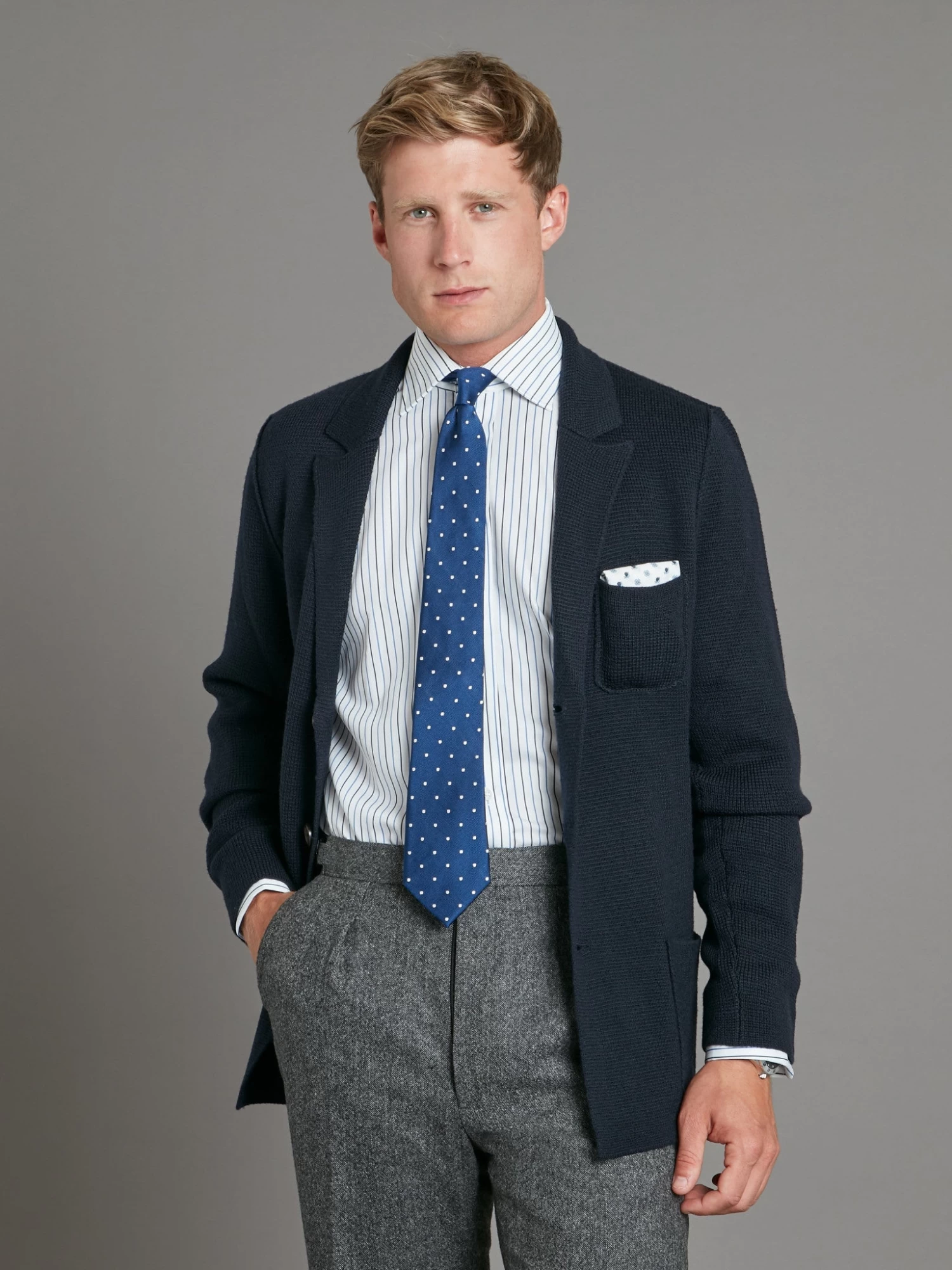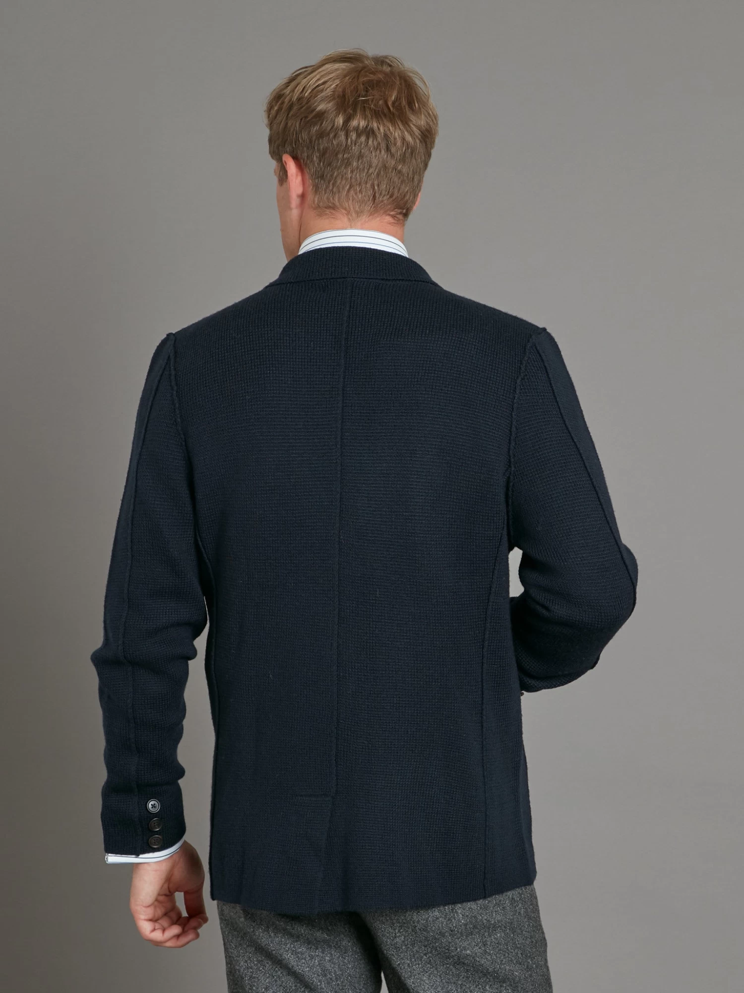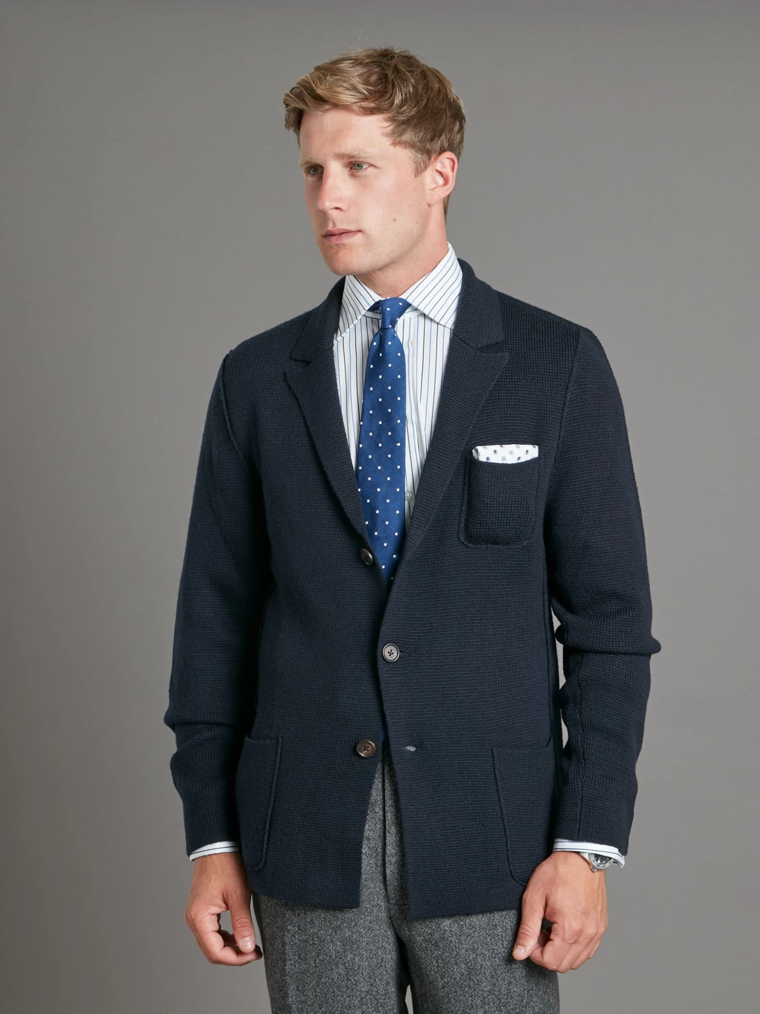 This sophisticated knitted jacket in navy, combines the comfort of a cardigan with the elegance of a jacket with its peaked lapel, a go to piece for the Autumn Winter season. Perfect for layering over a shirt for a smart, put together look.