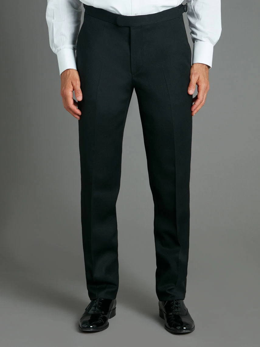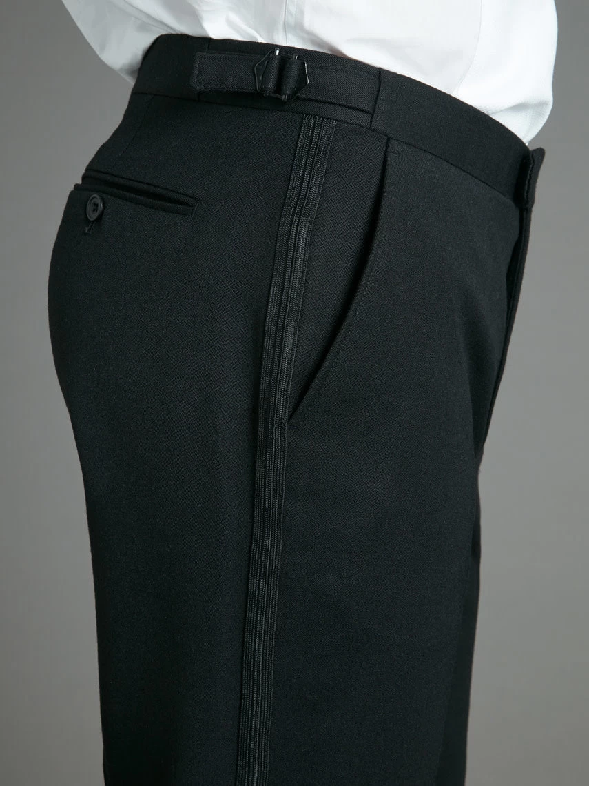 Made of 100% wool barathea, these classic evening trousers are cut for a slim fit with a flat front. Designed with slanted hip pockets, side adjusters, brace buttons, and a ribbed braid on the outside leg.