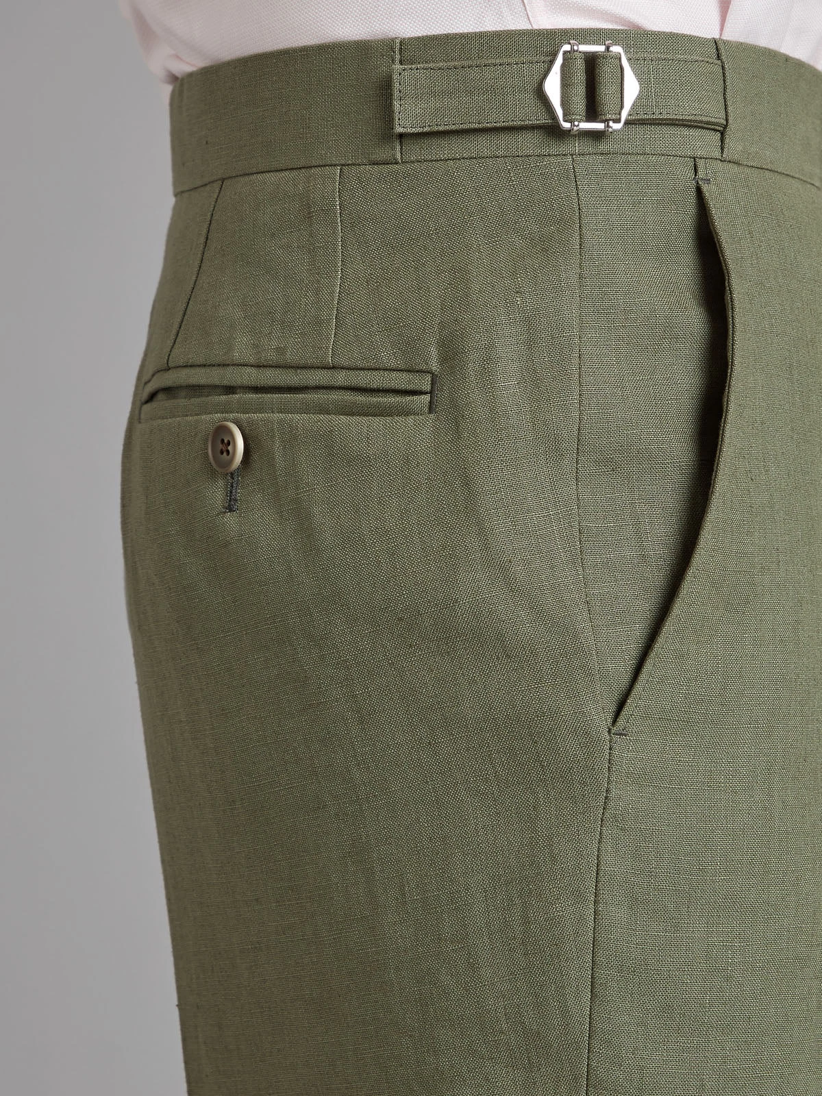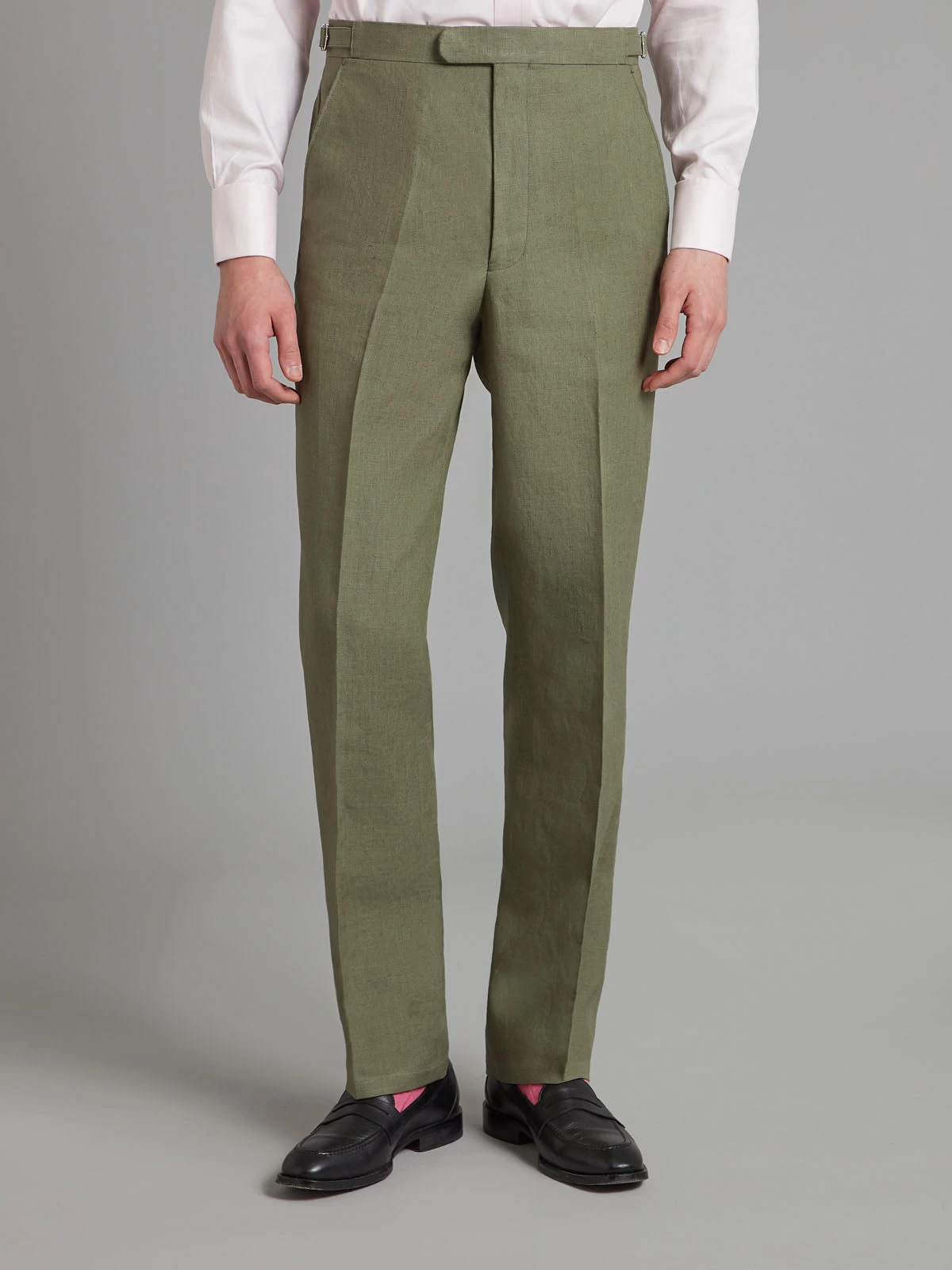 Ideal for summer, these sage green trousers are made of pure linen, for unmatched comfort and style. Cut for a regular fit with a flat front, they feature slant pockets, side adjusters and a hook and bar tab for a clean look.