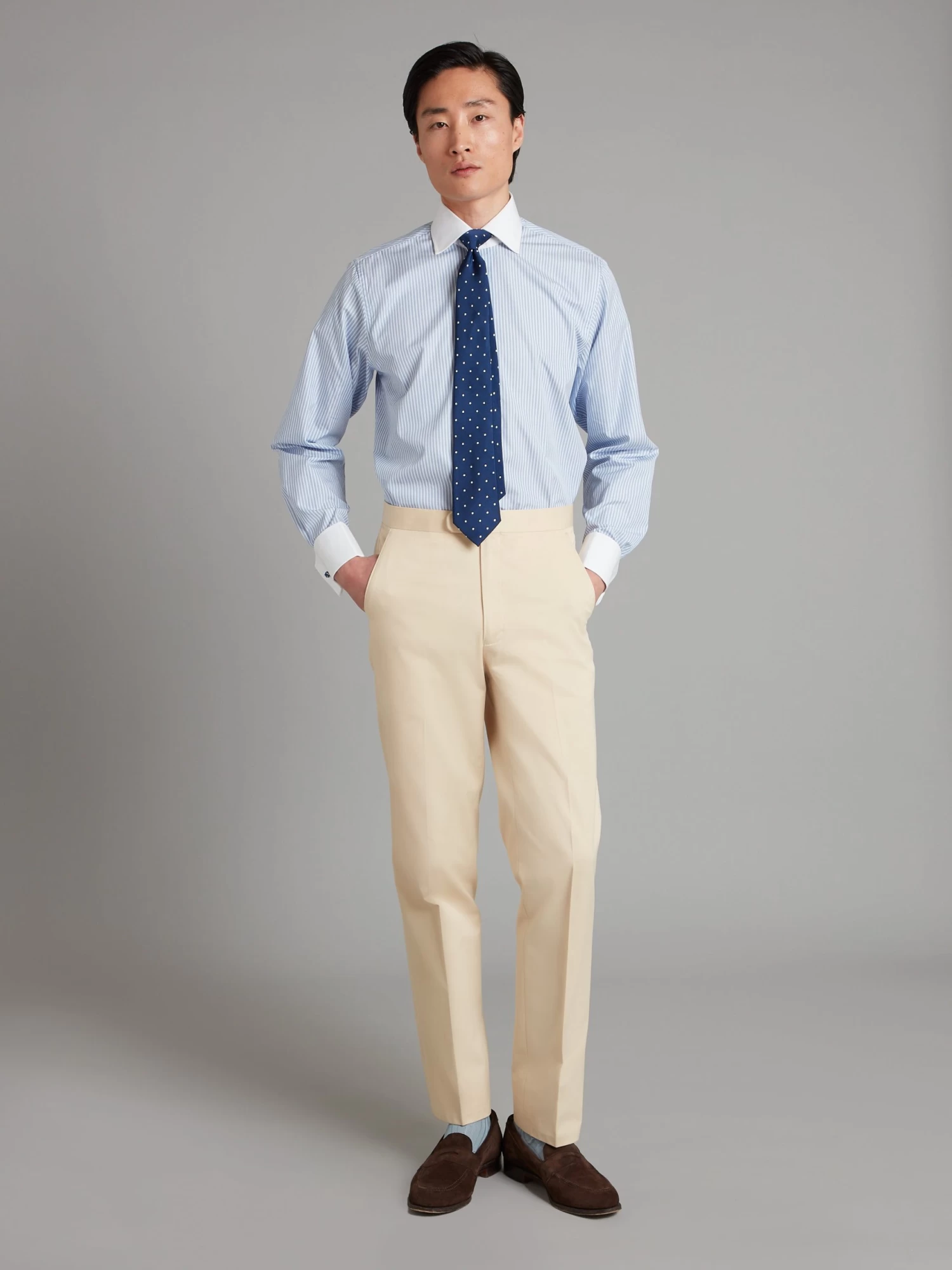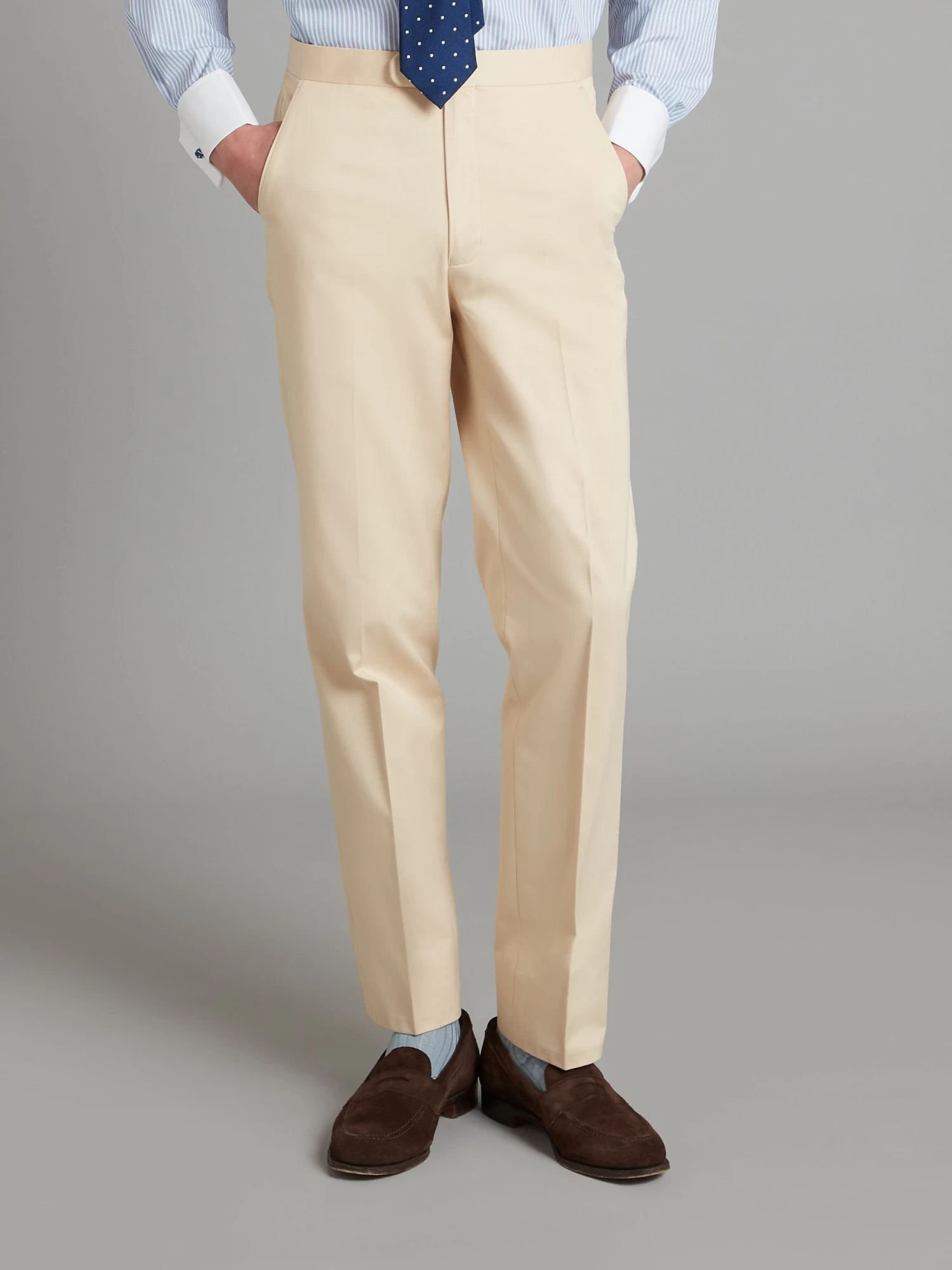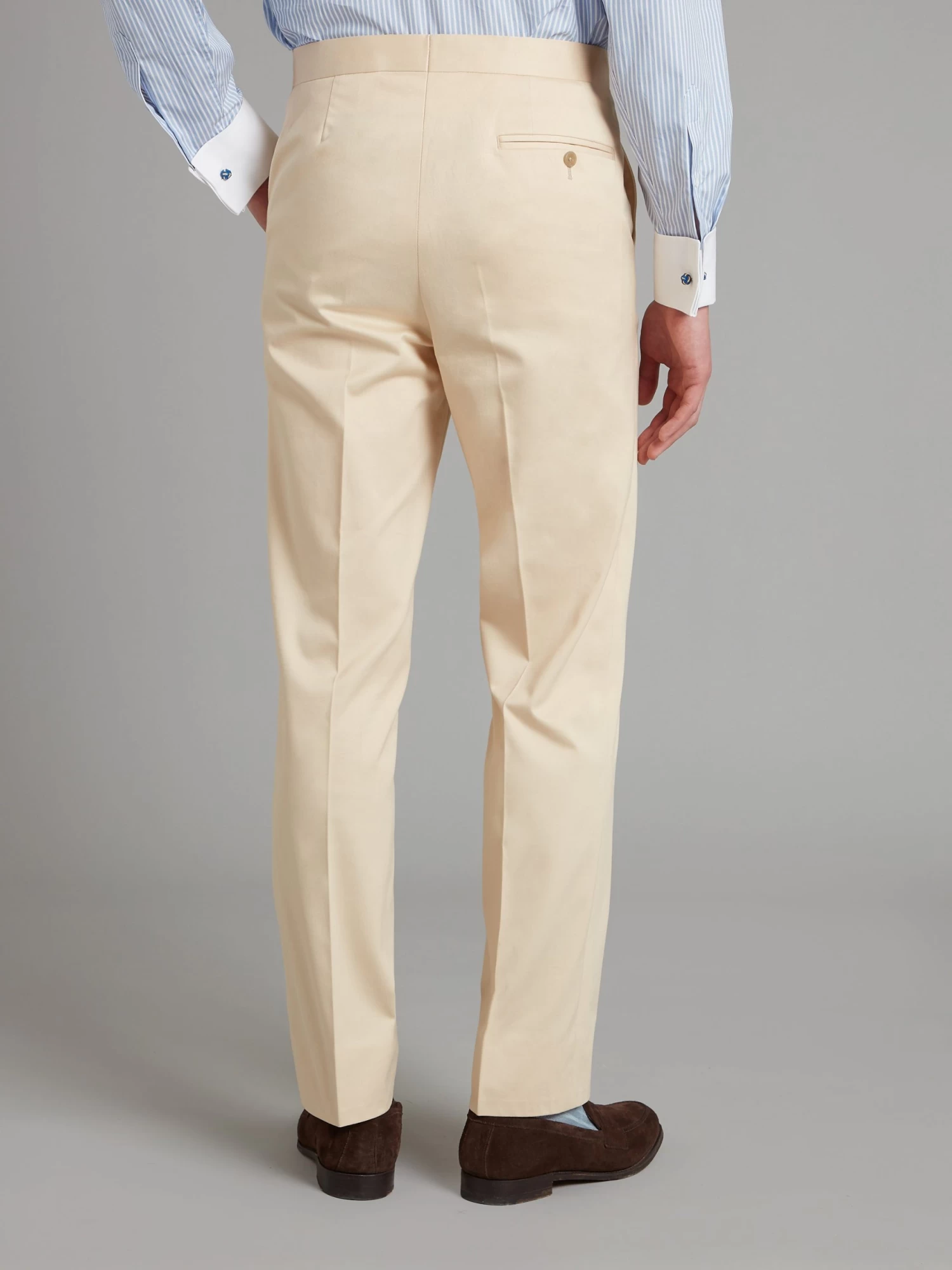 These cream trousers are made of pure cotton, for unmatched and versatile style during the summer months. Cut for a regular fit with a flat front the trousers are unfinished but can be hemmed for an additional charge.