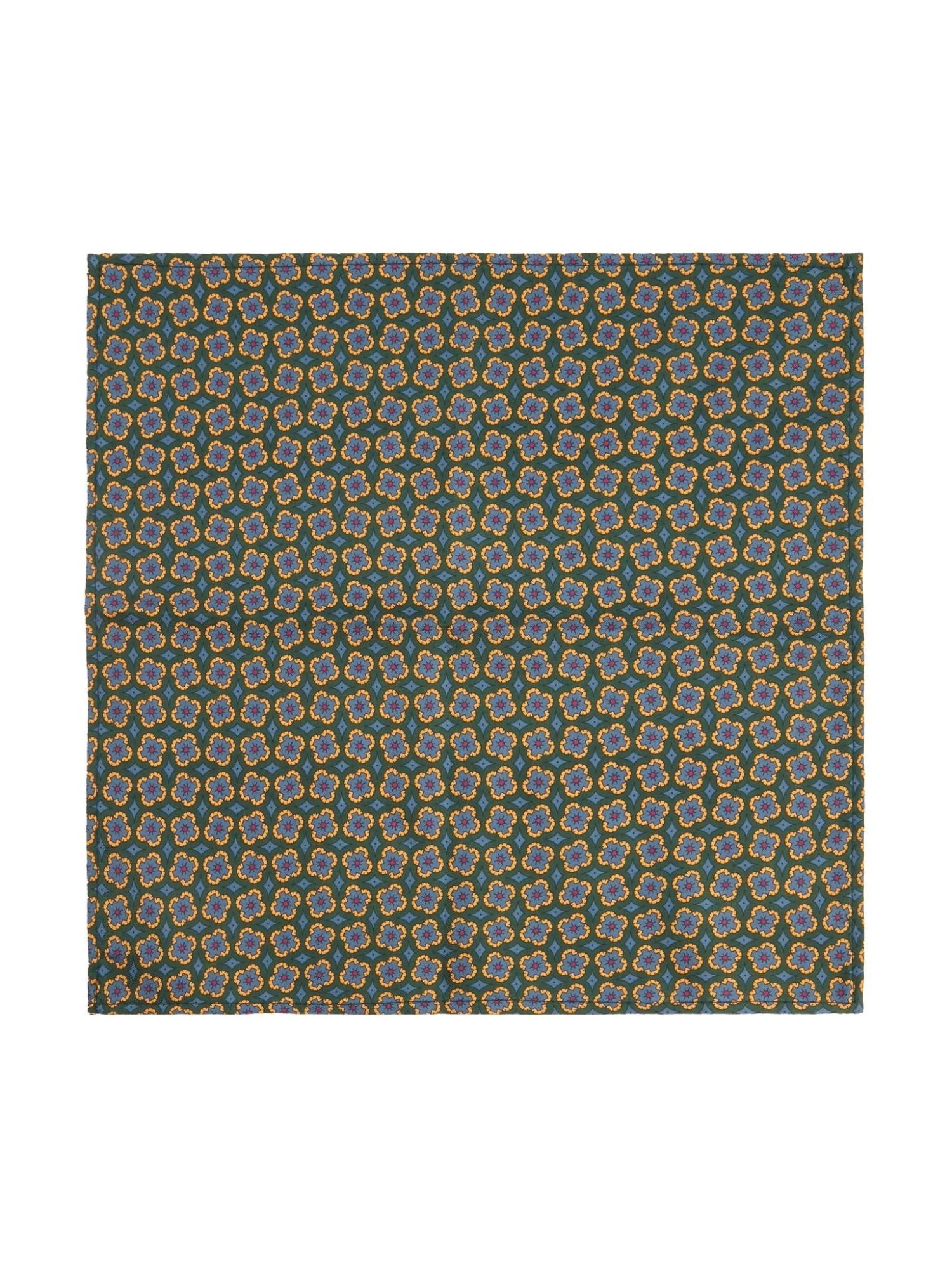 A richly green coloured silk handkerchief with a lively blue and gold floral pattern that nods to the Bohemian roots of Chelsea style.