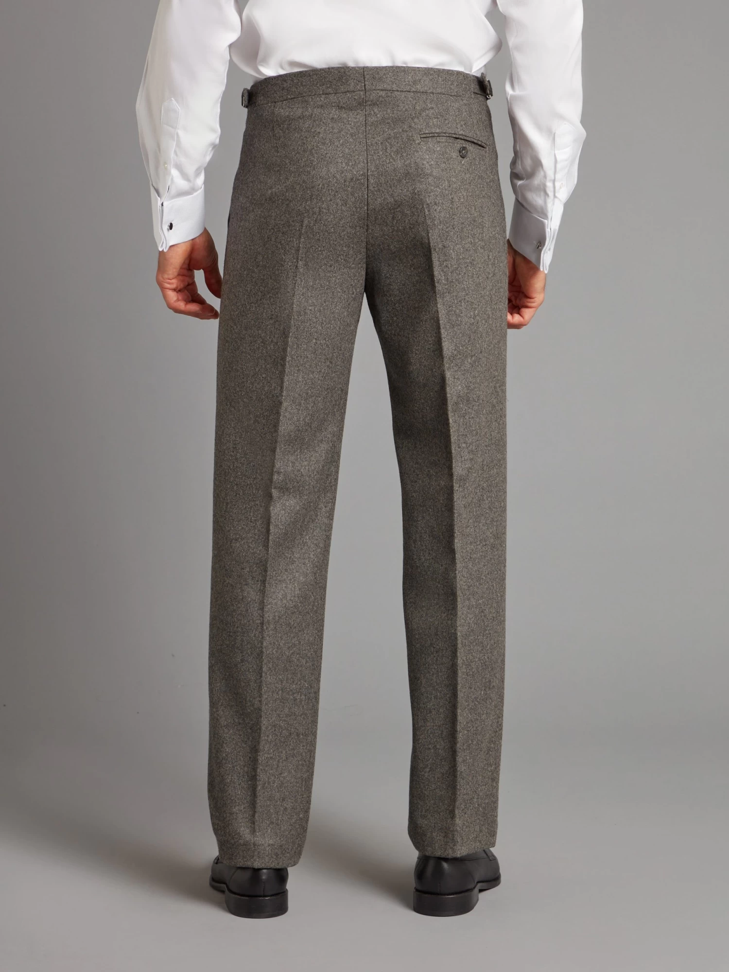 These classic trousers, in grey flannel, are crafted from pure wool; they feature single pleats, side adjusters, and internal brace buttons. The trousers are unfinished but can be hemmed for an additional charge.