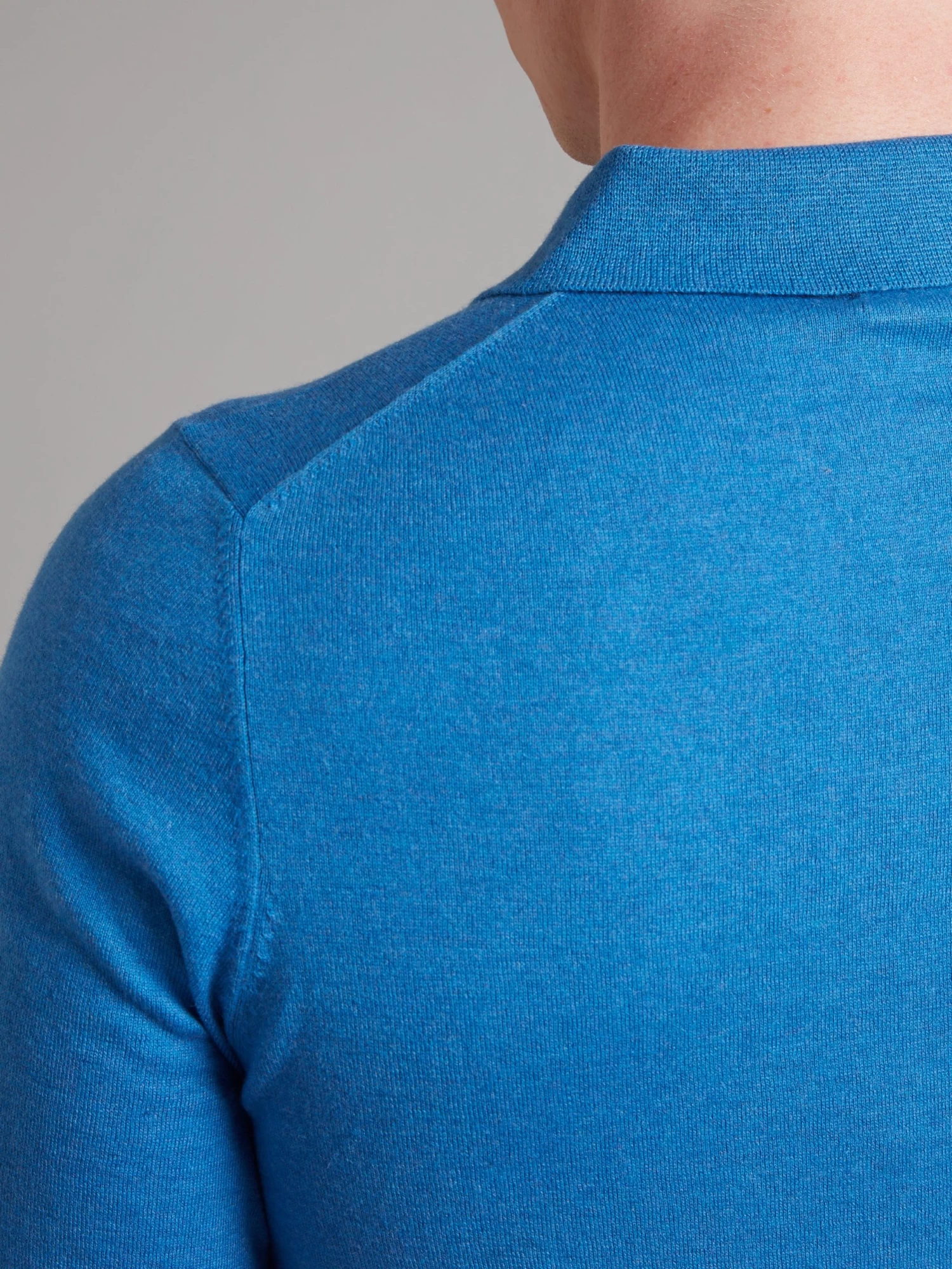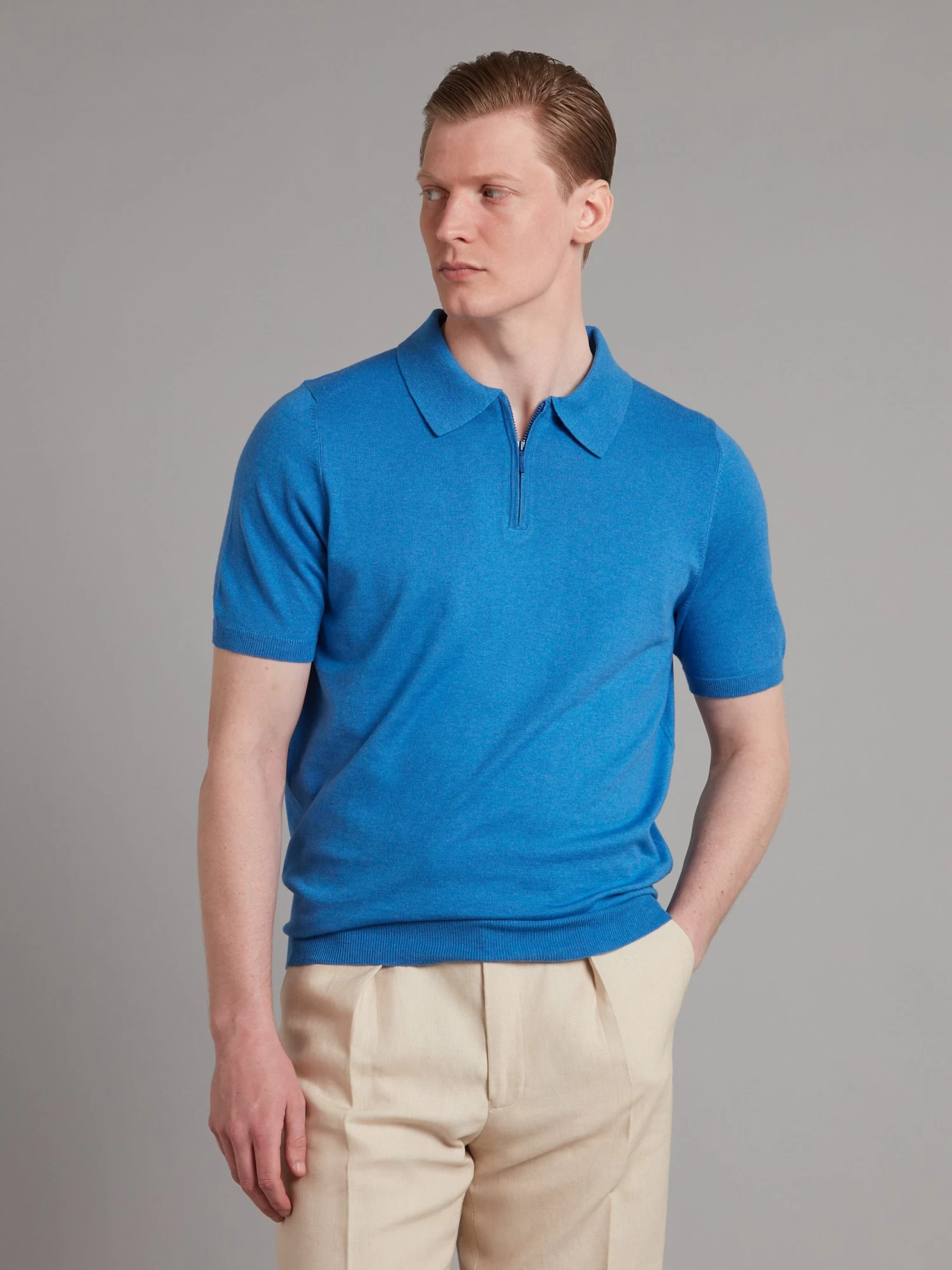 A spring/summer wardrobe staple, Oliver Brown’s half zip polo shirt in blue is made from a luxuriously soft and durable cotton cashmere blend and features a slim, flattering cut.