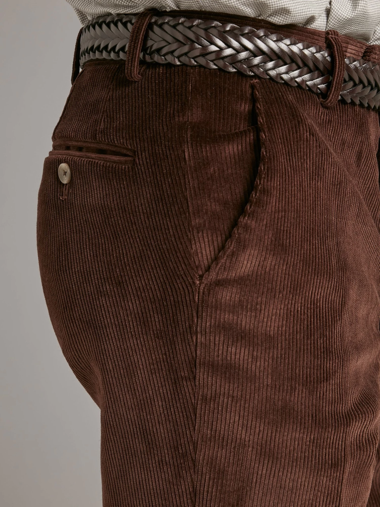 Cut for a classic fit with a flat front, our heavy cord trousers have slanted hip pockets and welt pockets at the rear. The trousers are unfinished, but can be hemmed with a plain finish or turn-up for an additional charge.