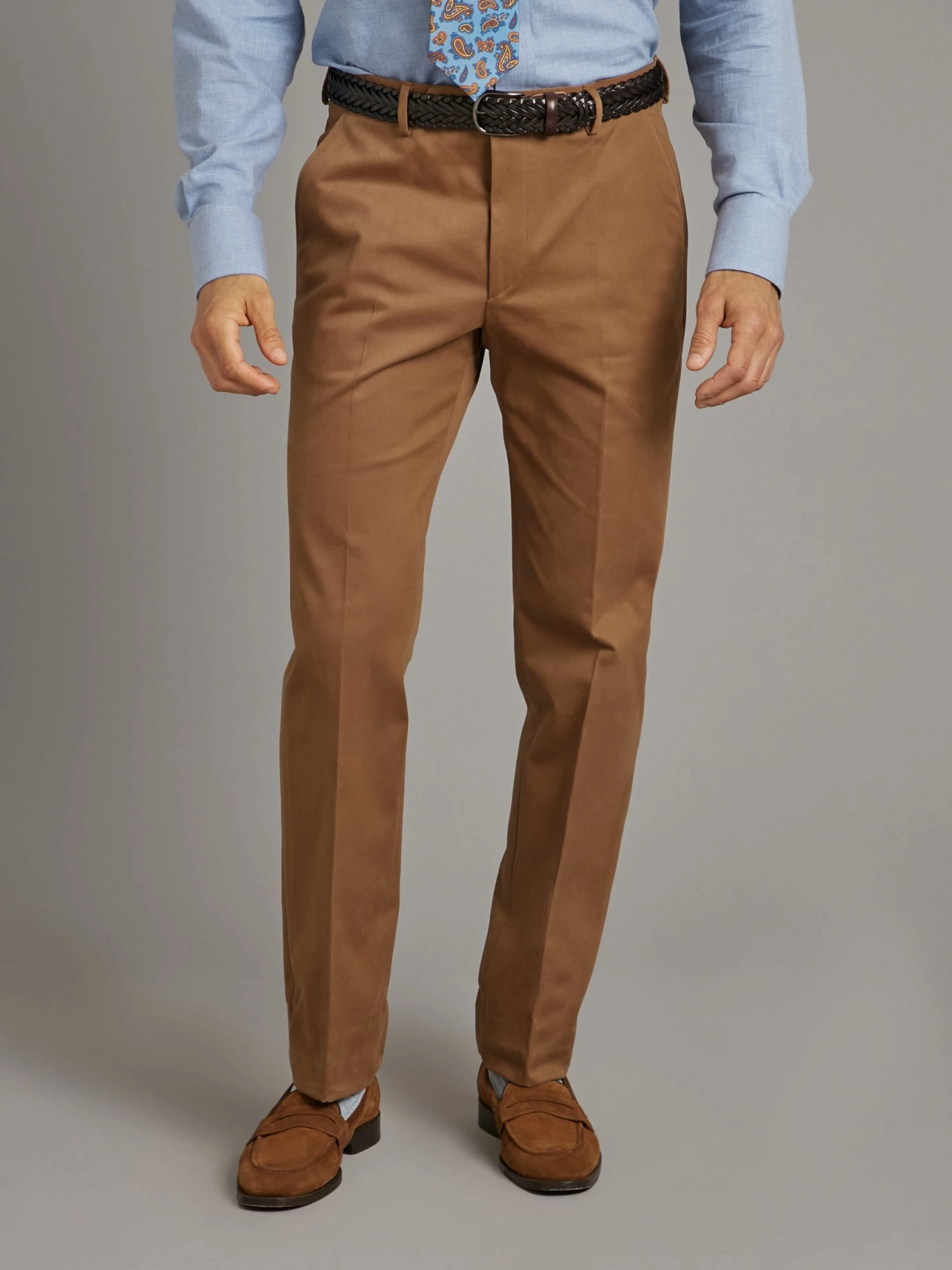 Cut for a classic fit with a flat front, our heavy 100% cotton trousers in brown have a classic fit with straight-cut legs, slanted hip pockets and welt pockets at the rear.