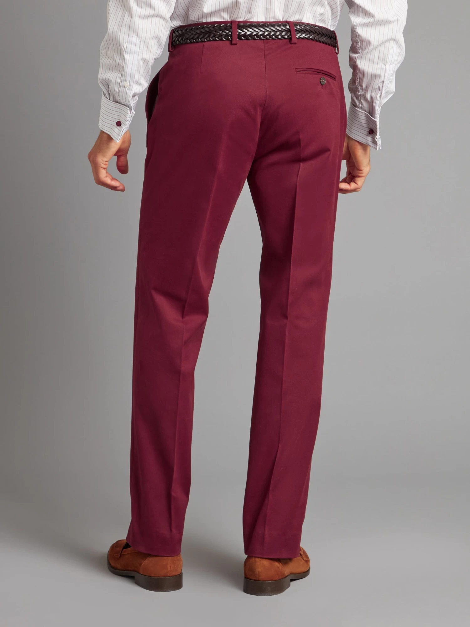 Cut for a classic fit with a flat front, our heavy cotton trousers in a classic deep mulberry colour have slanted hip pockets and welt pockets at the rear.