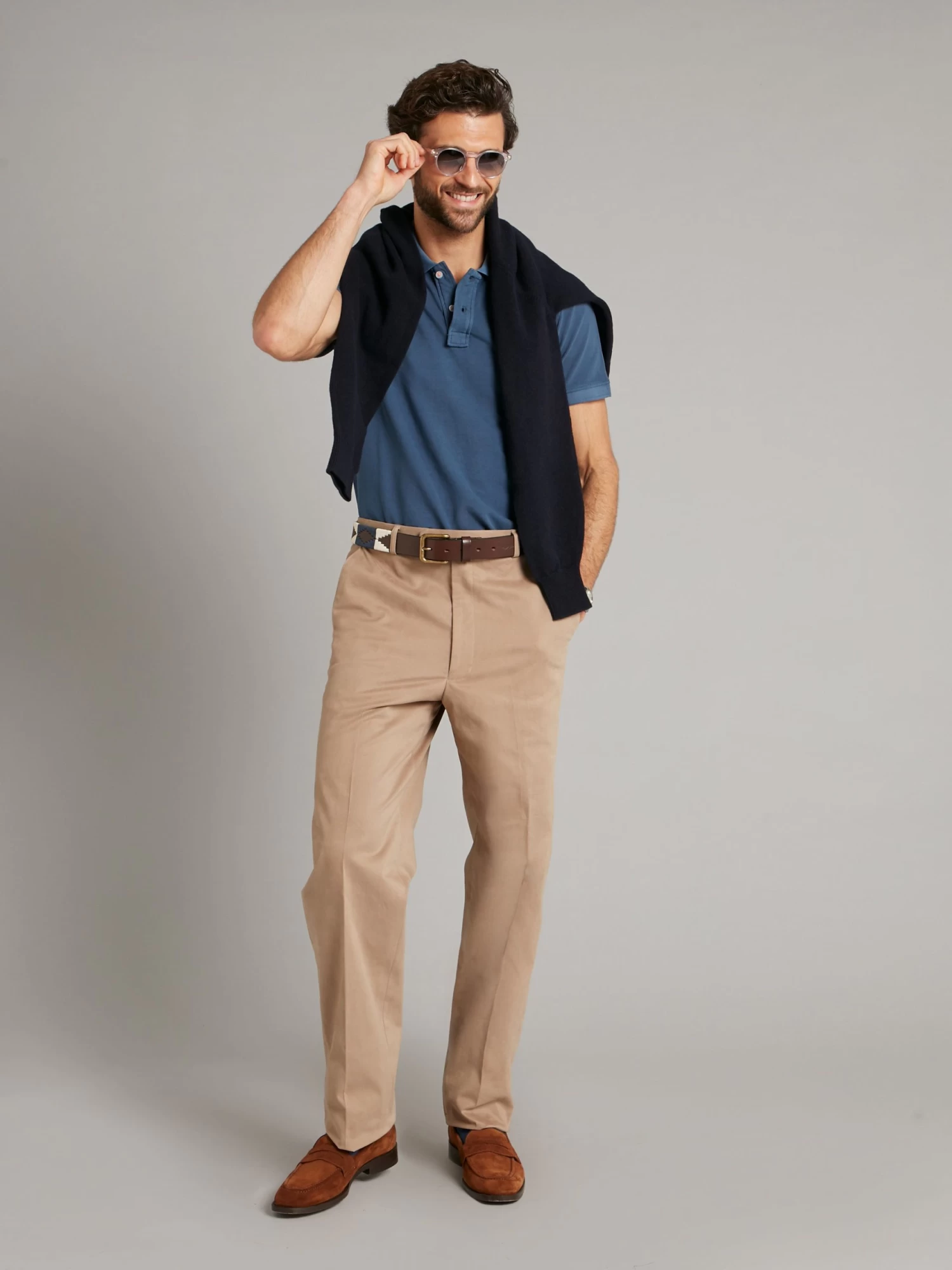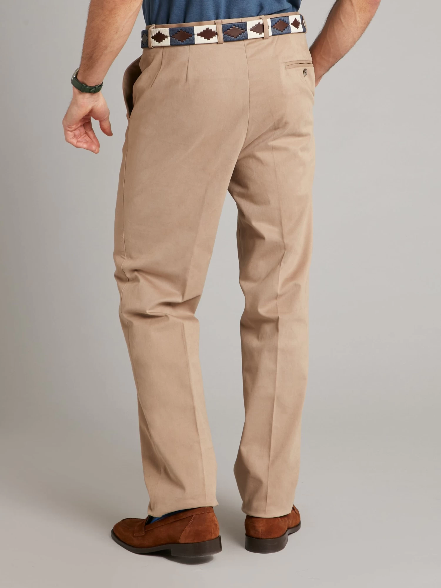Cut for a classic fit with a flat front, our heavy cotton trousers in a classic tan colour have slanted hip pockets and welt pockets at the rear.