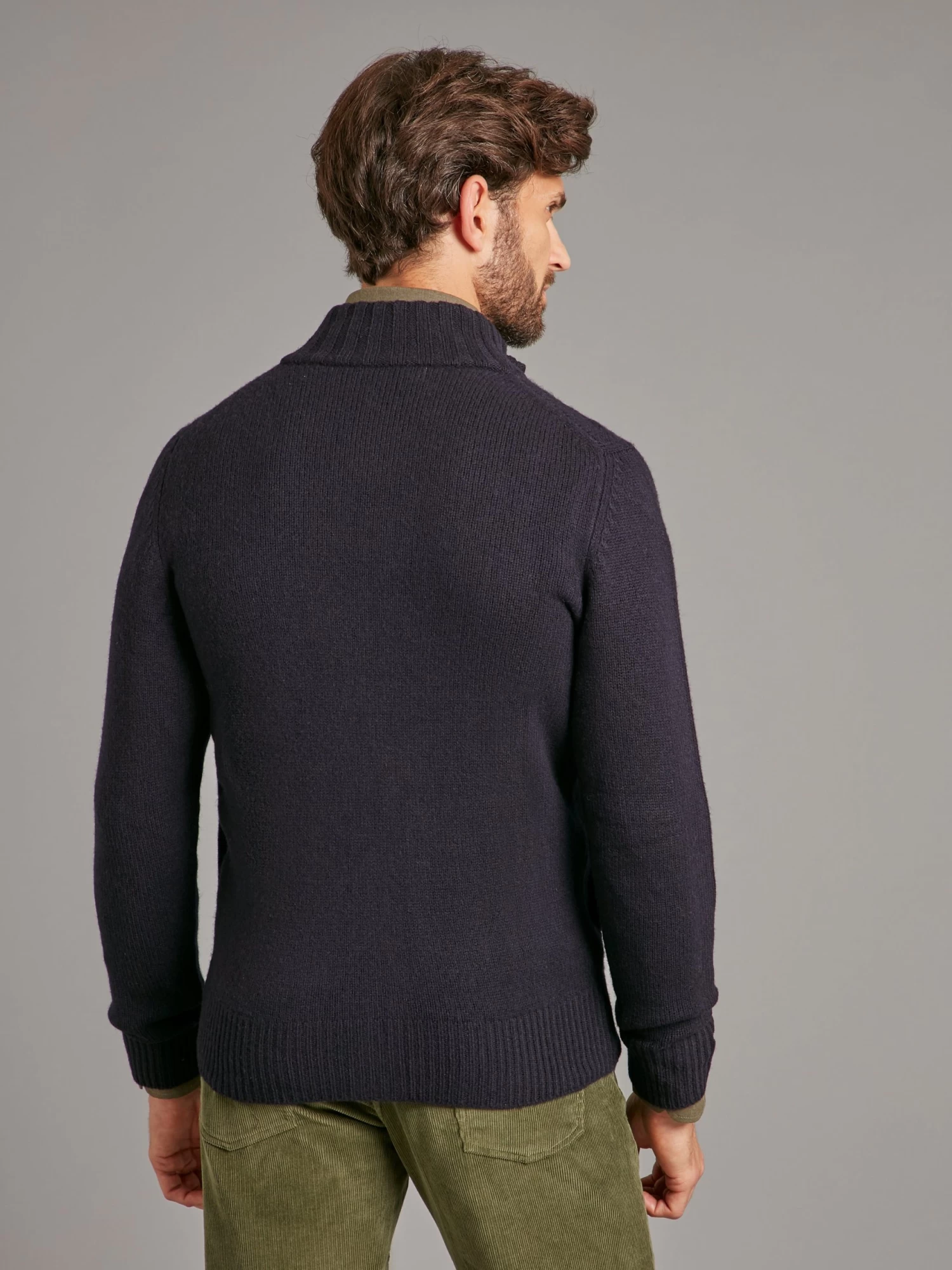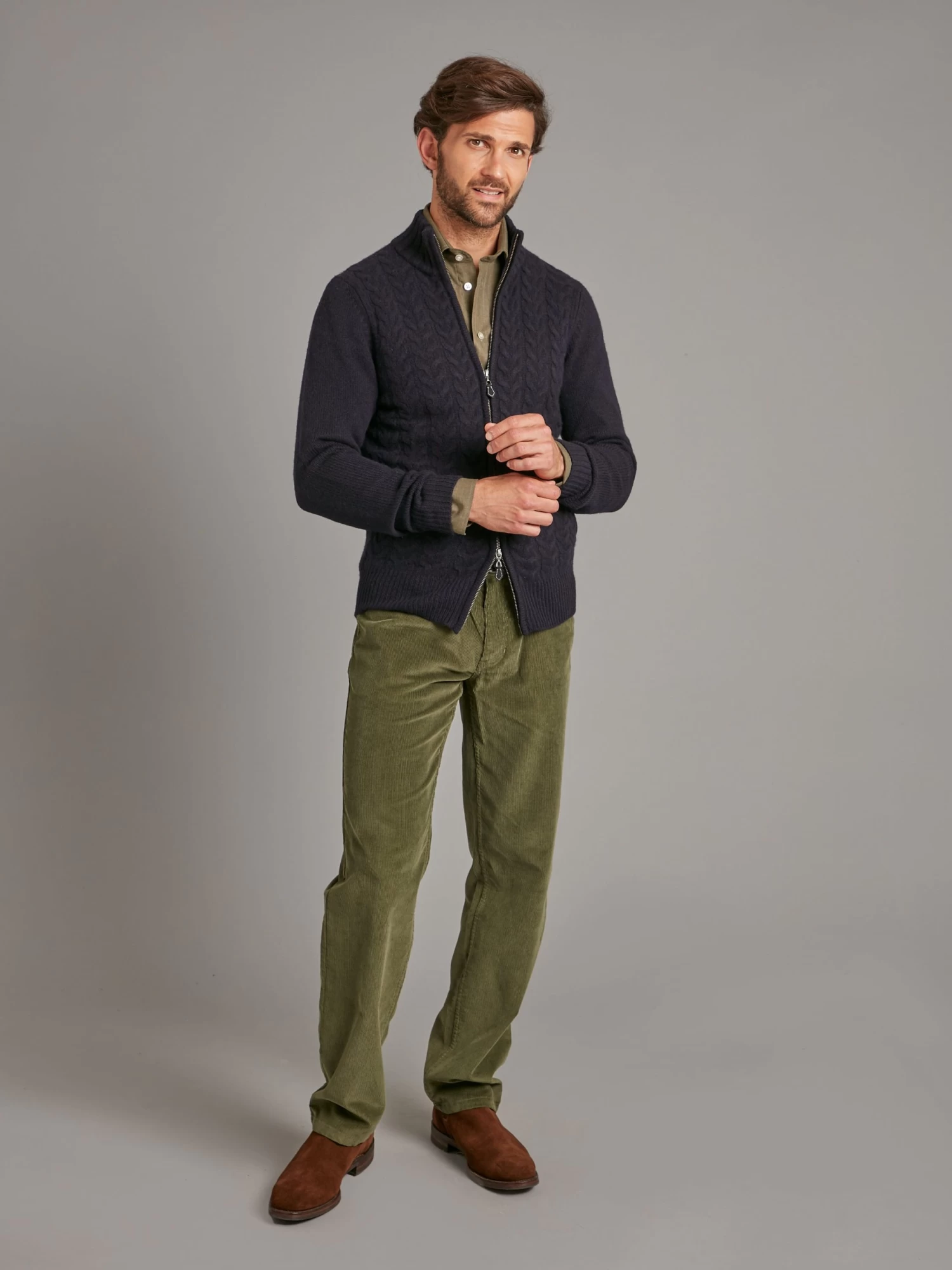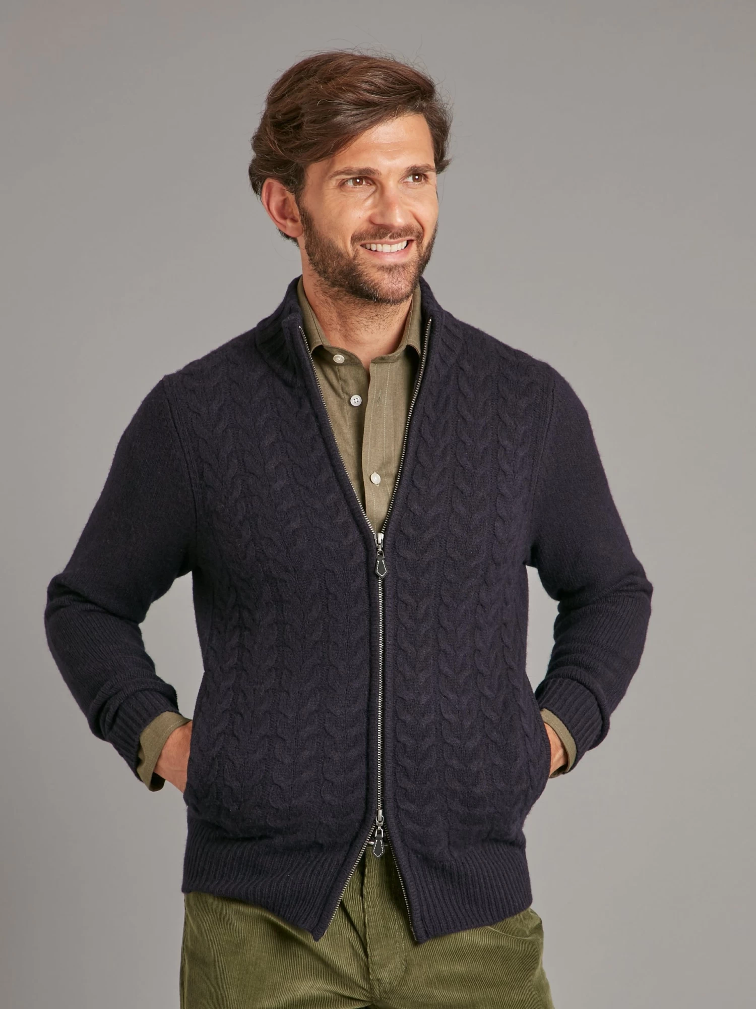 This navy 100% Lambswool Cable Knit Zip Cardigan is the perfect choice for the colder months. Crafted from the finest grade of lambswool, this cardigan provides an especially soft finish and is detailed with a timeless cable knit pattern. To keep you warm and comfortable, the cardigan features ribbed cuffs and hem as well as a high neck.