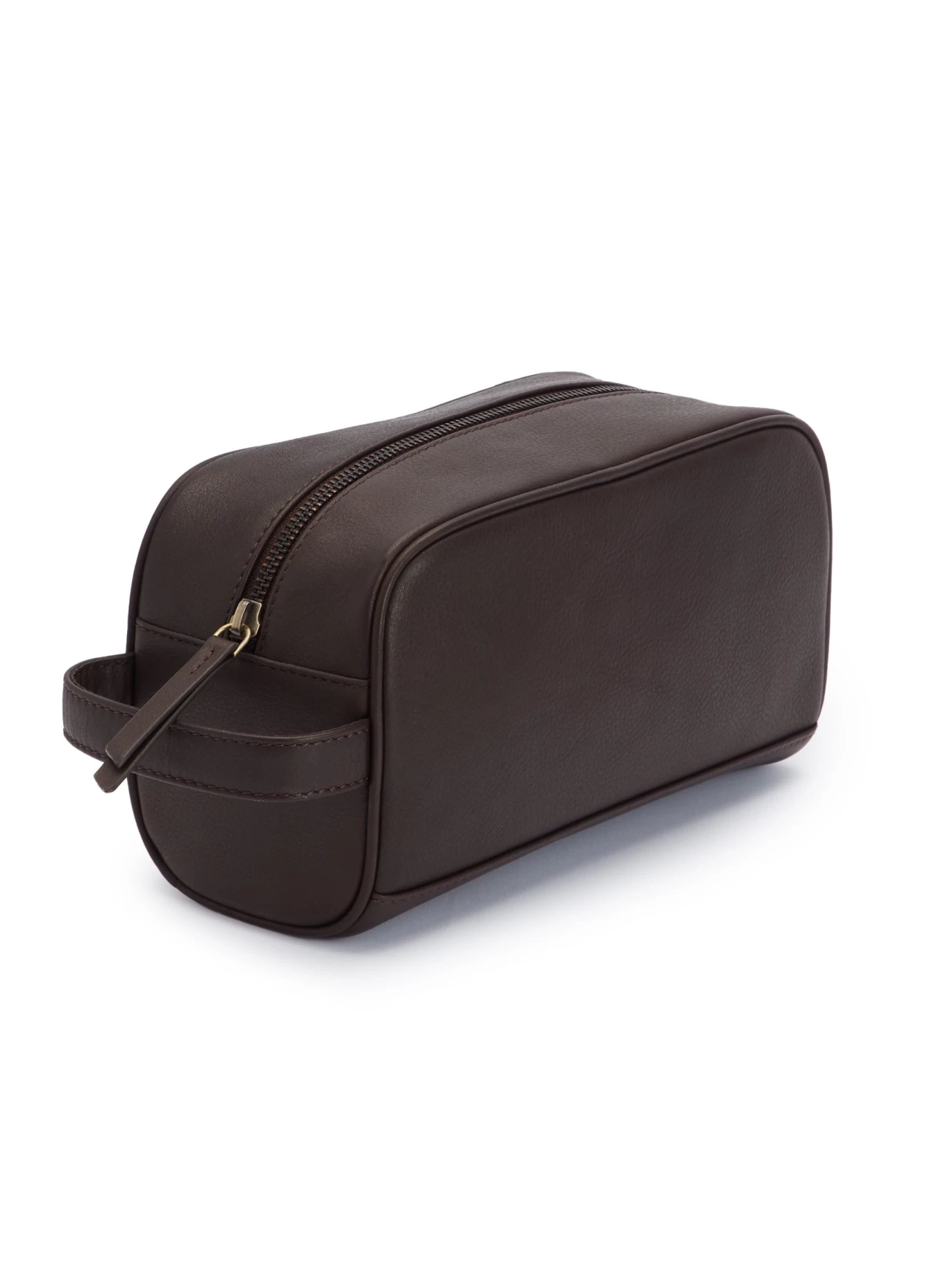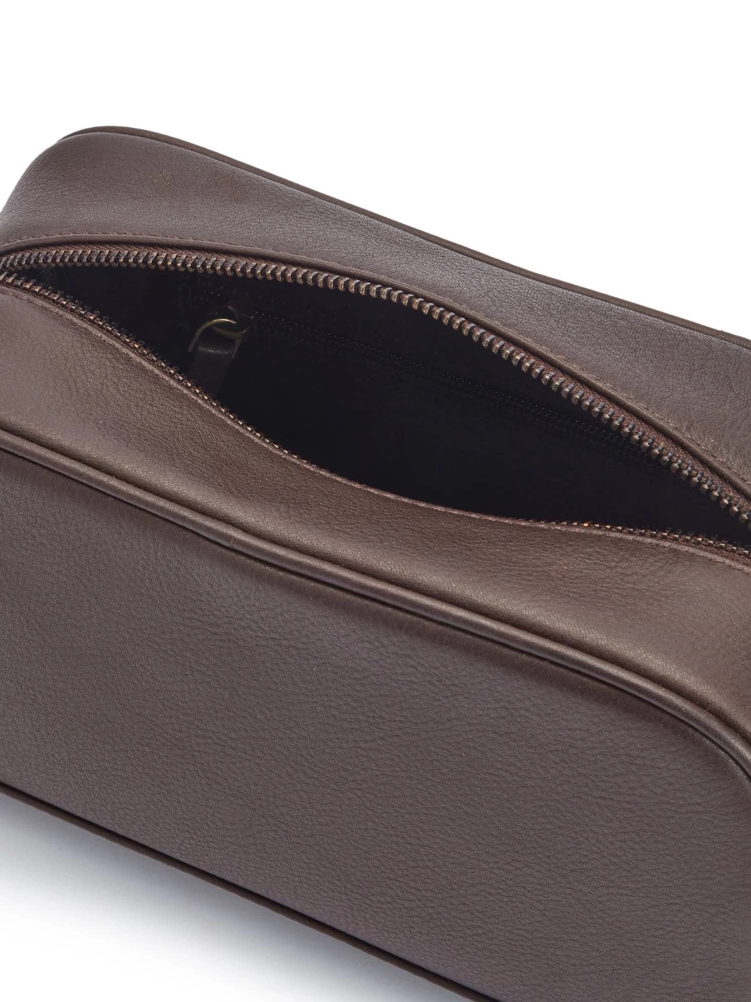 This stylish, handcrafted Leather Wash Bag in Brown is made of premium leather for durability and protection. The internal pocket with a zipper ensures contents stay secure, while the convenient leather handle allows for easy carrying. Perfect for organizing and storing your toiletries when traveling.