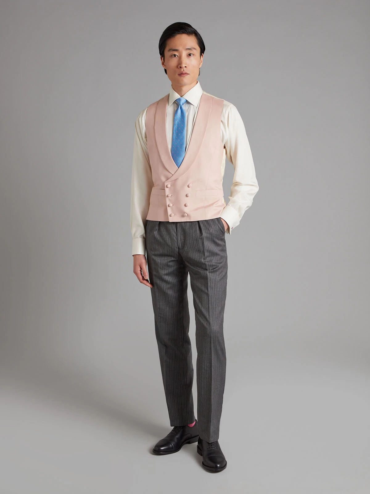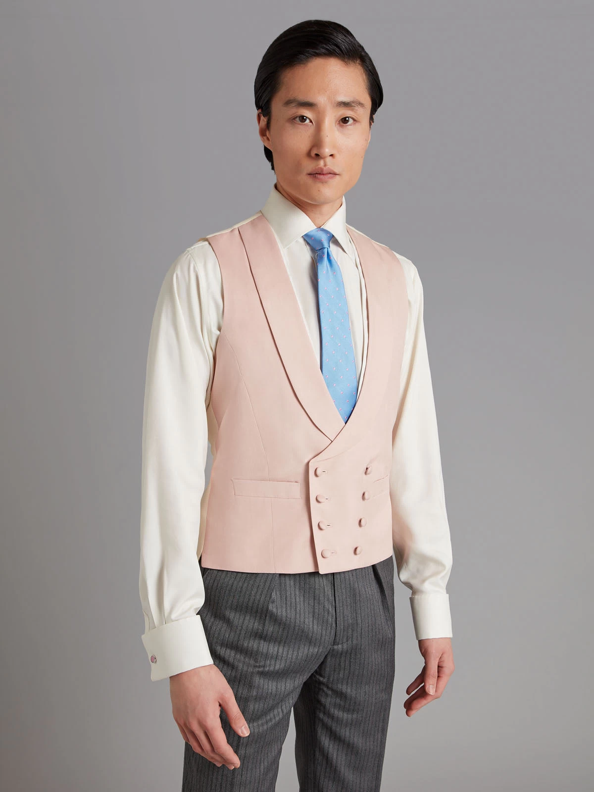 Oliver Brown’s lightweight double breasted waistcoat has a classic-fitted cut. Finished in a supple rose pink silk, it is a stalwart of traditional tailored morning wear.