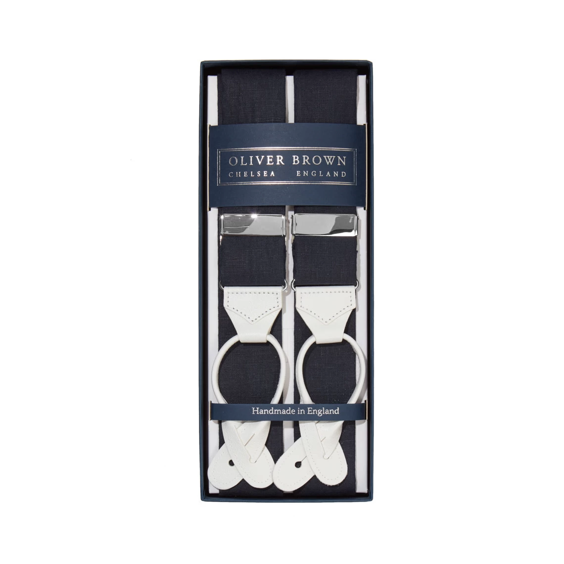 Made in England, the leather ends are hand stitched, while the back of the braces incorporate a discreet matching elasticated segment; these linen braces in navy are perfect to finish a summer suit.