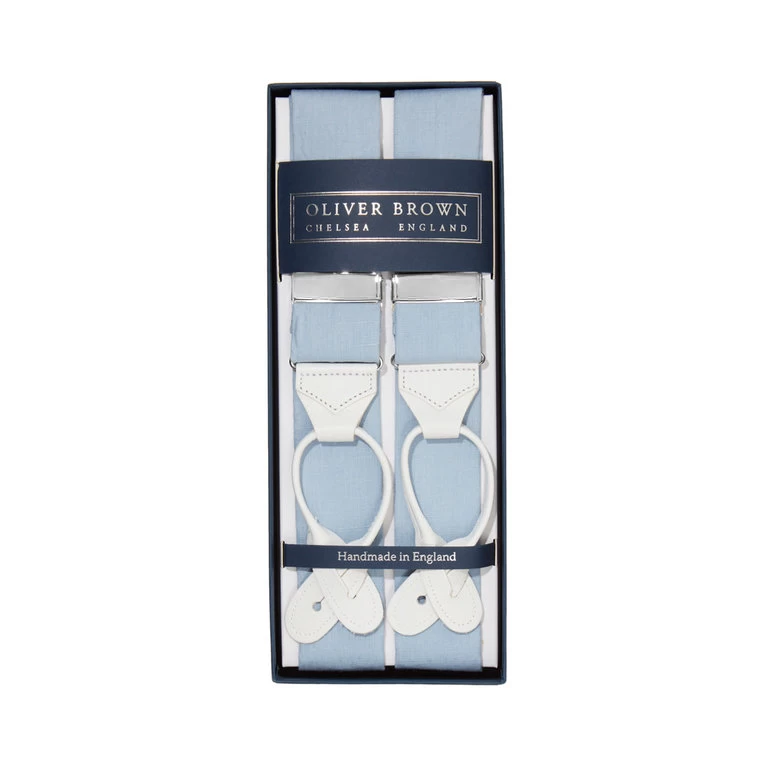 Made in England, the leather ends are hand stitched, while the back of the braces incorporate a discreet matching elasticated segment; these linen braces in sky blue are perfect to finish a summer suit.