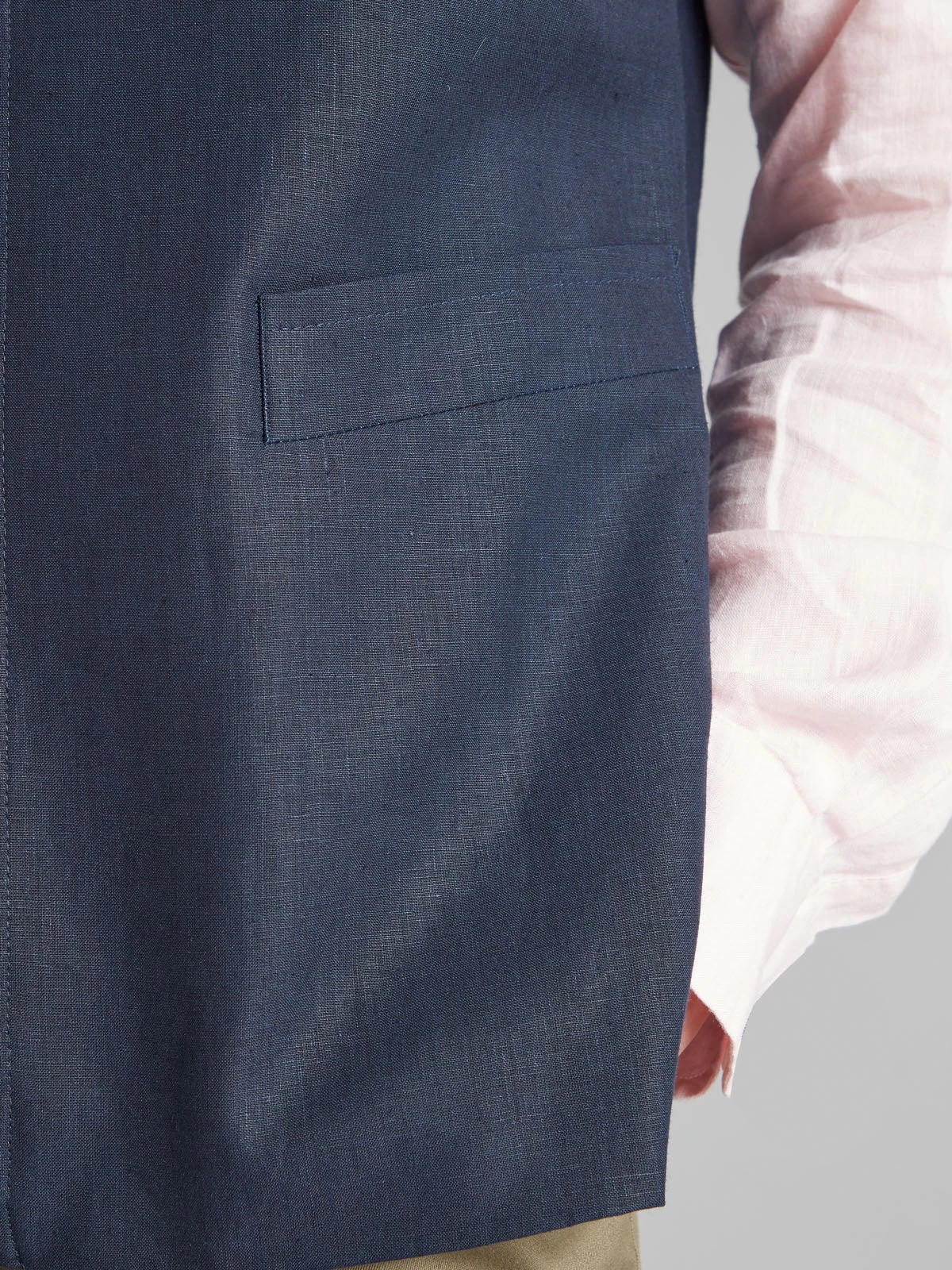 Ideal for summer, our navy linen gilet is an easily styled piece, perfect for layering. It features a Nehru collar, single welt pockets and a hidden front zip. The 225gms lightweight linen is sourced from renown Italian mill, Solbiati.