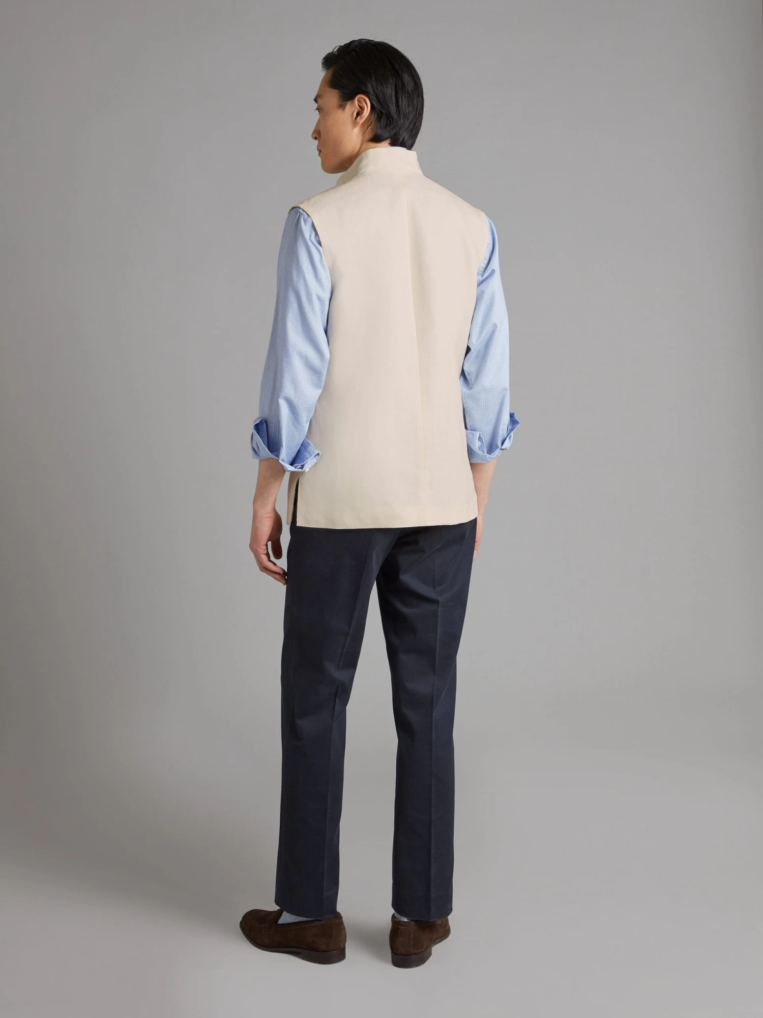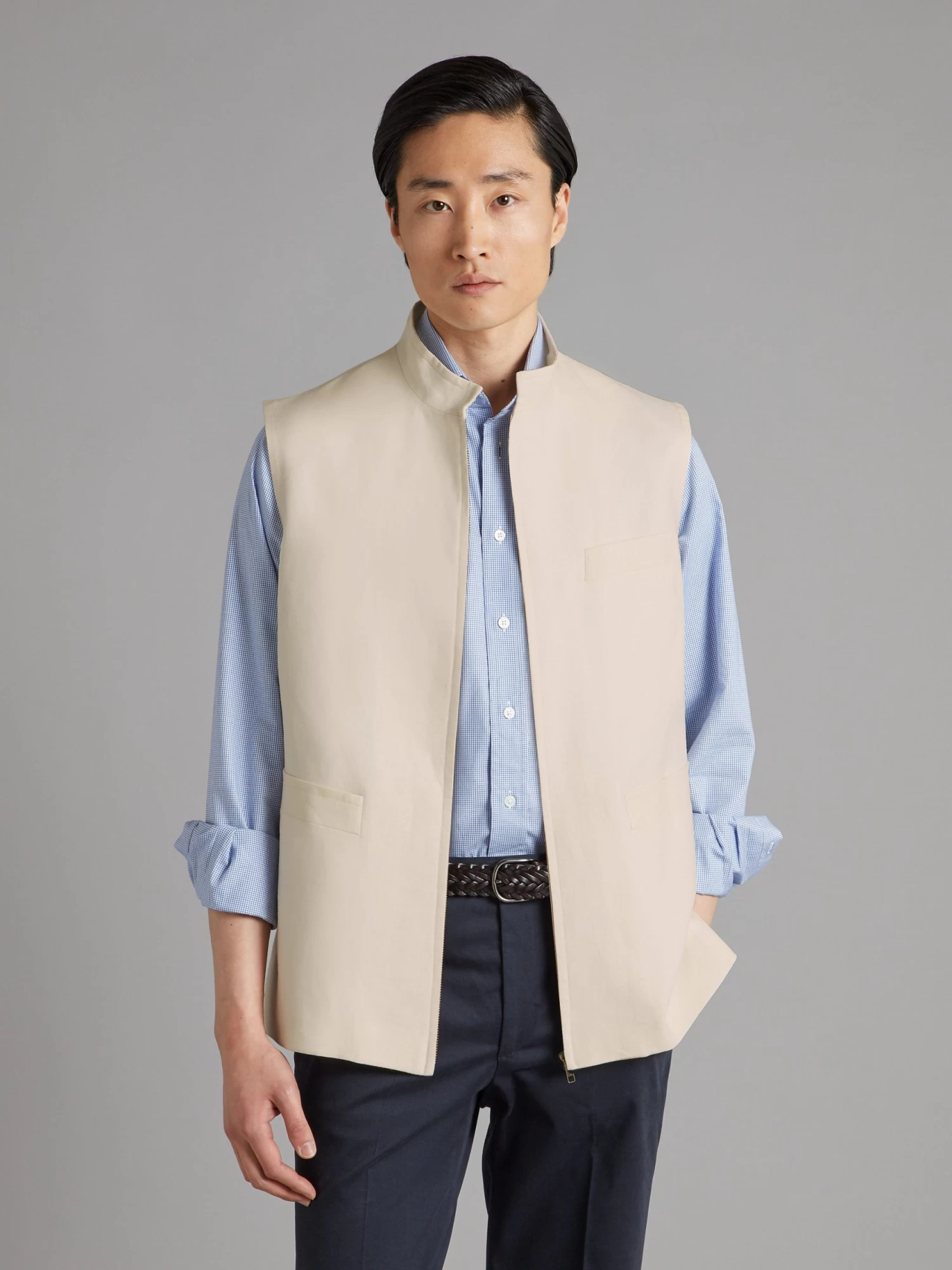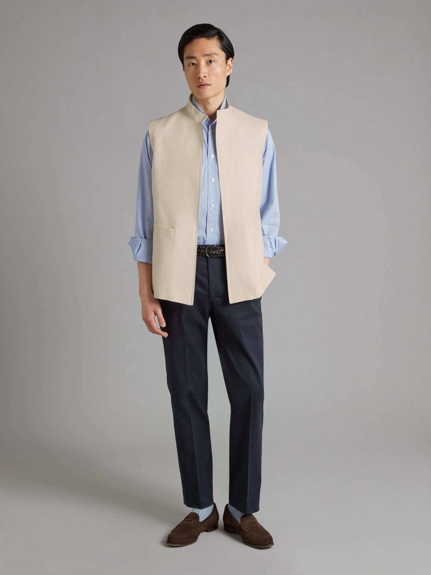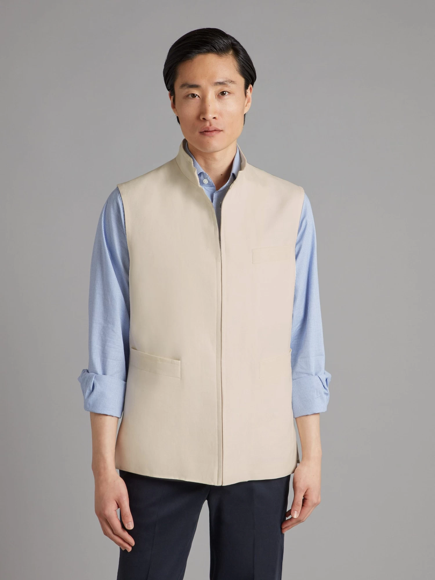 Ideal for summer, our stone linen gilet is an easily styled piece, perfect for layering. It features a Nehru collar, single welt pockets and a hidden front zip. The 225gms lightweight linen is sourced from Solbiati, now a part of Loro Piana.