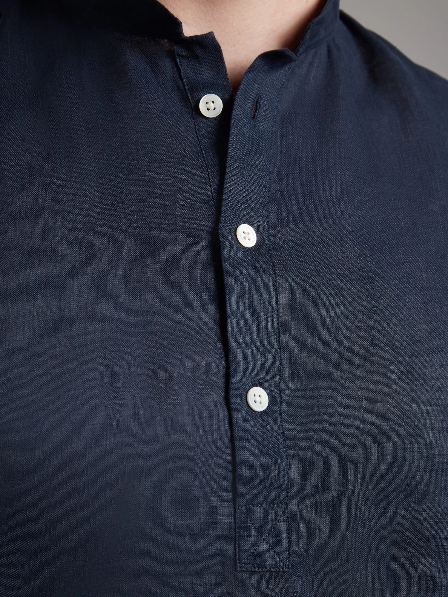 With their versatile design and timeless appeal, our linen shirts will quickly become your go-to choice for staying cool and looking sharp all season long. Pair with your favorite shorts for a relaxed, beach-ready look, or dress up with chinos for a polished, evening ensemble. This navy shirt in pure linen features a half placket and collarless design. Lightweight and breathable, it is the perfect addition to your spring/summer wardrobe.