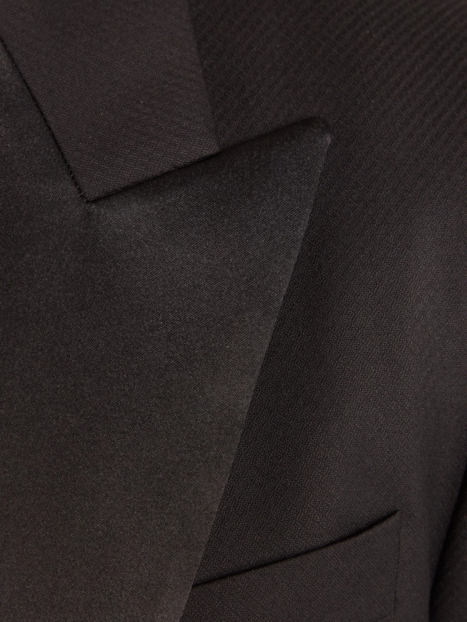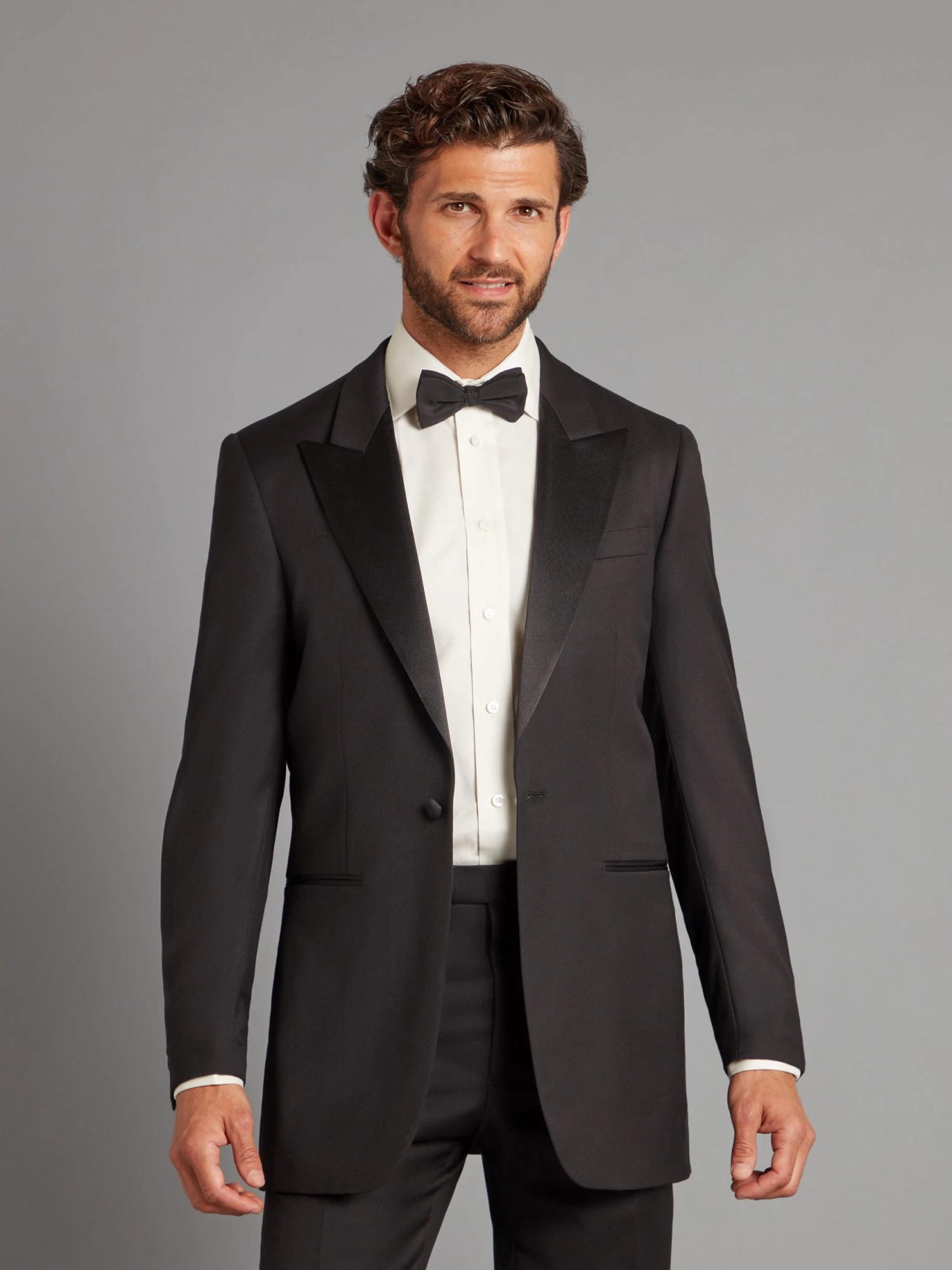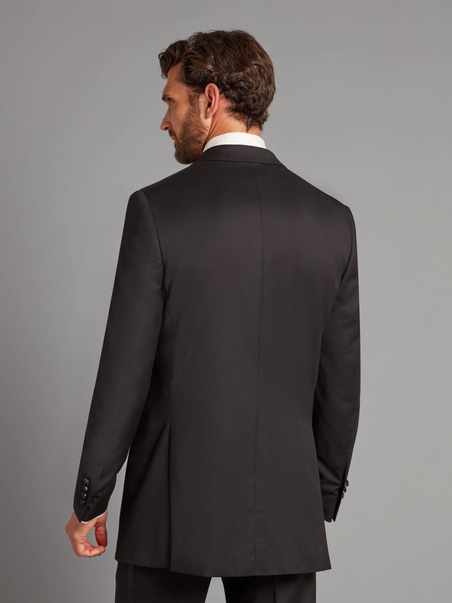 Cut in Loro Piana Super 150 wool, this Carlyle dinner suit in textured black has a luxuriously soft hand and drape.