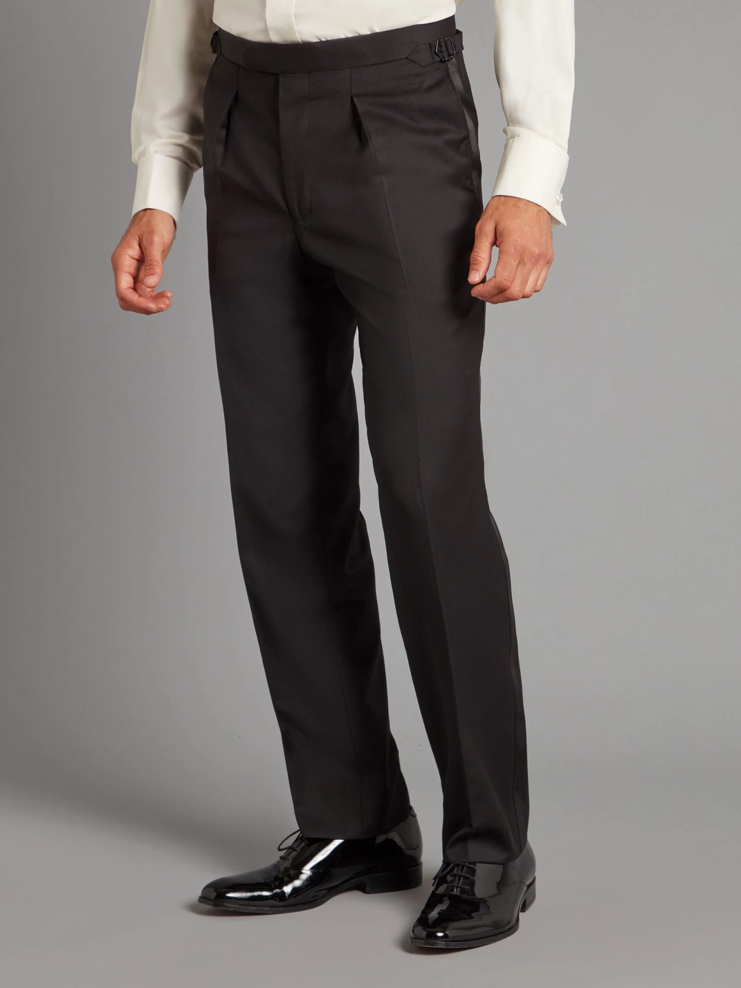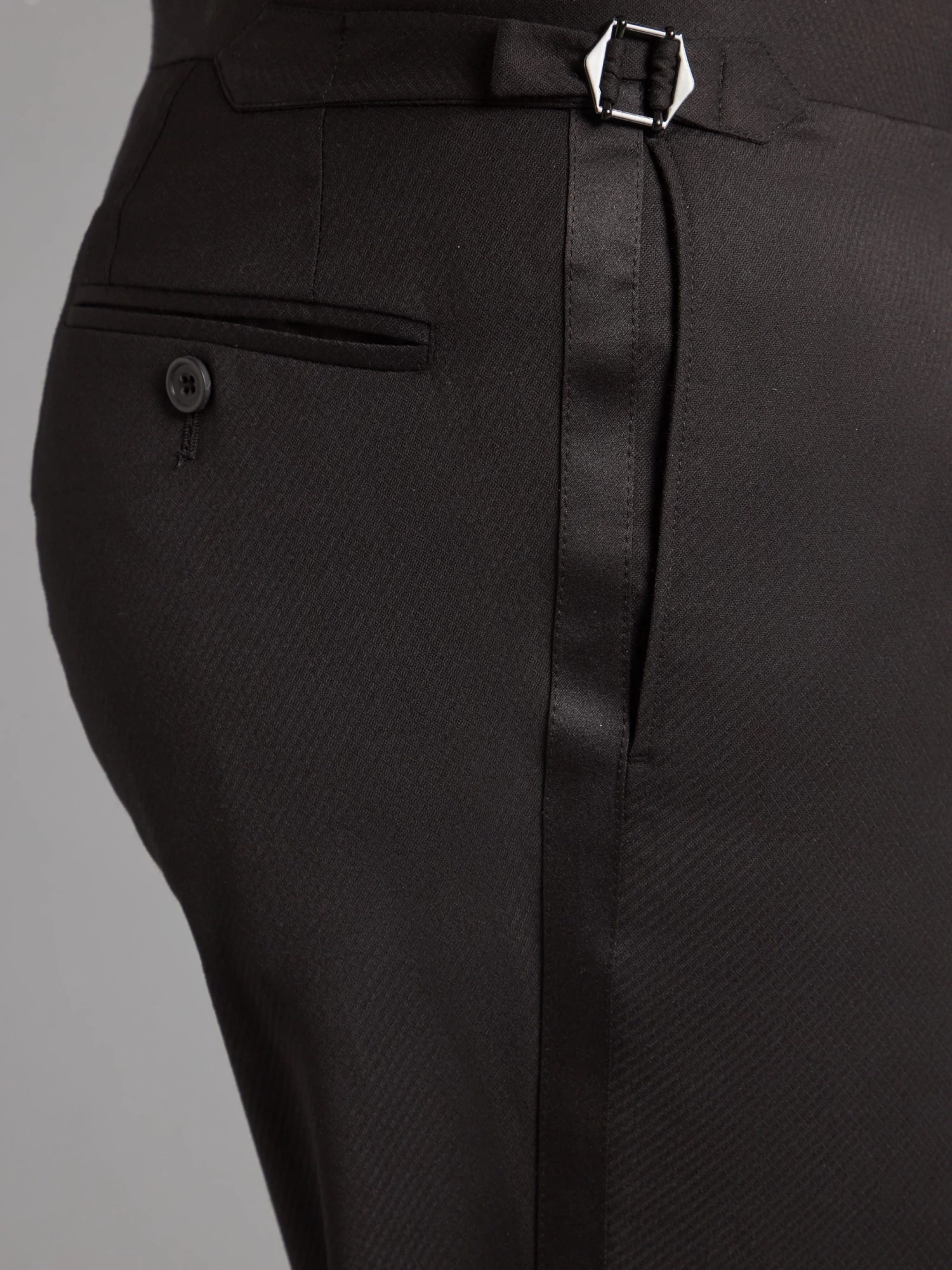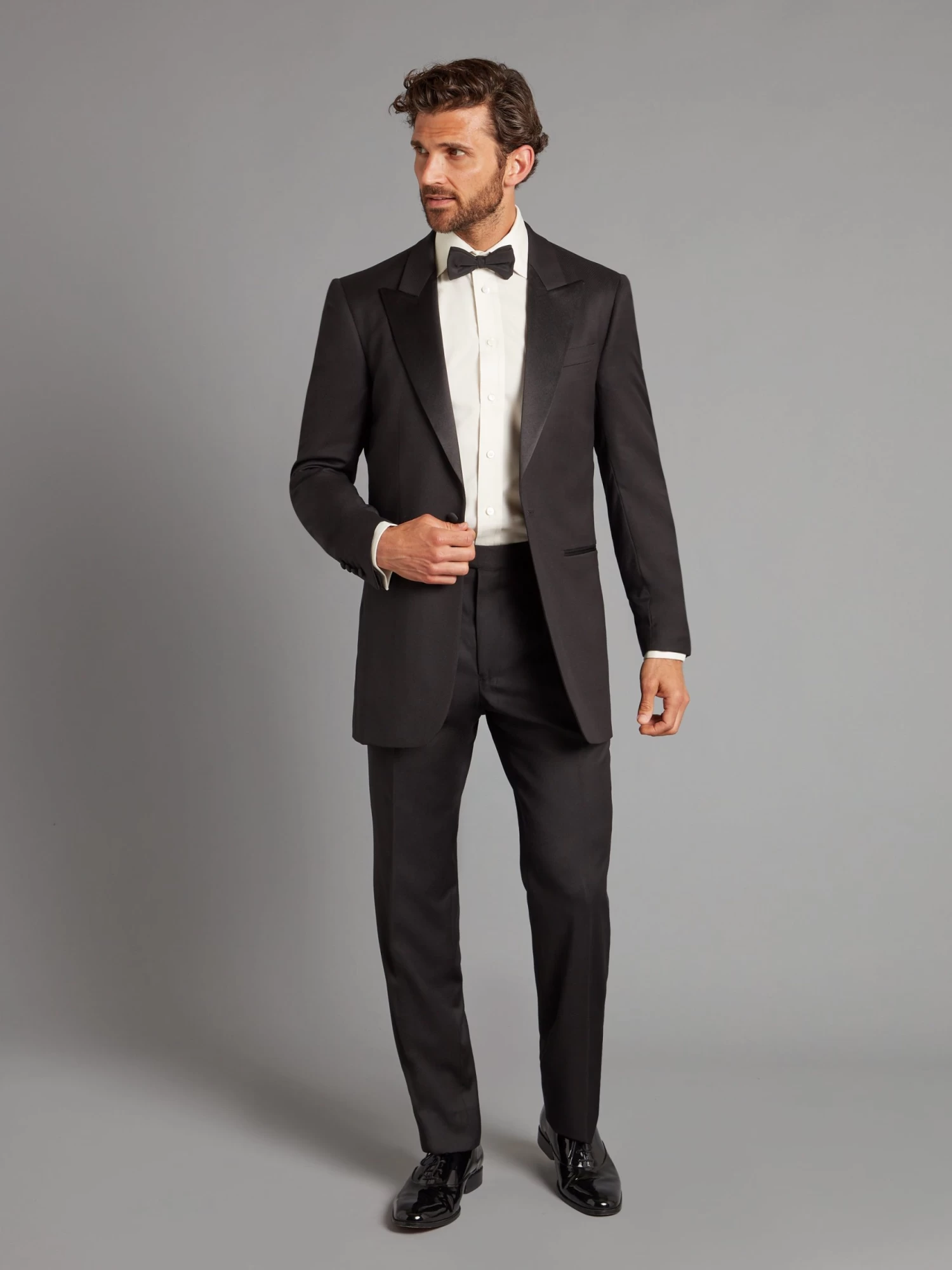 Cut in Loro Piana Super 150 wool, this Carlyle dinner suit in textured black has a luxuriously soft hand and drape.