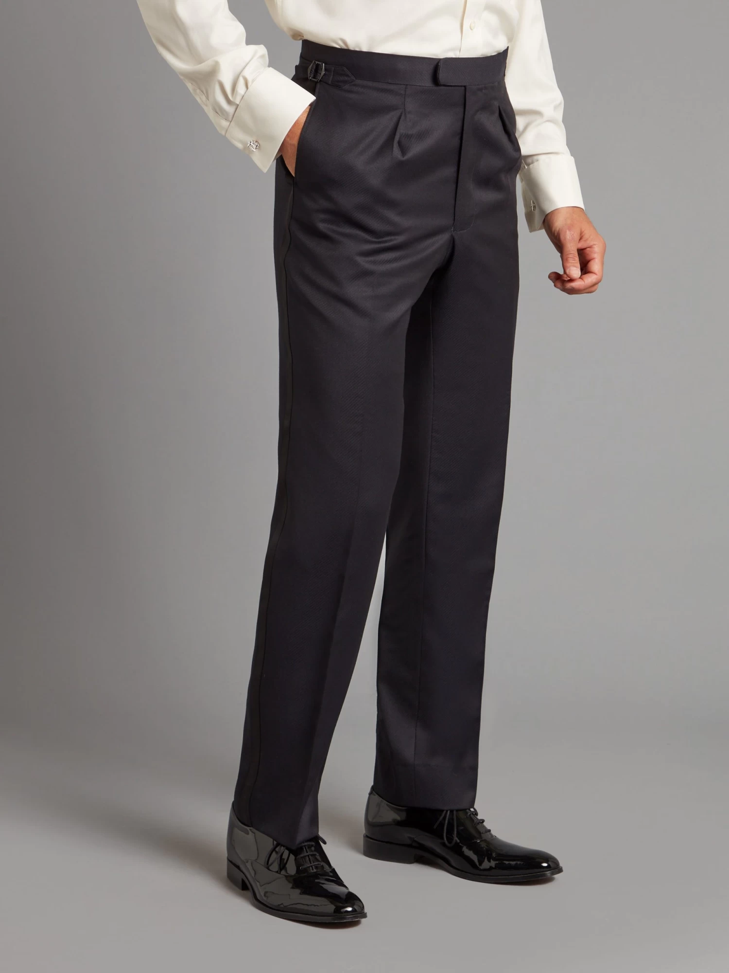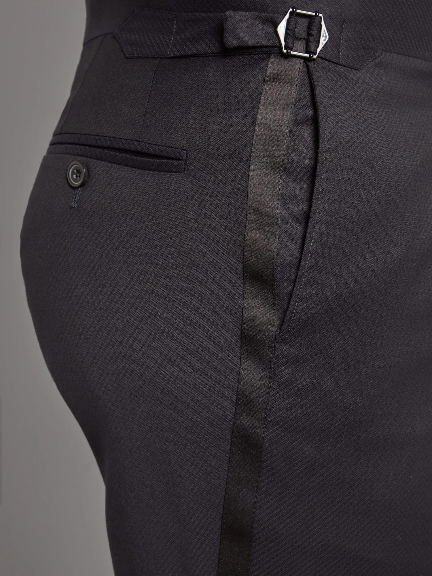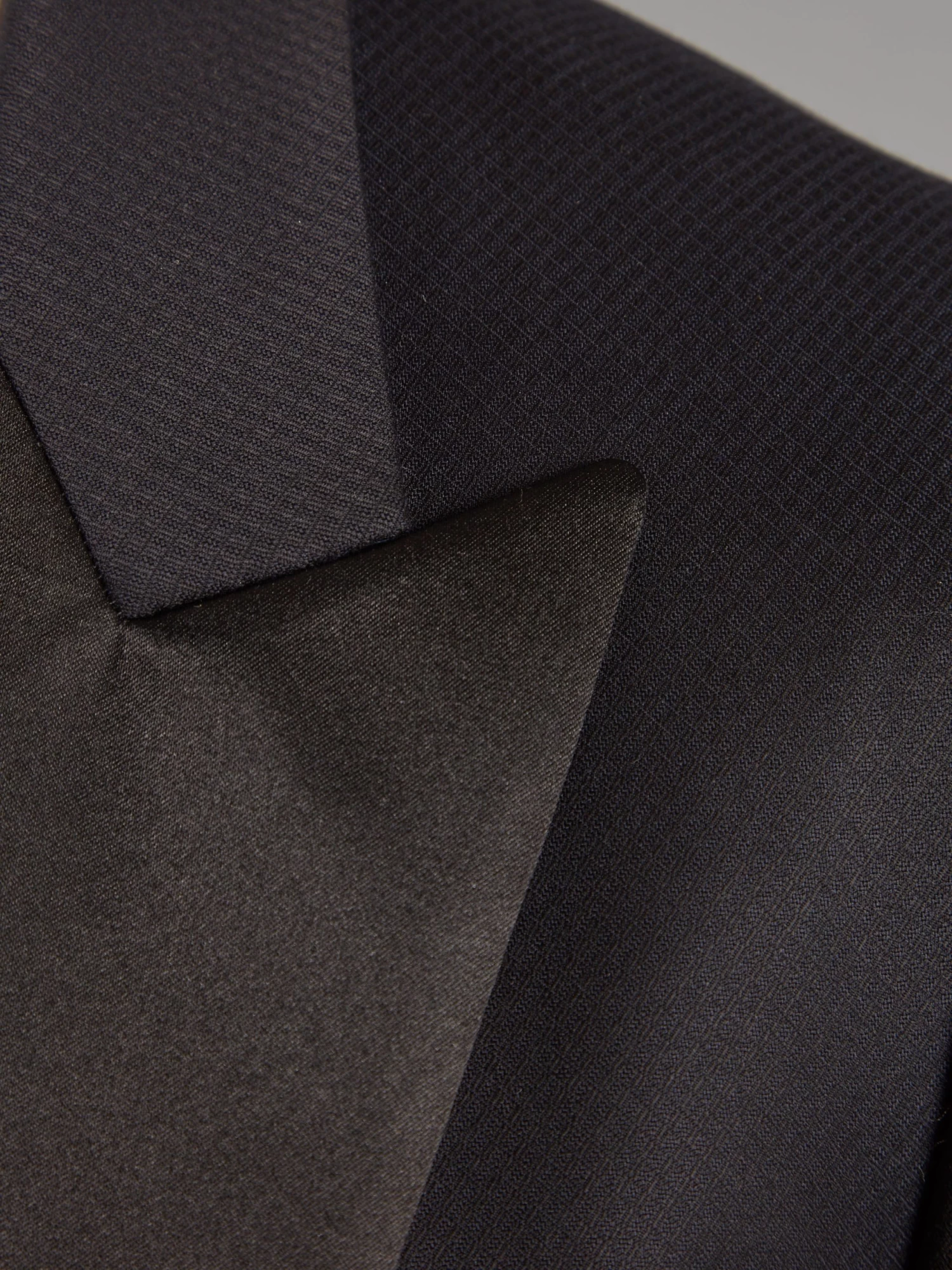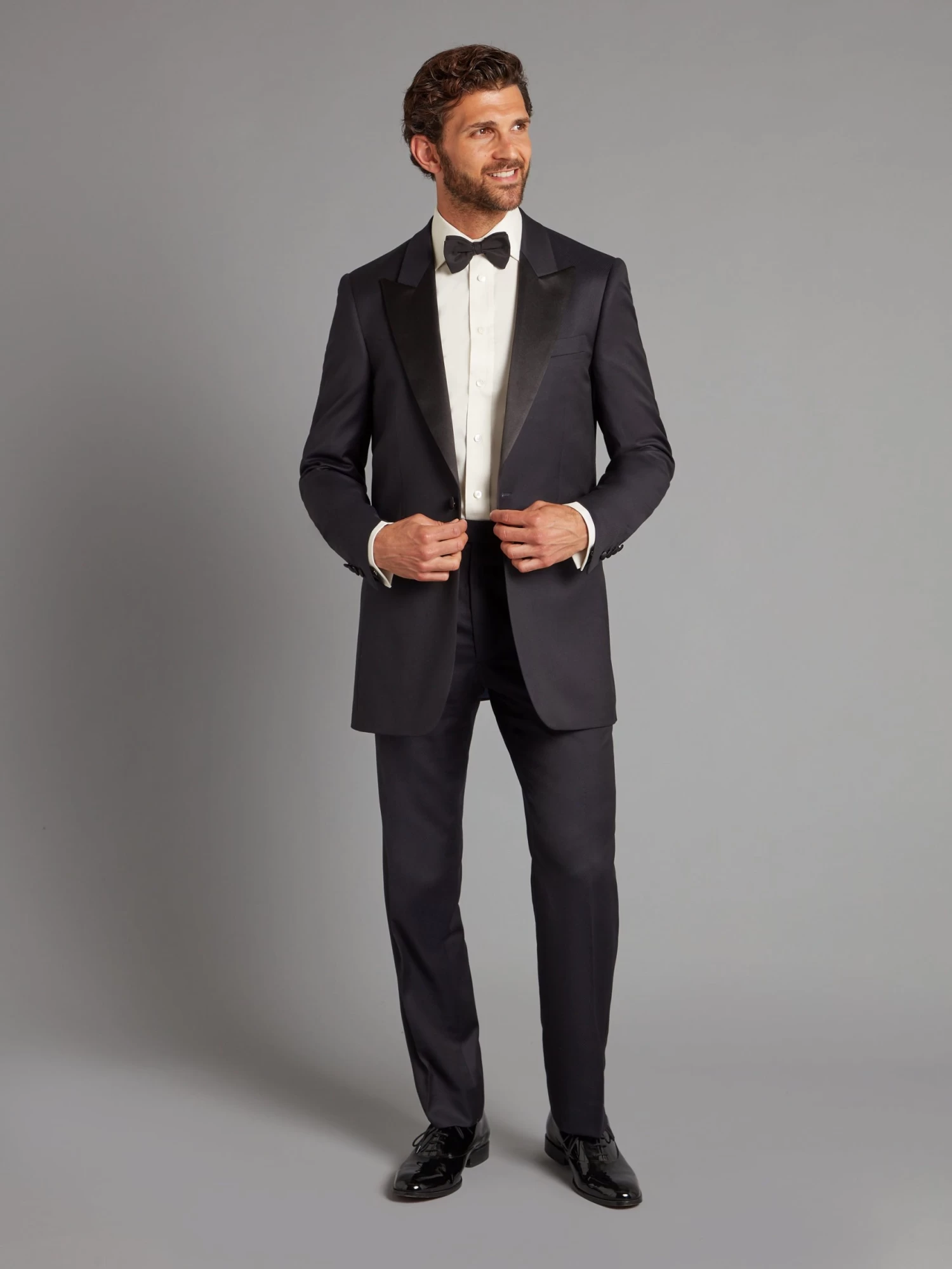 Cut in Loro Piana Super 150 wool, this Carlyle dinner suit in textured midnight navy has a luxuriously soft hand and drape.