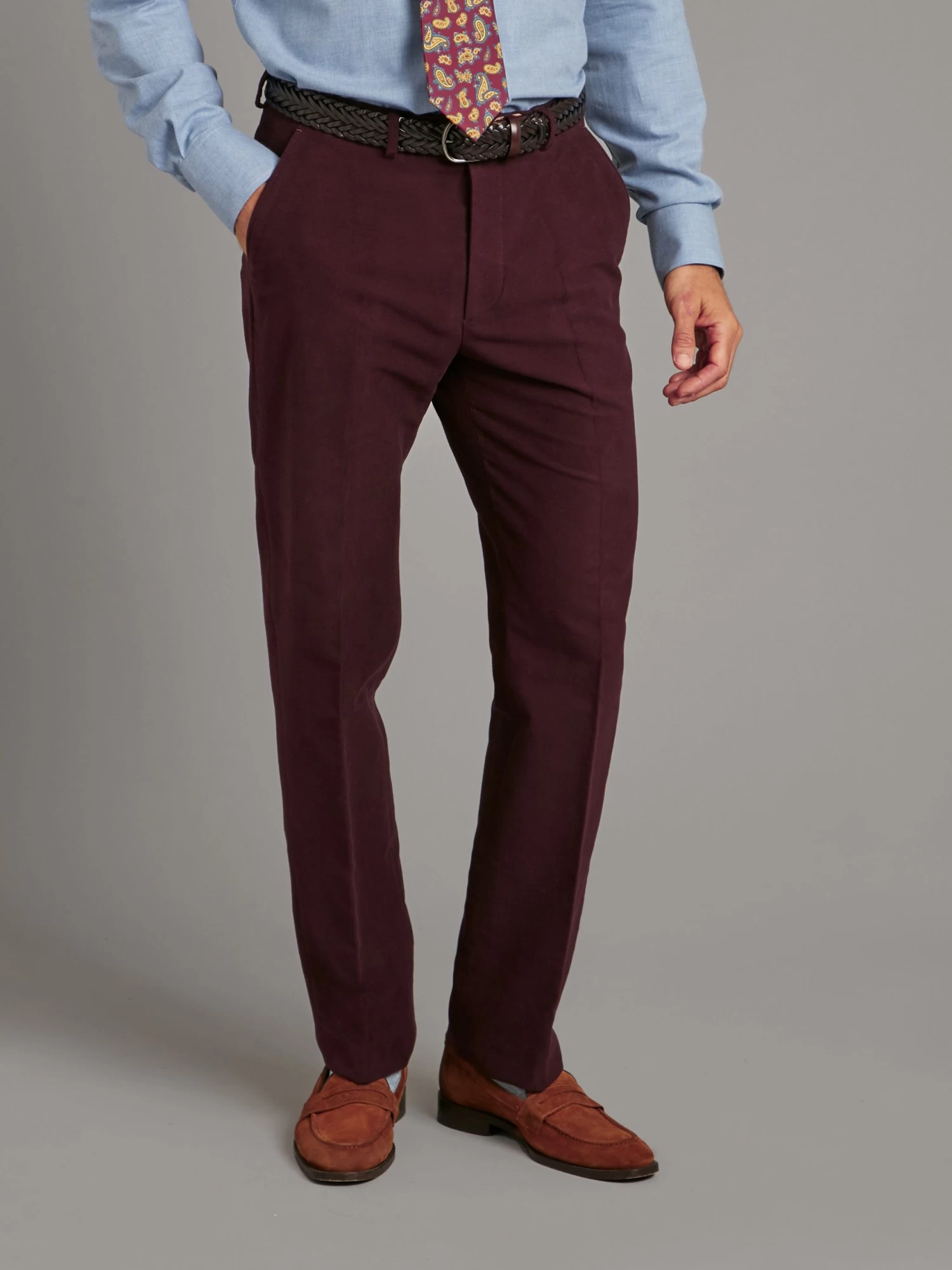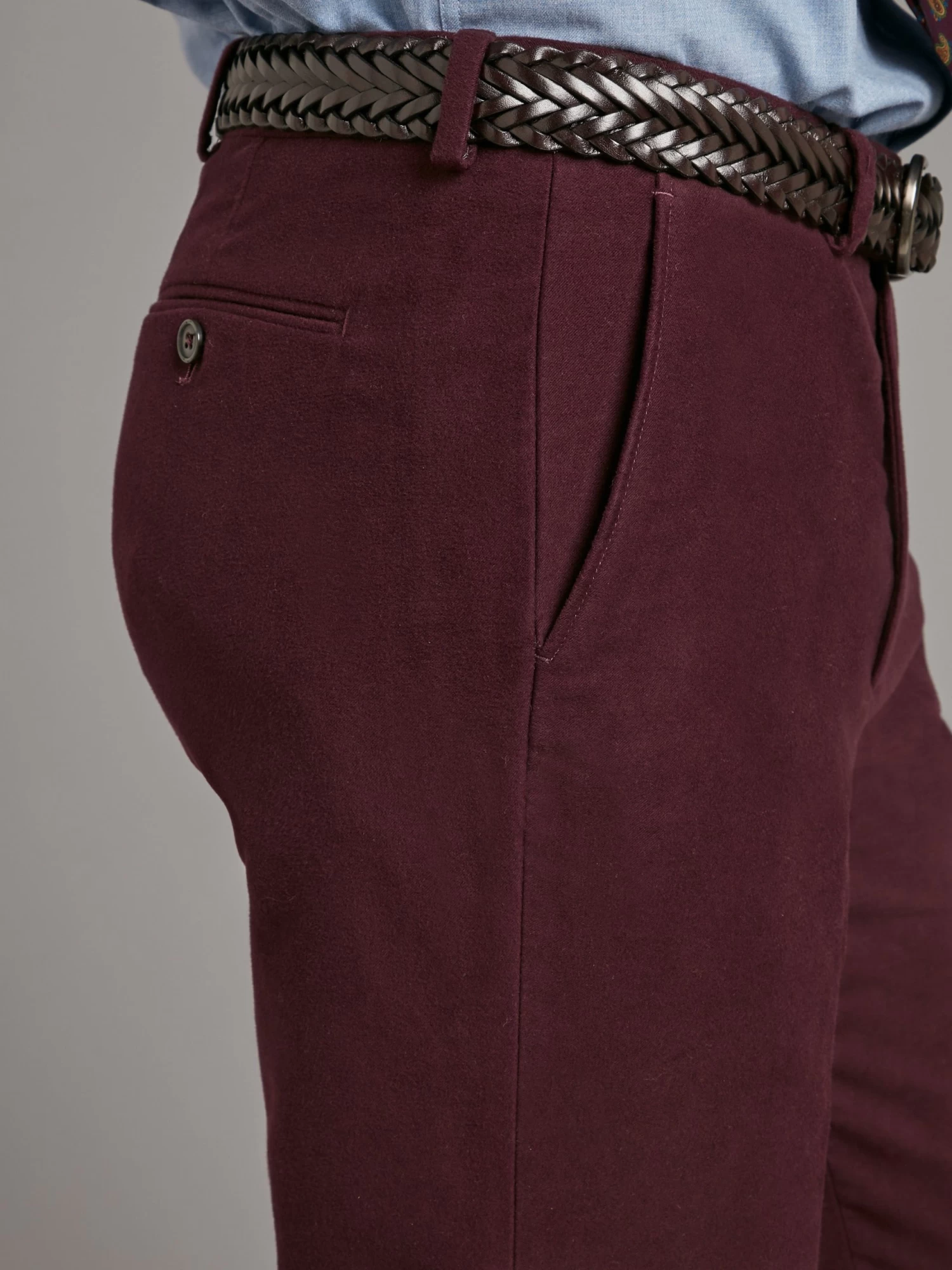 These wine colored moleskin trousers are crafted from 100% durable and luxuriously soft cotton; featuring a flat front style, slanted pockets and belt loops; they come unfinished, but can be hemmed for an additional charge.