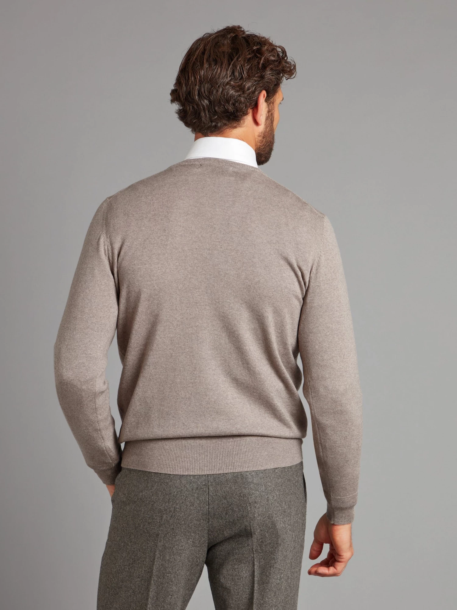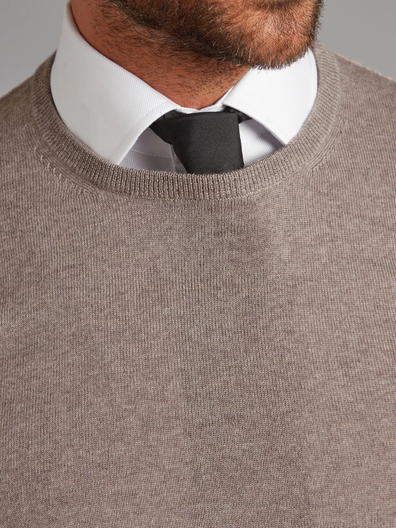 This classic crew neck jumper in a soft fawn brown, is fully fashioned and made from the finest grade of merino wool for a soft and enduring finish. Available in a spectrum of colourful shades this jumper is a timeless wardrobe essential.