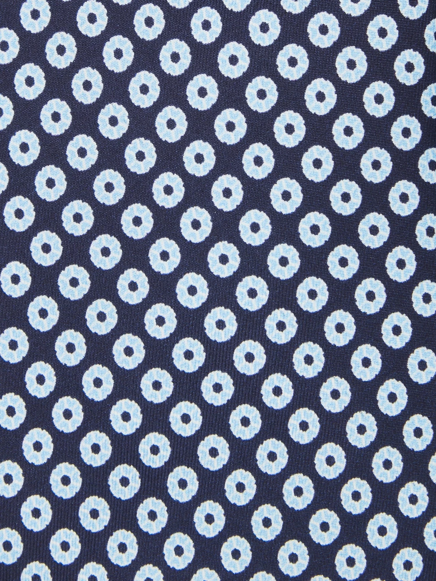 Complete the look with this navy silk tie featuring a mini medallion motif. Made with the highest craftsmanship and attention to detail, it’s the perfect accessory for any occasion, guaranteed to add a touch of elegance and personality to your outfit.