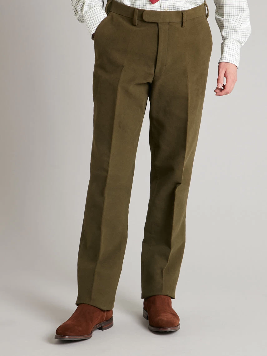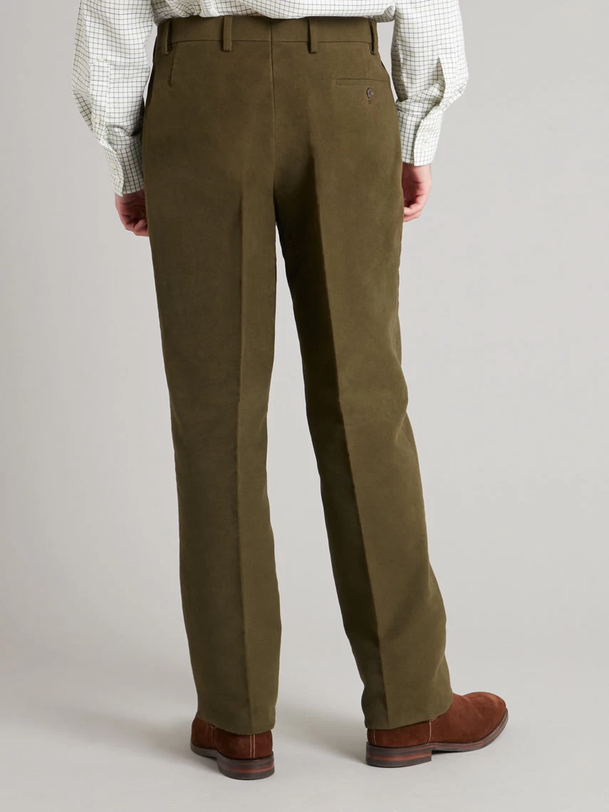 These olive trousers are made from an especially soft but hard-wearing grade of moleskin. Cut for a classic fit with a flat front, slanted hip pockets, and welt pockets at the rear. The trousers are unfinished but can be hemmed for an additional charge.