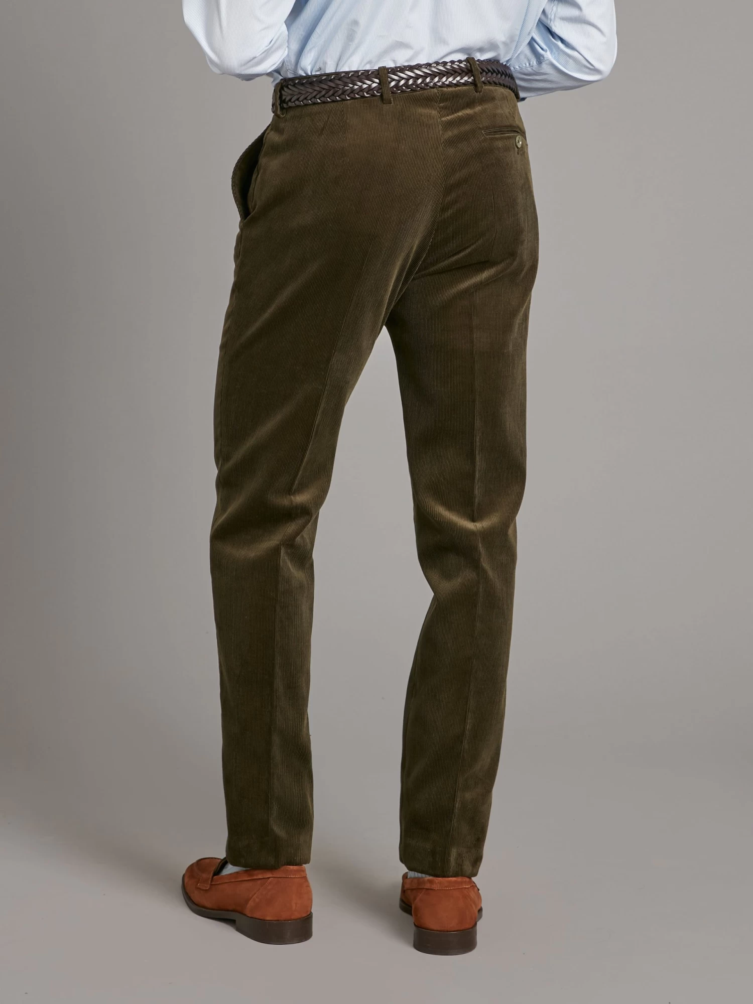 Made of twelve-wale needlecord, these 100% cotton olive trousers are durable, soft and warm. Cut for a classic fit with a flat front, slanted hip pockets and welt pockets at the rear.