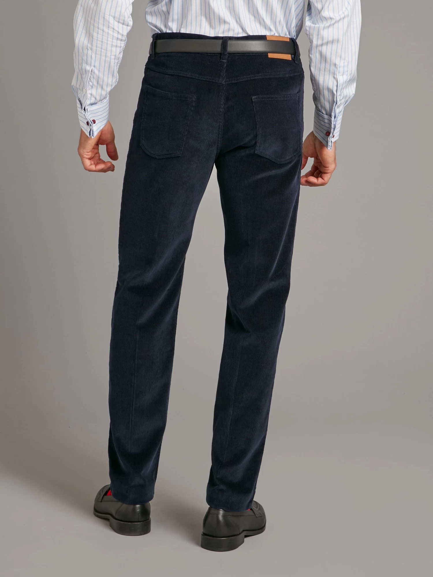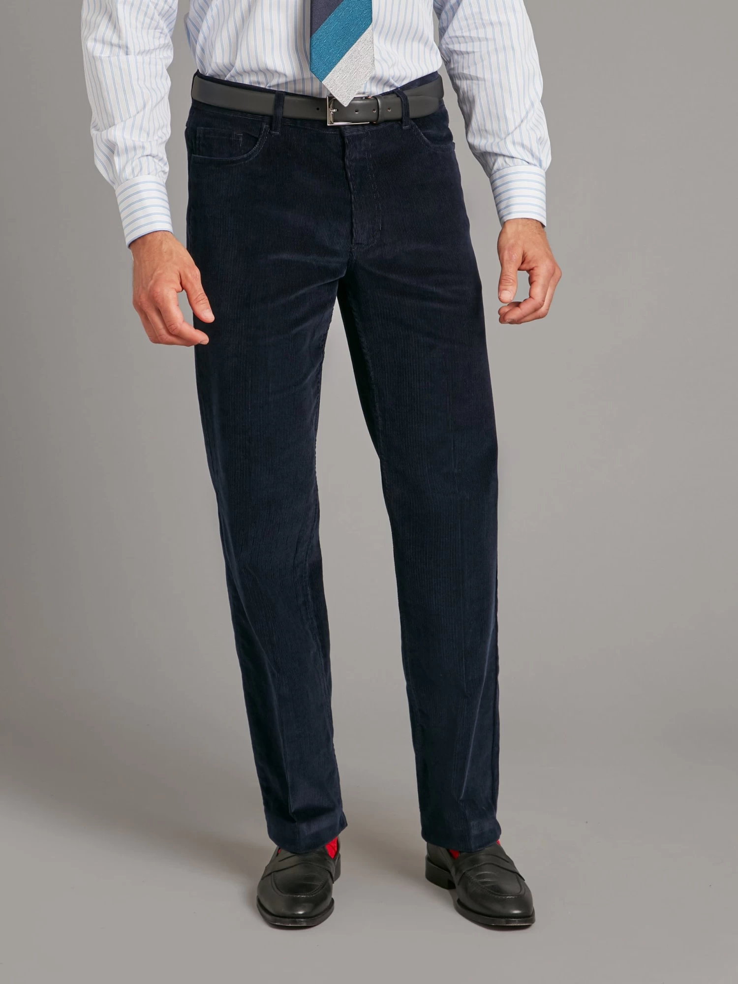 Made of twelve-wale needlecord, these durable navy trousers are especially soft and warm. Cut for a classic fit with a flat front, slanted hip pockets and welt pockets at the rear. The trousers are unfinished, but can be hemmed for an additional charge.