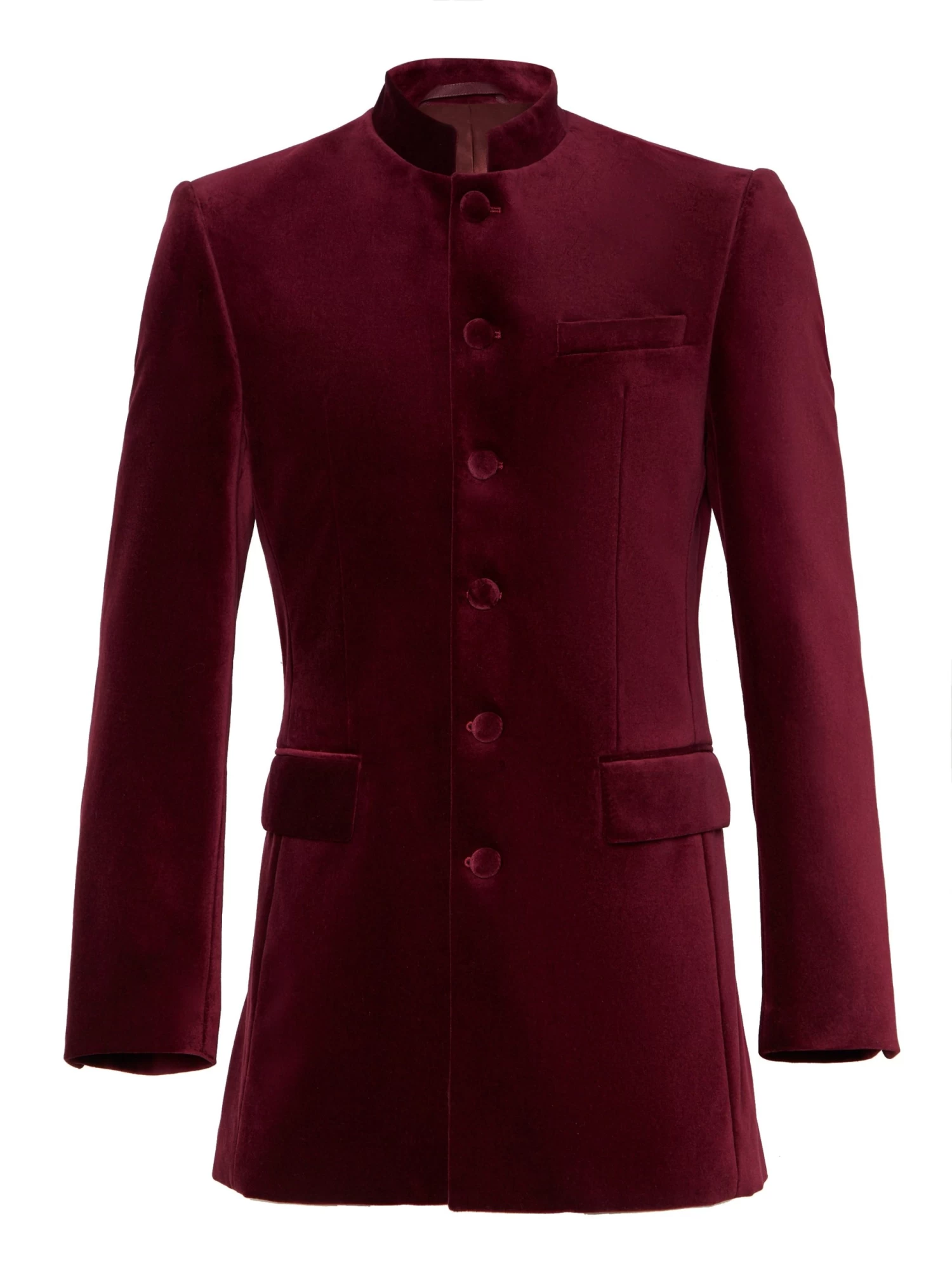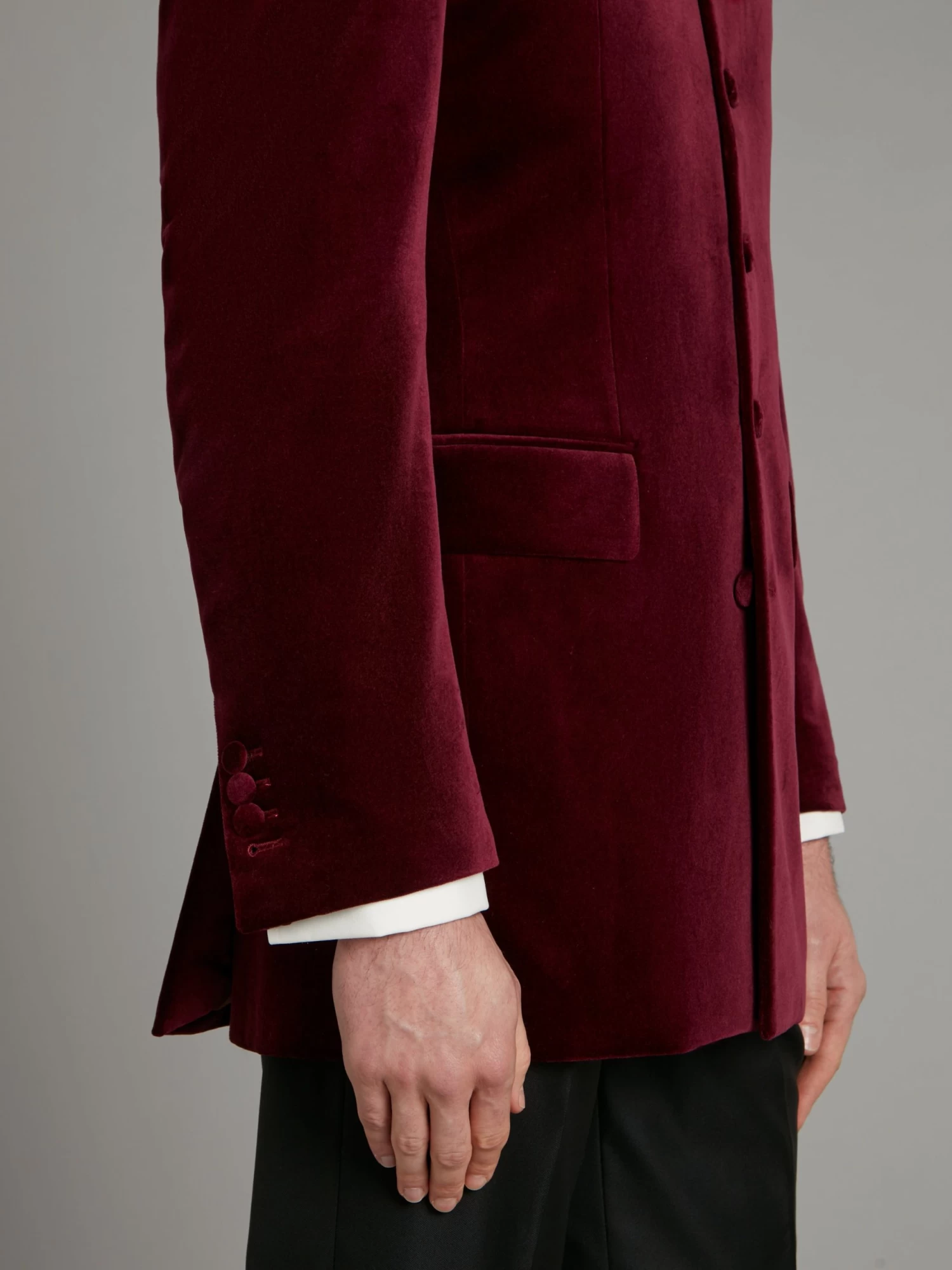 Crafted with a rich burgundy velvet and mandarin collar, the Ormonde Smoking Jacket provides a unique twist on traditional styles. Opt for this piece to add a touch of unconventional elegance to your evening ensemble. This jacket is expertly tailored from our signature ‘Ormonde’ design, for a timeless and fitted silhouette with structured shoulders.