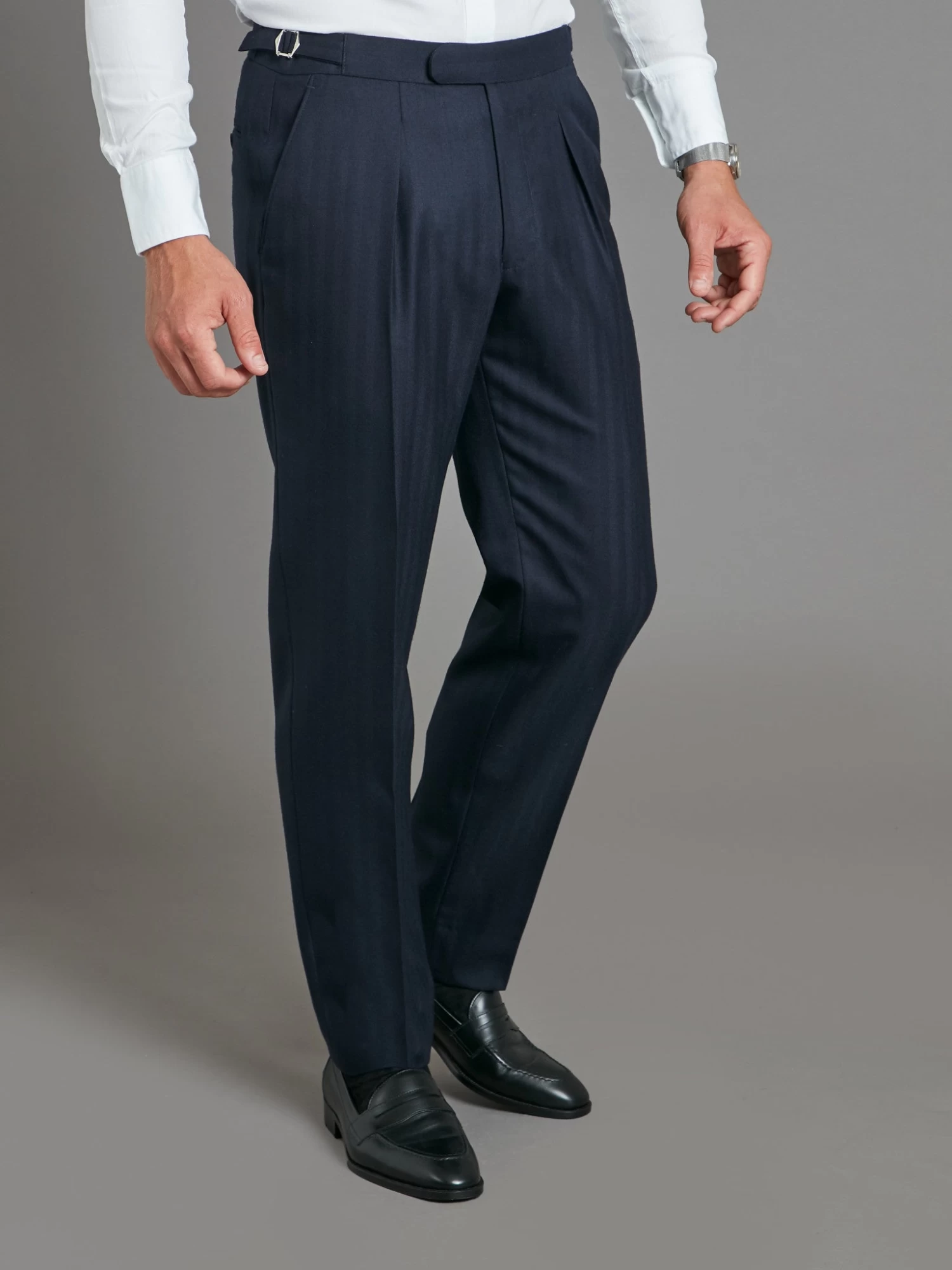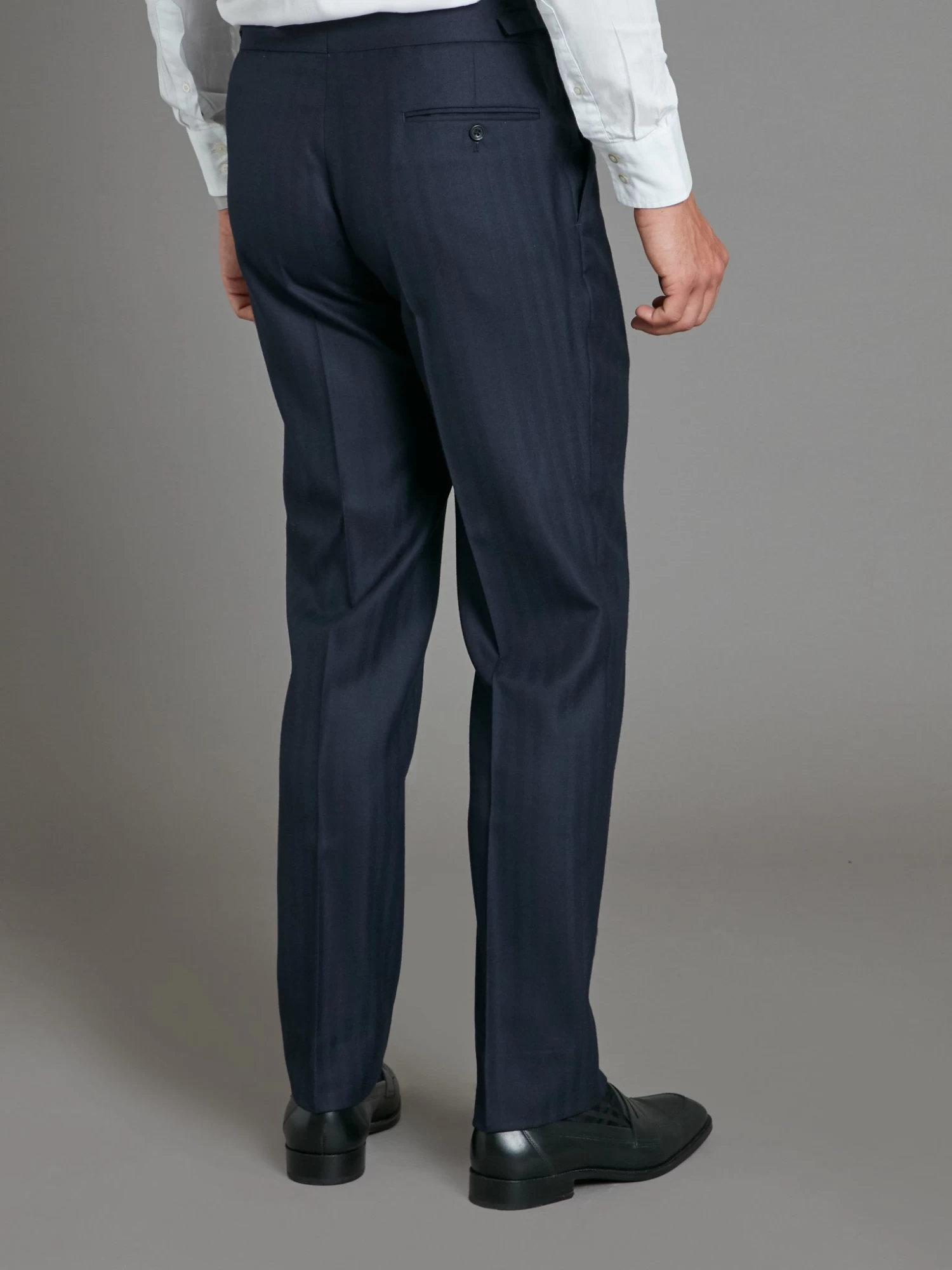 These classic suit trousers, in navy herringbone, are crafted from pure wool with a regular fit, single pleat front, side adjusters, and internal brace buttons. The trousers are unfinished but can be hemmed for an additional charge.